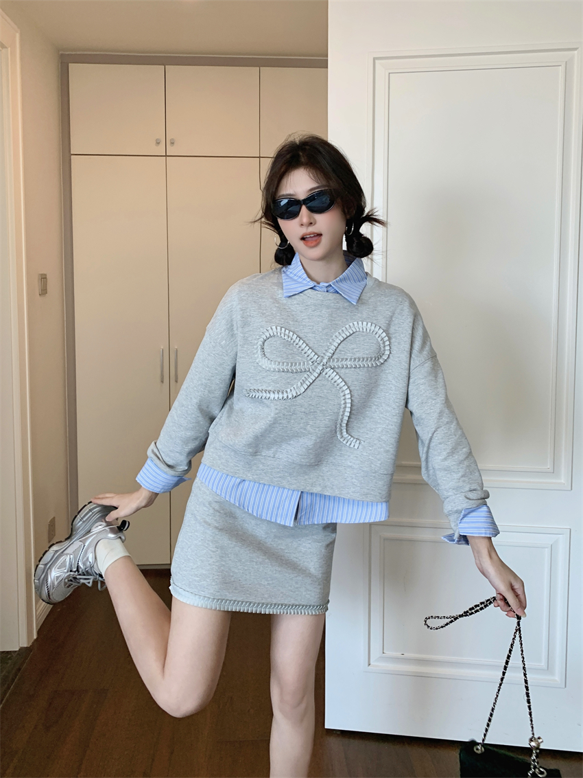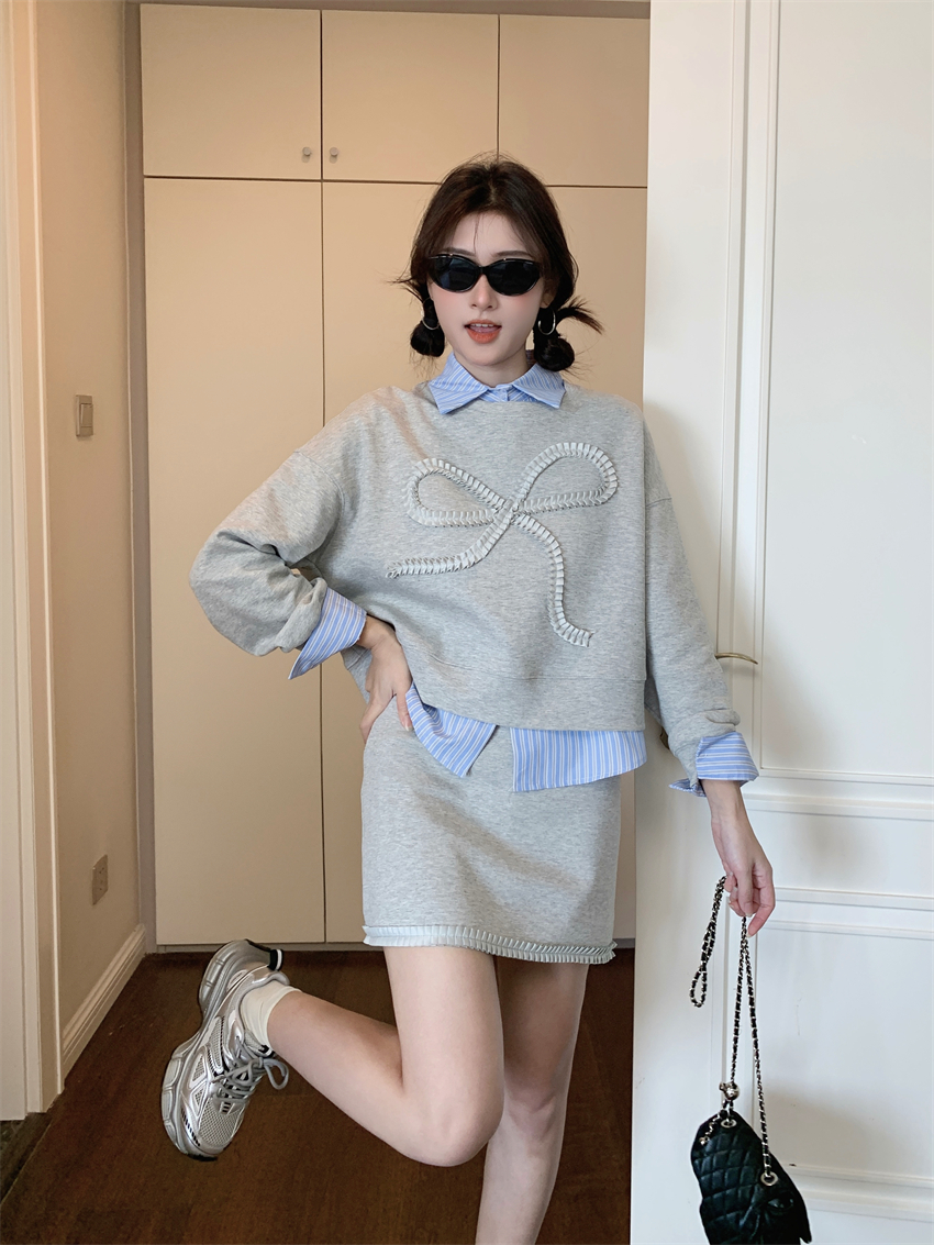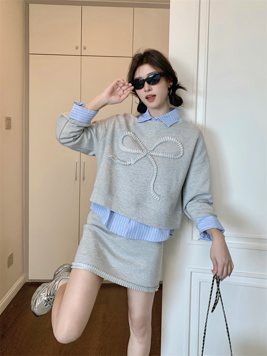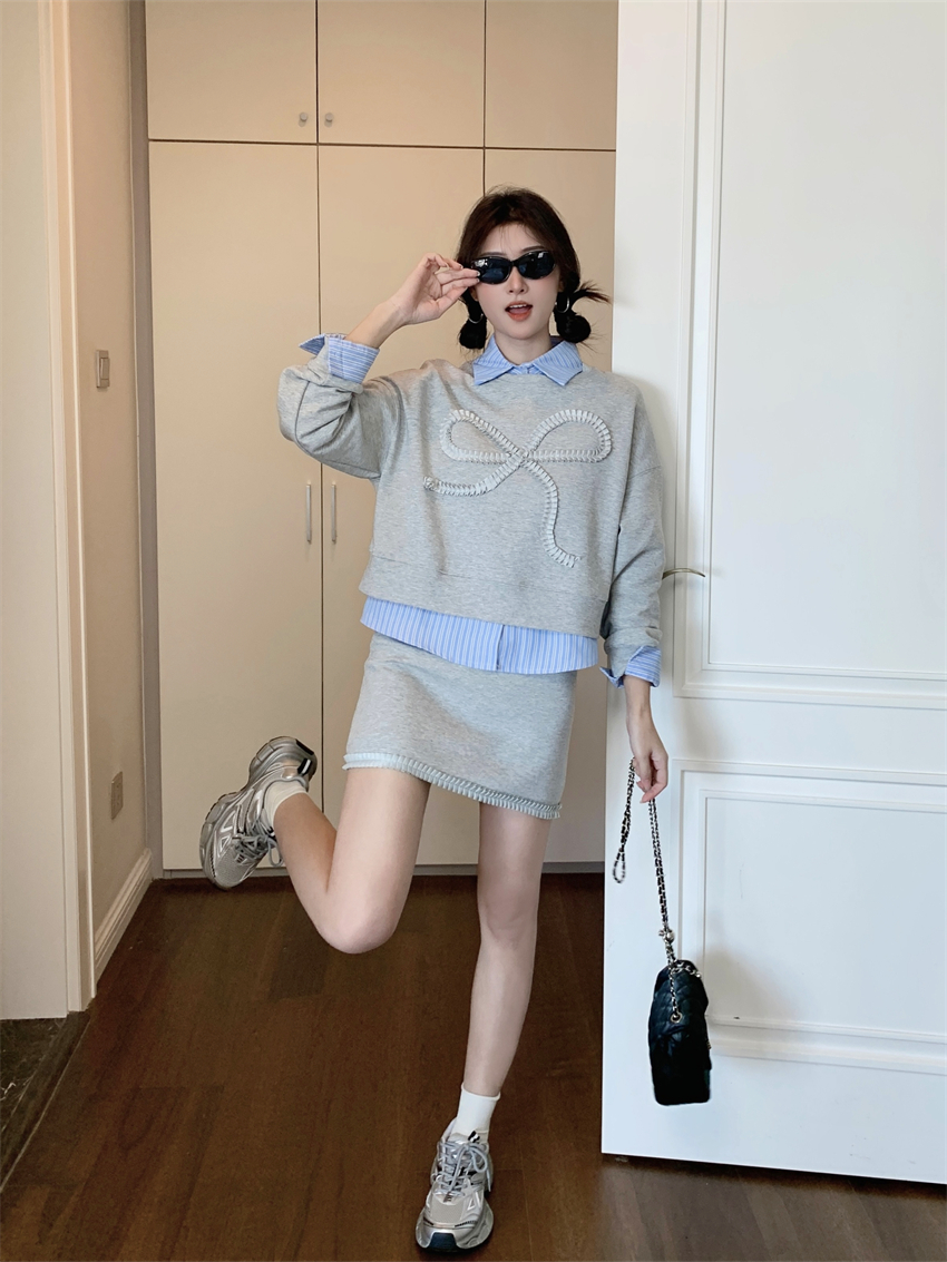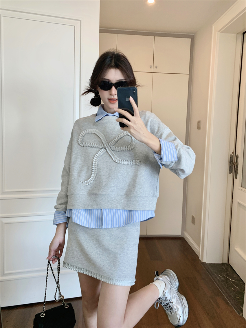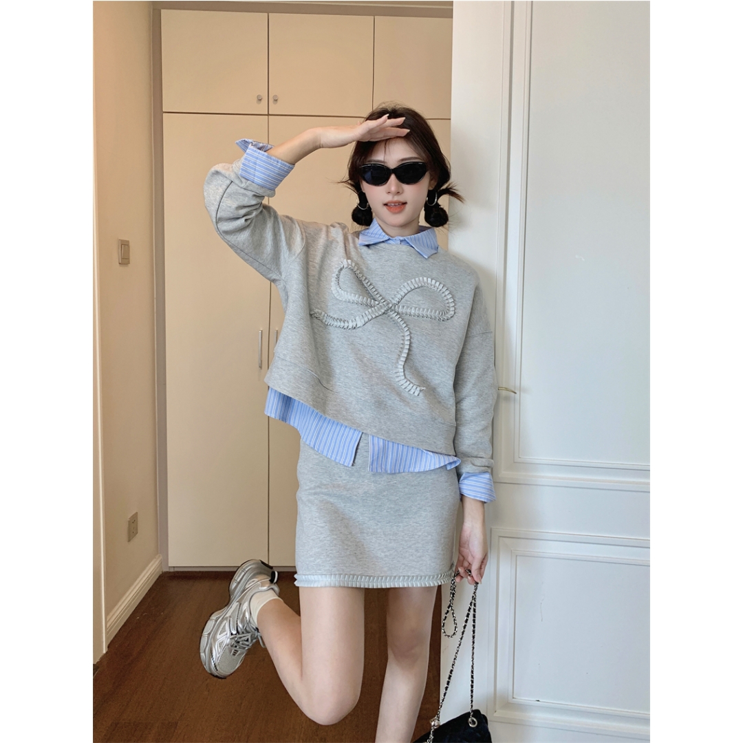 首页 > 女装批发-秋冬款 > 长袖套装 > MY15276# 新款叠穿短款卫衣条纹衬衫2025时尚两件套装女女裝貨源服裝批發