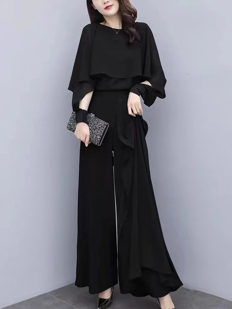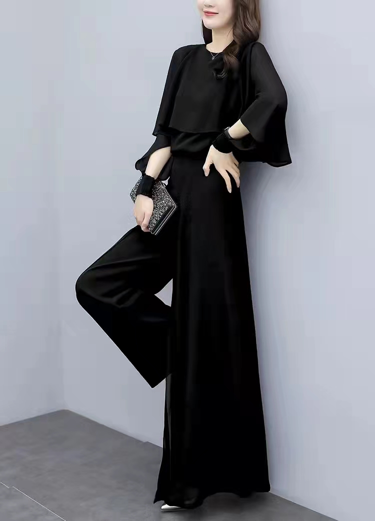 MY15337# 大码洋气雪纺衫两件套胖妹妹时尚减龄显瘦垂感阔腿裤套装女女裝貨源服裝批發
