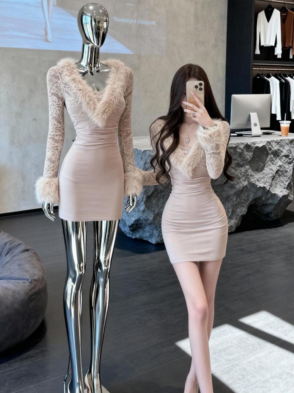 MY15343# 夜场衣服v领加绒加厚粉色打底裙子修身褶皱包臀连衣裙女秋冬...