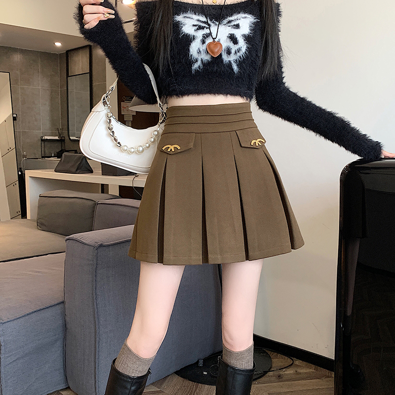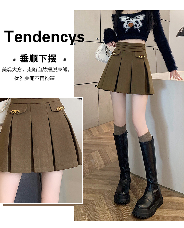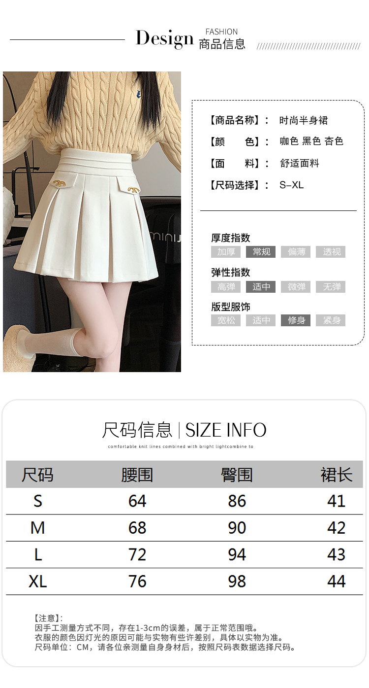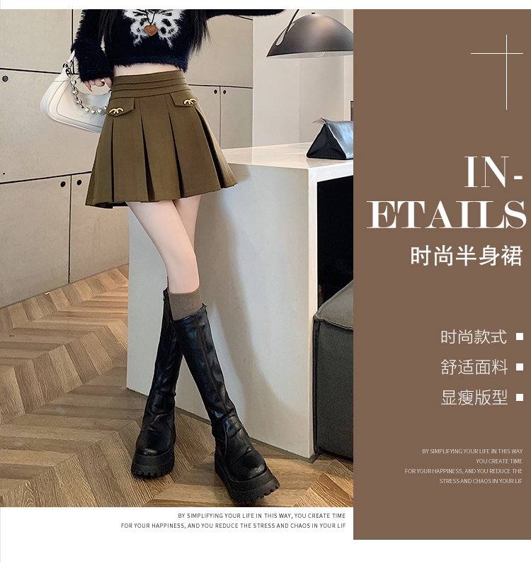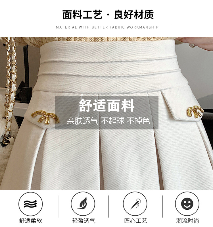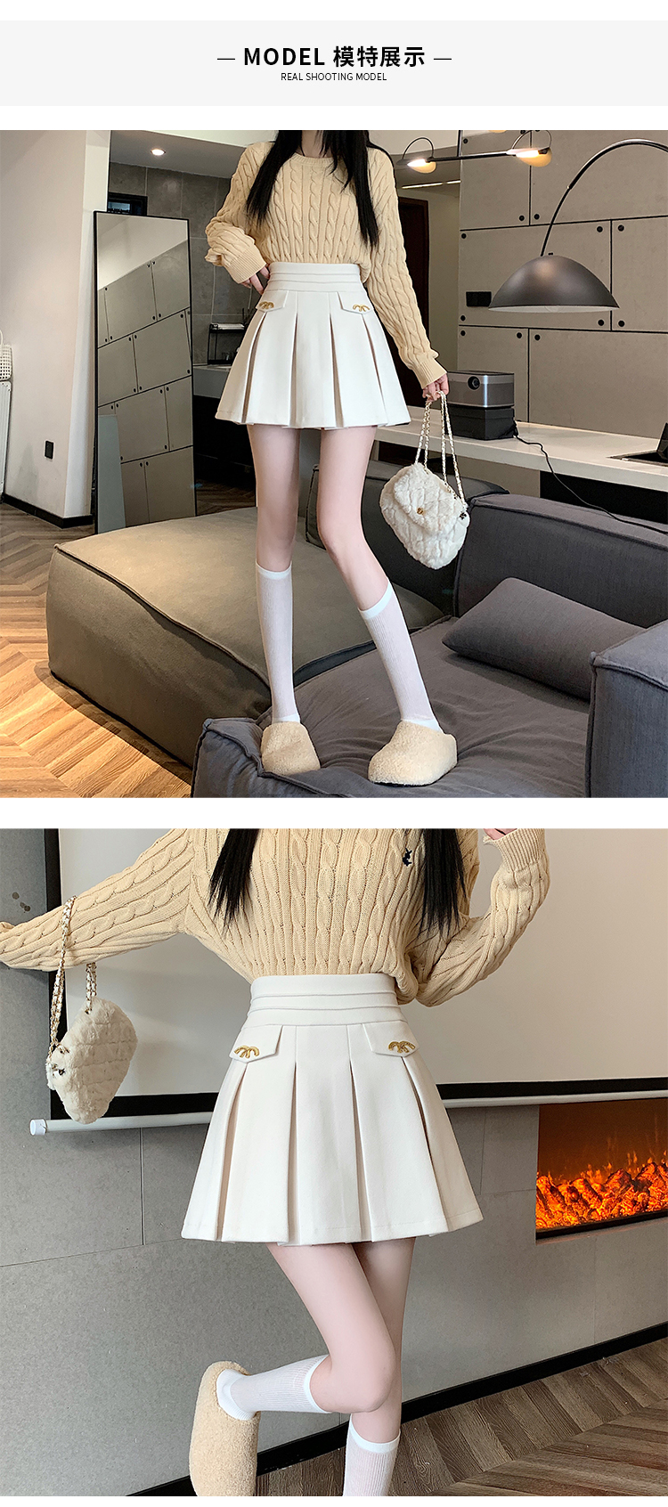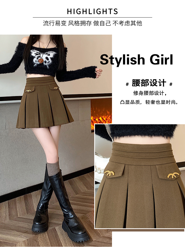 MY15351# 新款韩系小香风A字半身裙时尚M扣高腰显瘦毛呢百褶裙女裝貨源服裝批發