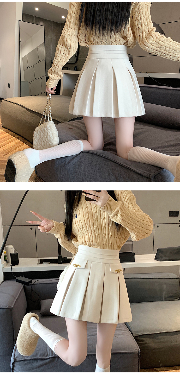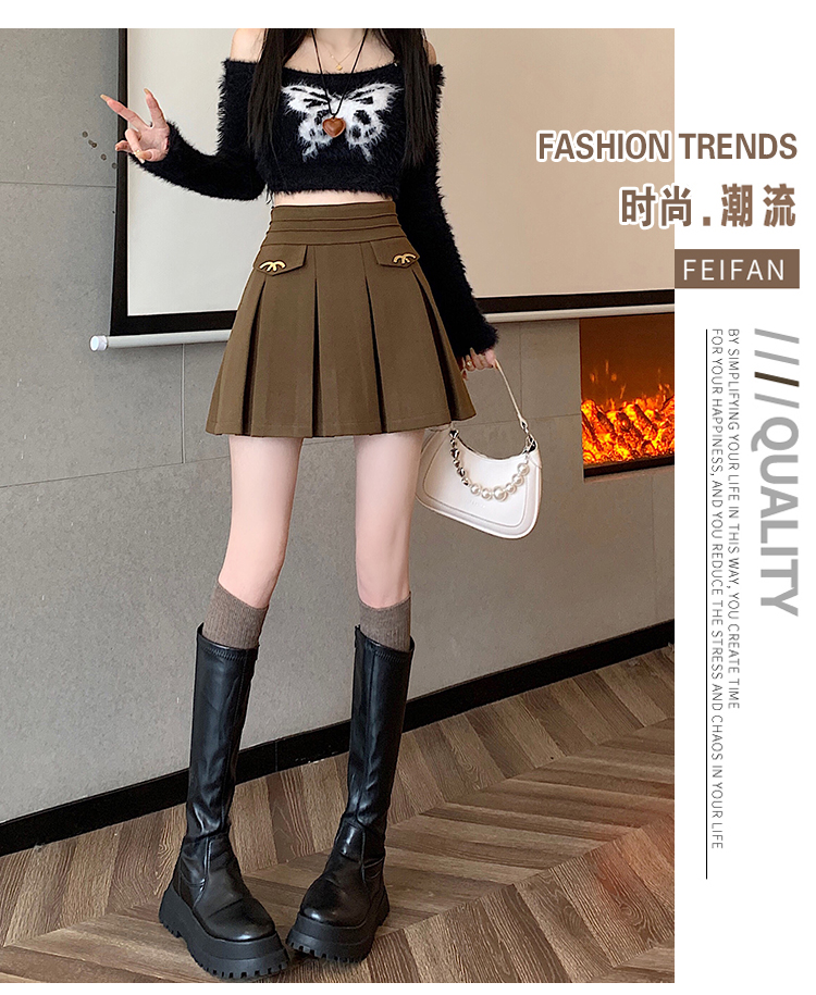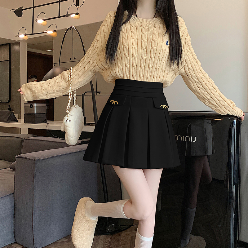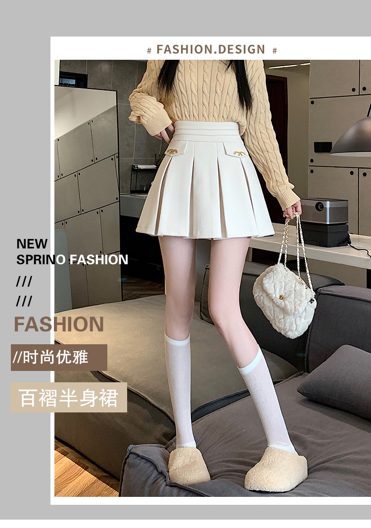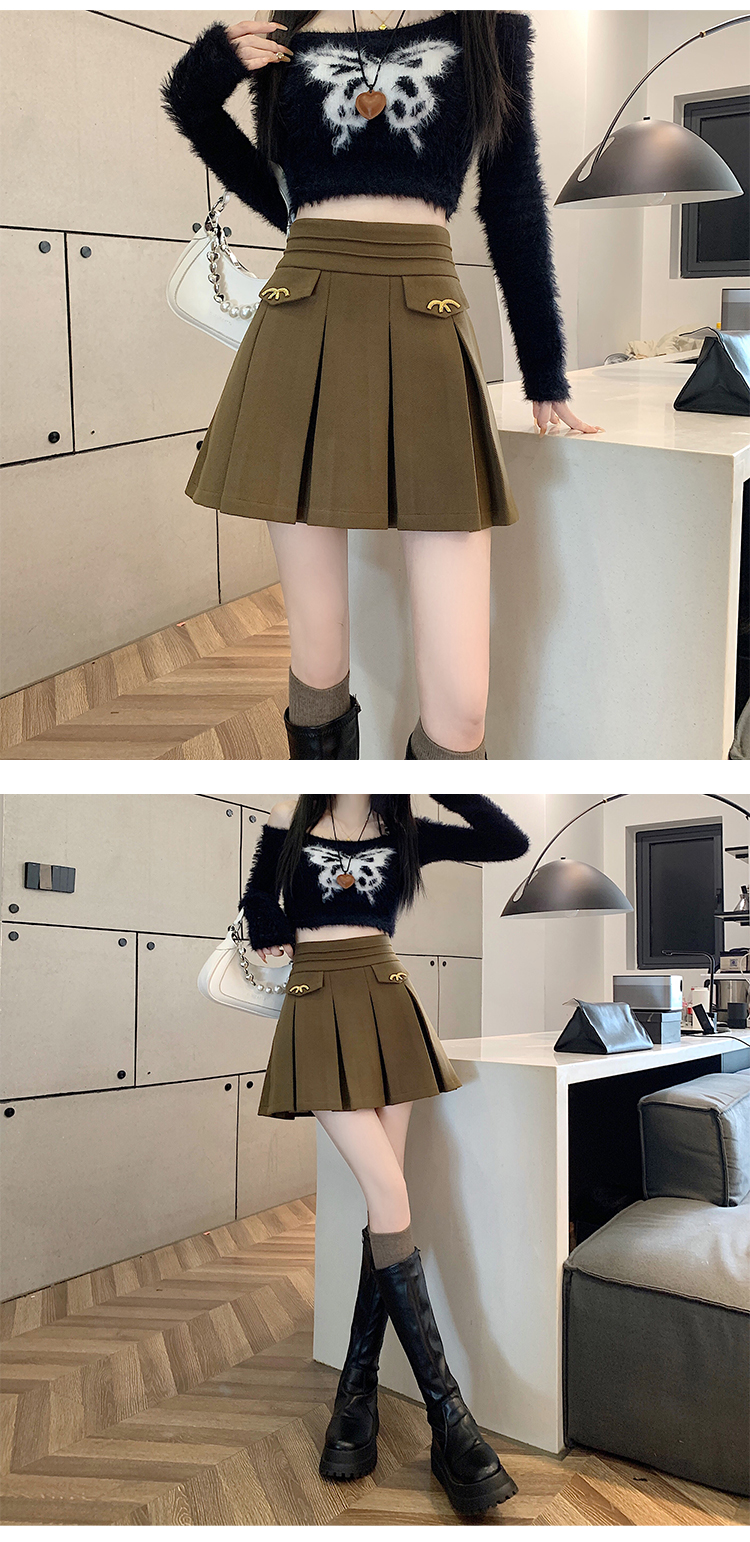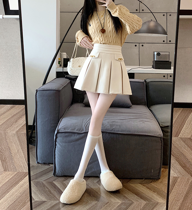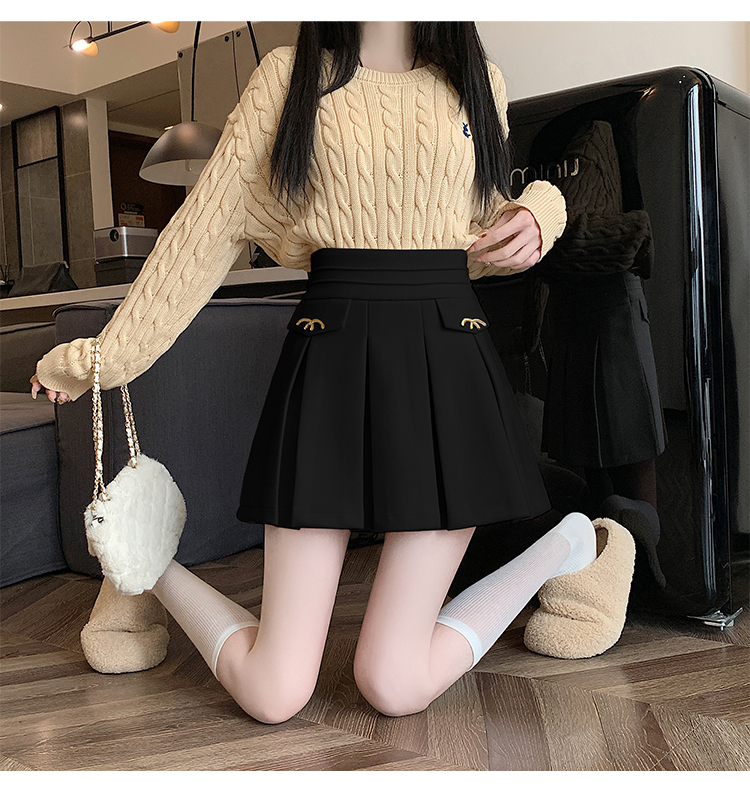 MY15351# 新款韩系小香风A字半身裙时尚M扣高腰显瘦毛呢百褶裙女裝貨源服裝批發