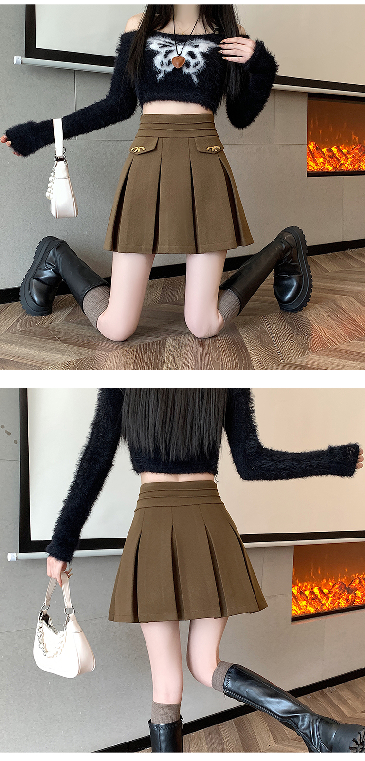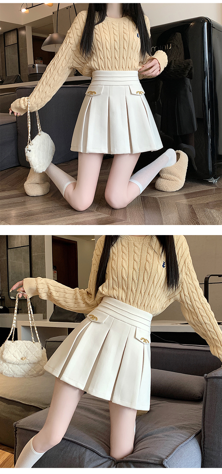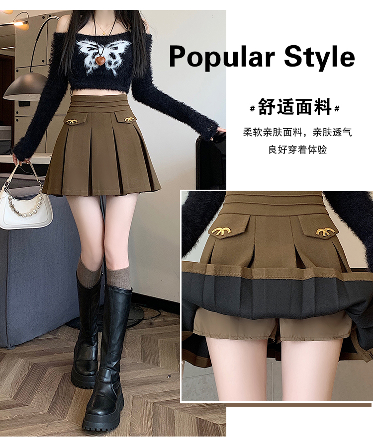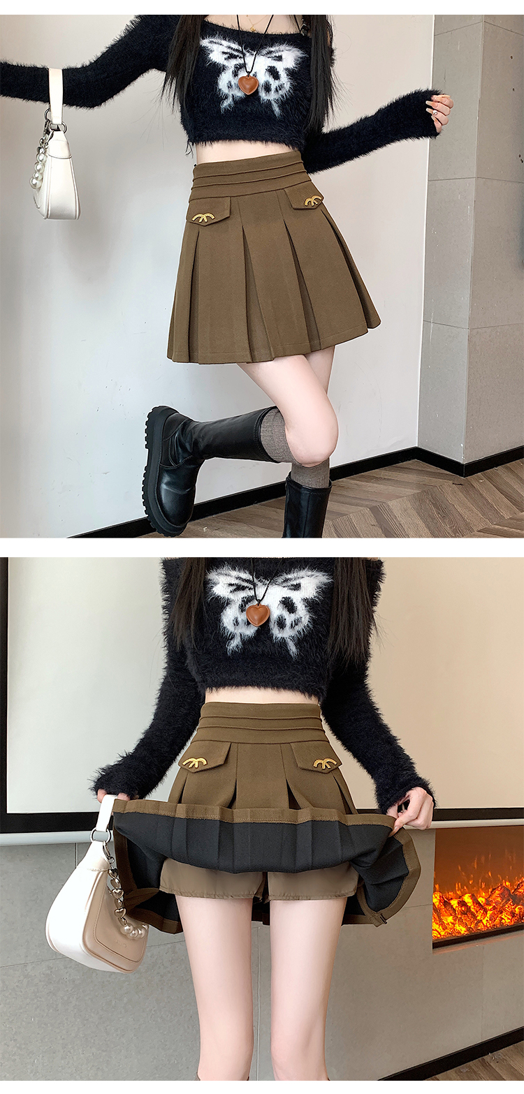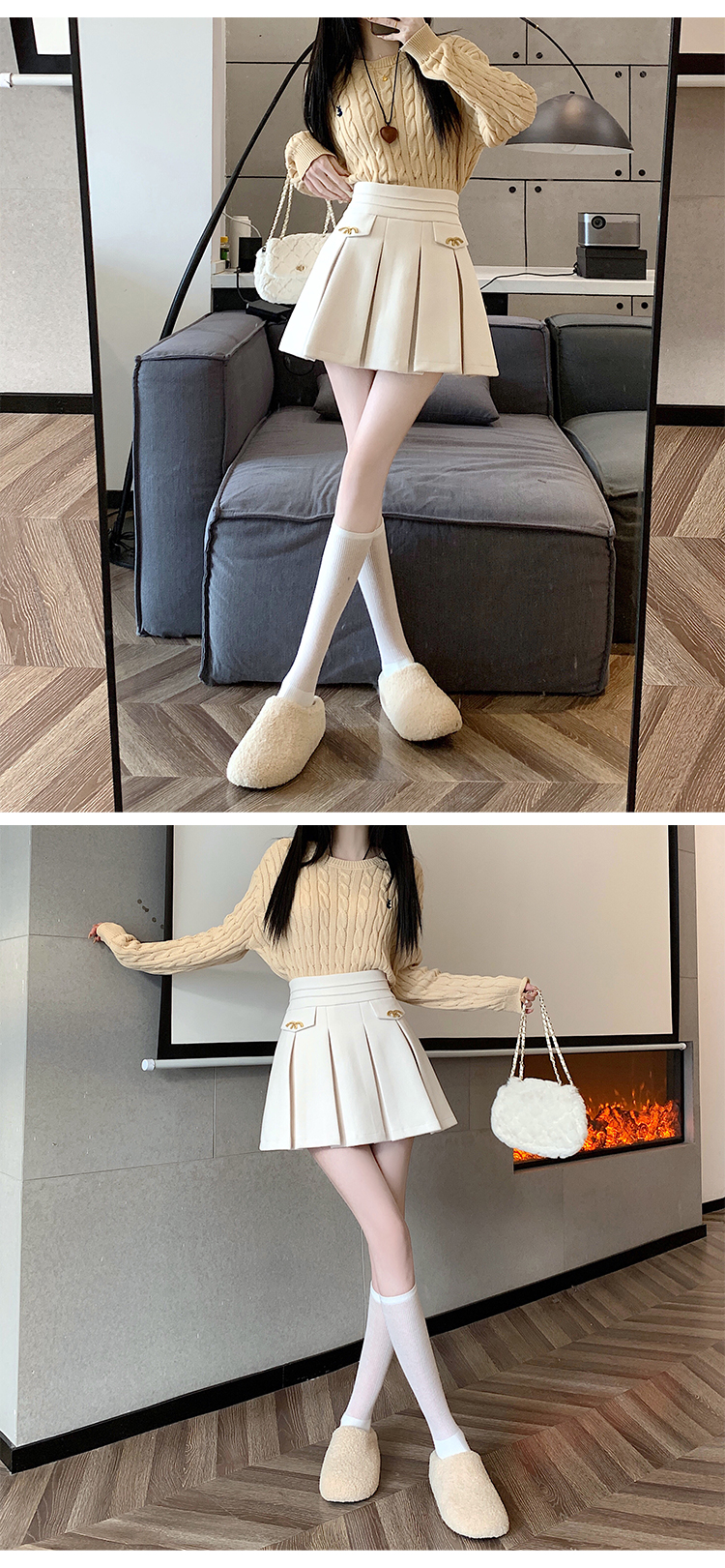 MY15351# 新款韩系小香风A字半身裙时尚M扣高腰显瘦毛呢百褶裙女裝貨源服裝批發