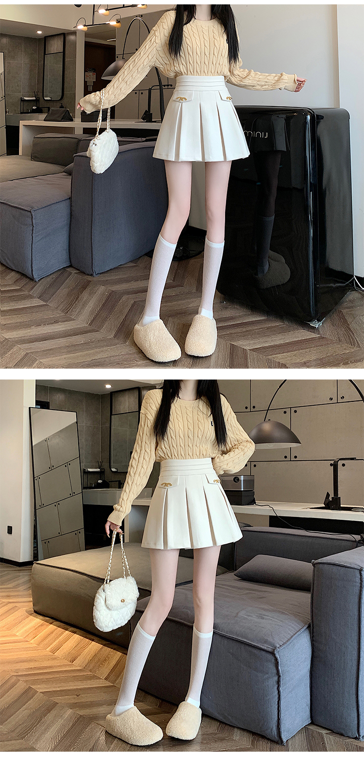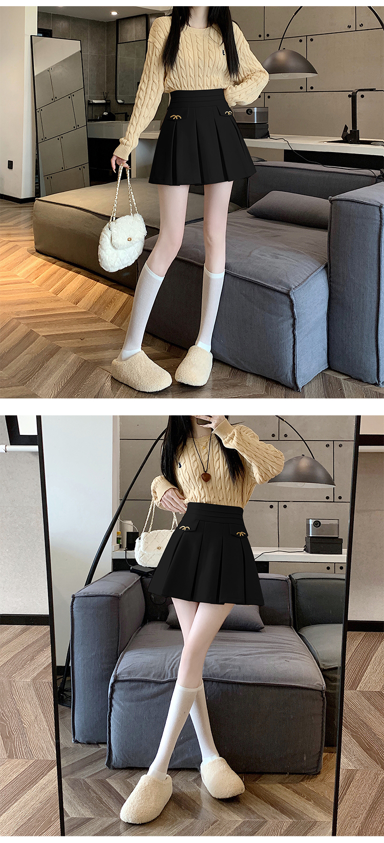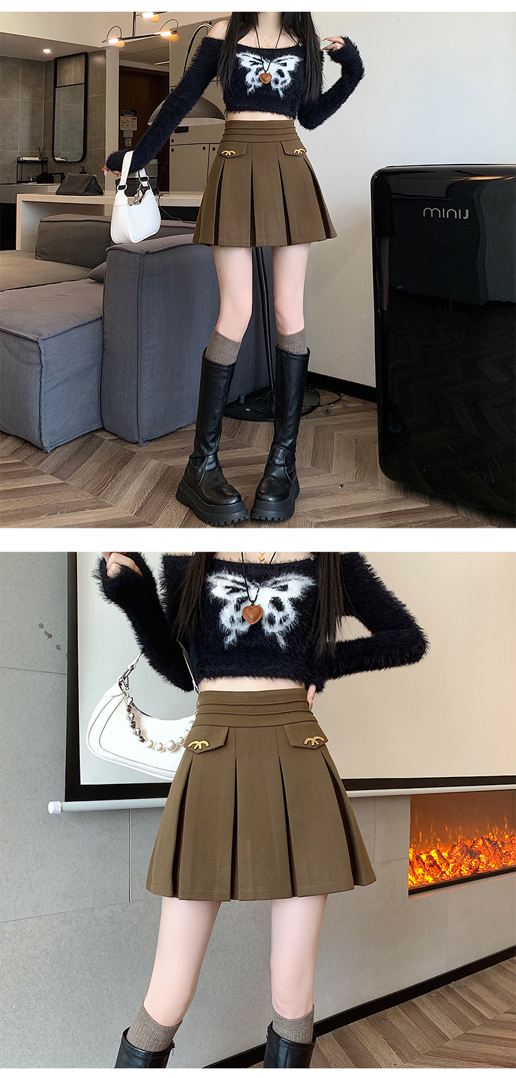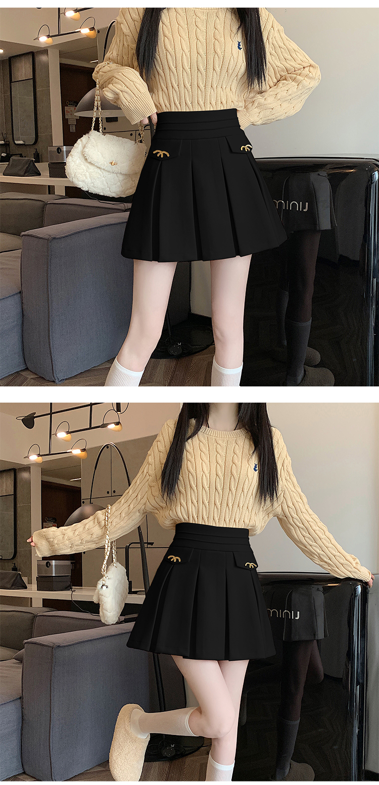 MY15351# 新款韩系小香风A字半身裙时尚M扣高腰显瘦毛呢百褶裙女裝貨源服裝批發