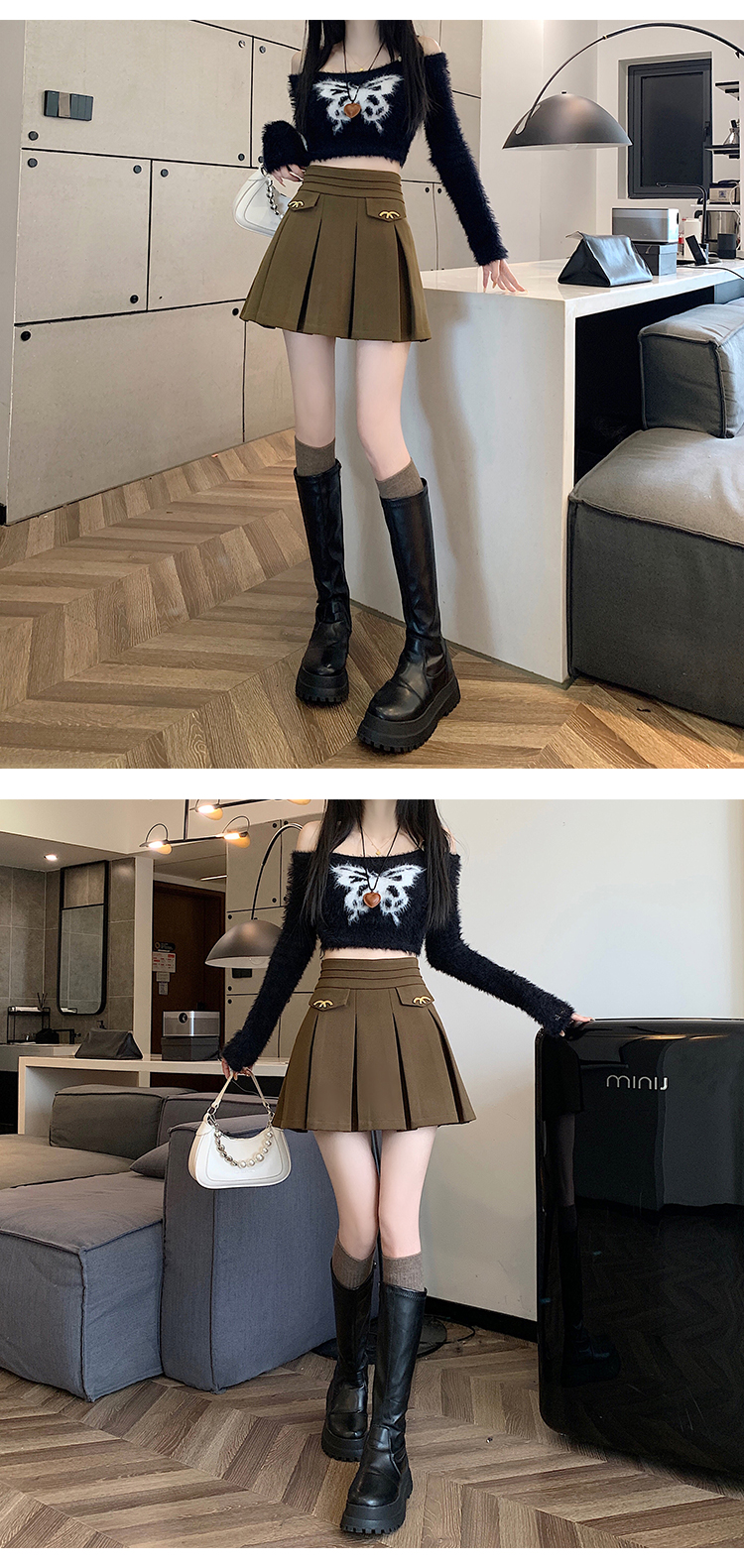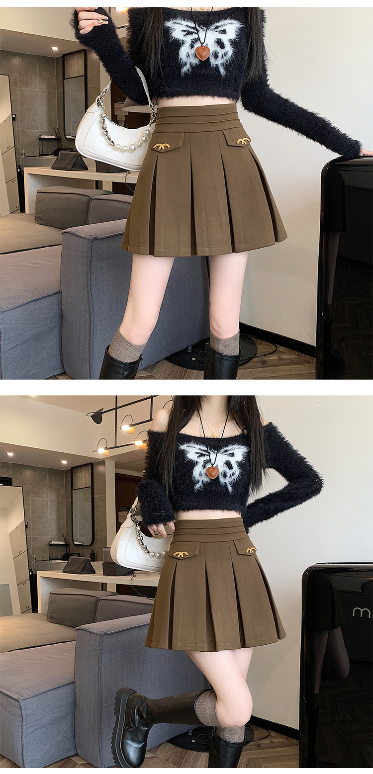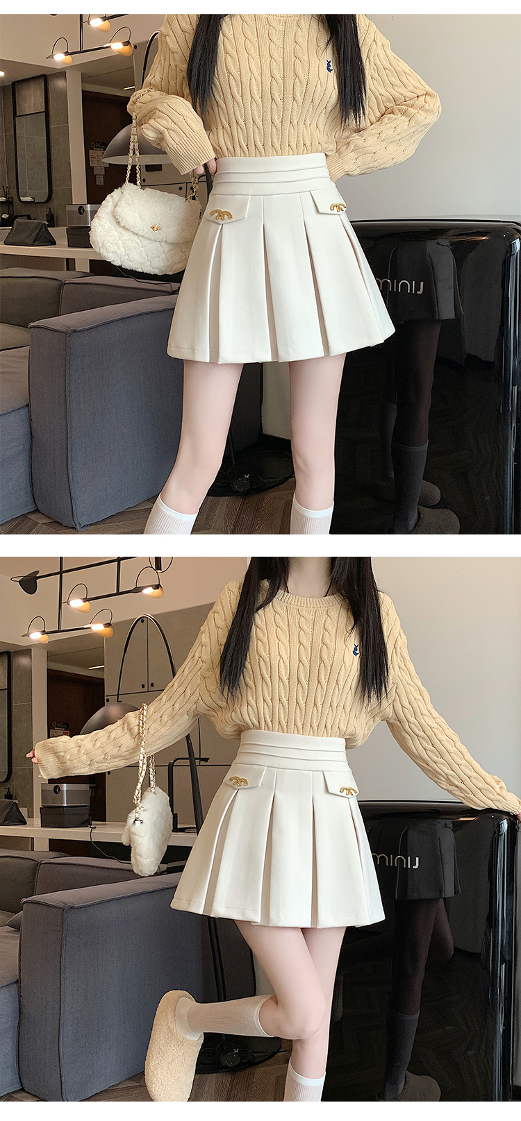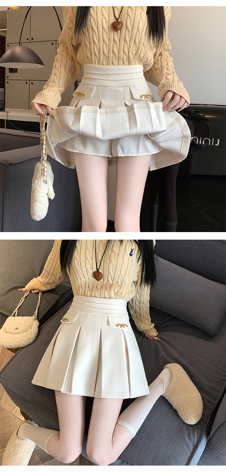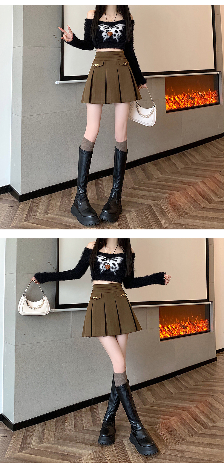 MY15351# 新款韩系小香风A字半身裙时尚M扣高腰显瘦毛呢百褶裙女裝貨源服裝批發