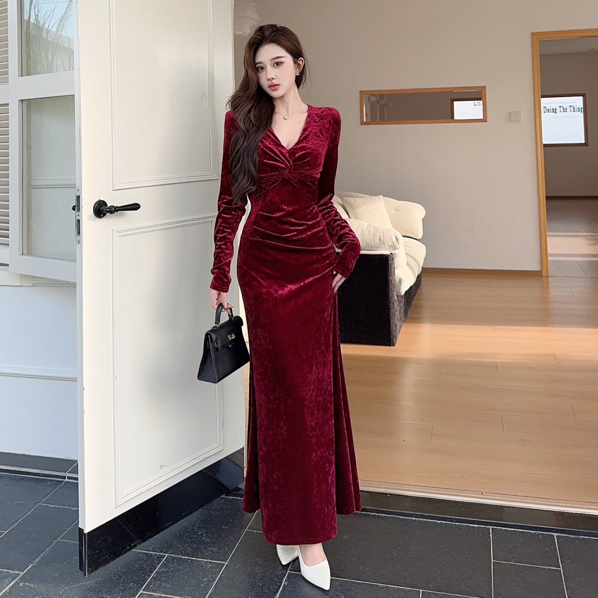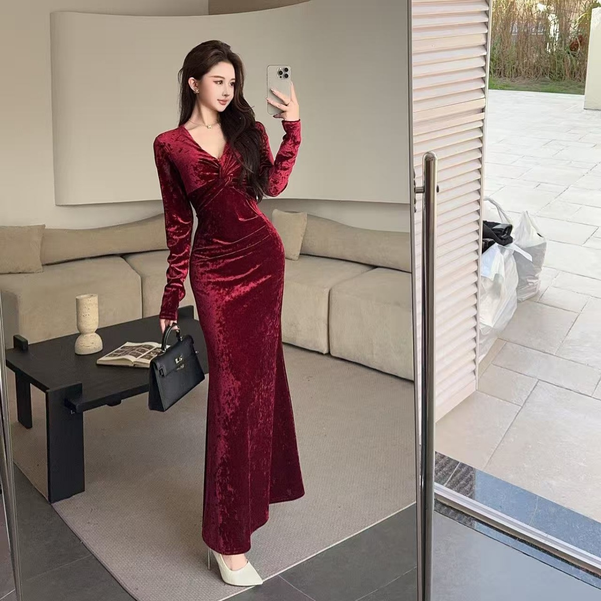 MY15364# 法式女人味V领显瘦鱼尾优雅紧身丝绒生日年会礼服连衣裙女裝貨源服裝批發