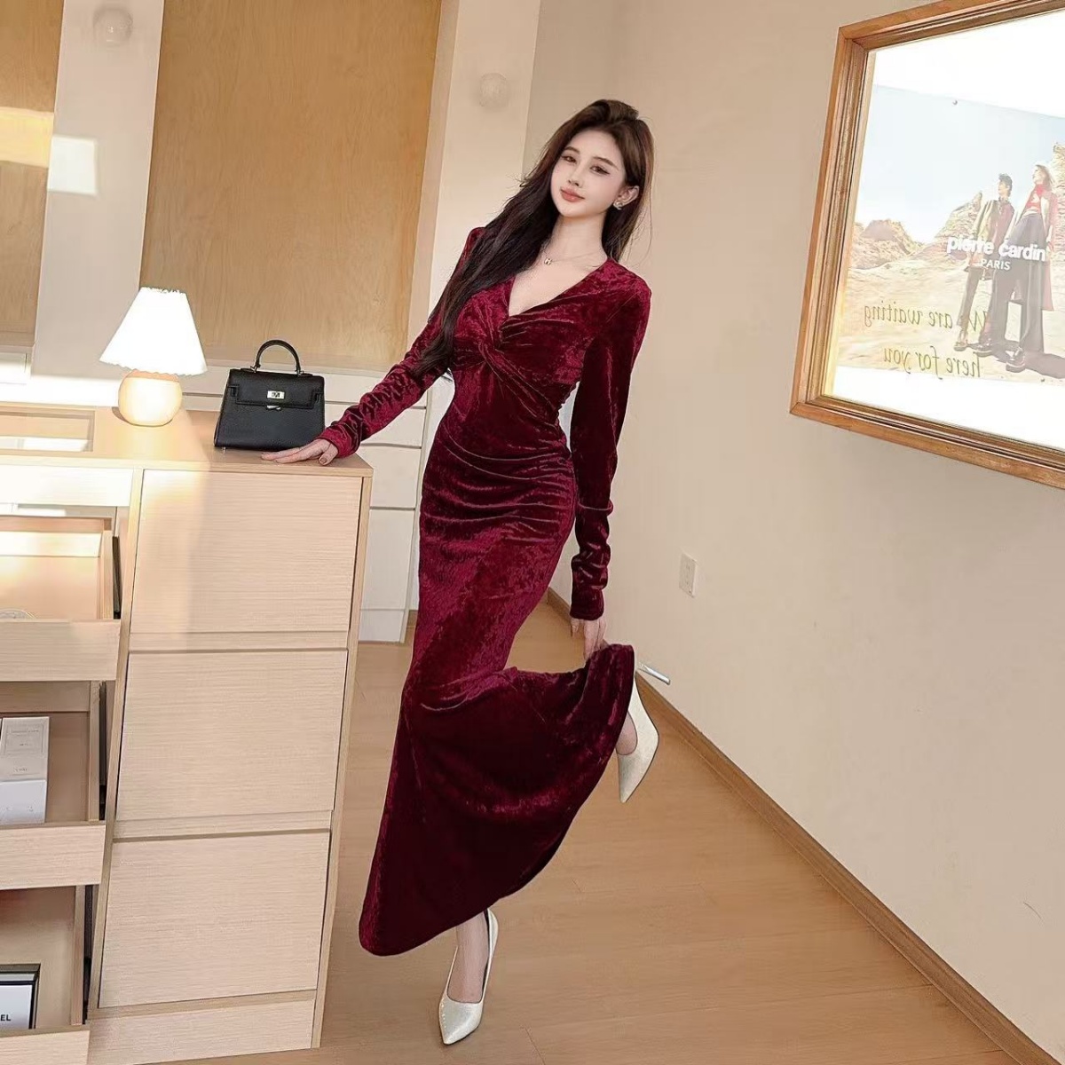 首页 > 女装批发-秋冬款 > 长袖连衣裙 > MY15364# 法式女人味V领显瘦鱼尾优雅紧身丝绒生日年会礼服连衣裙女裝貨源服裝批發