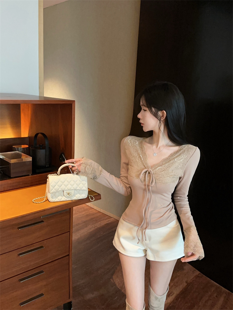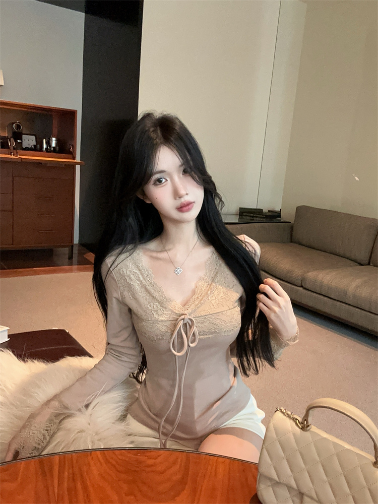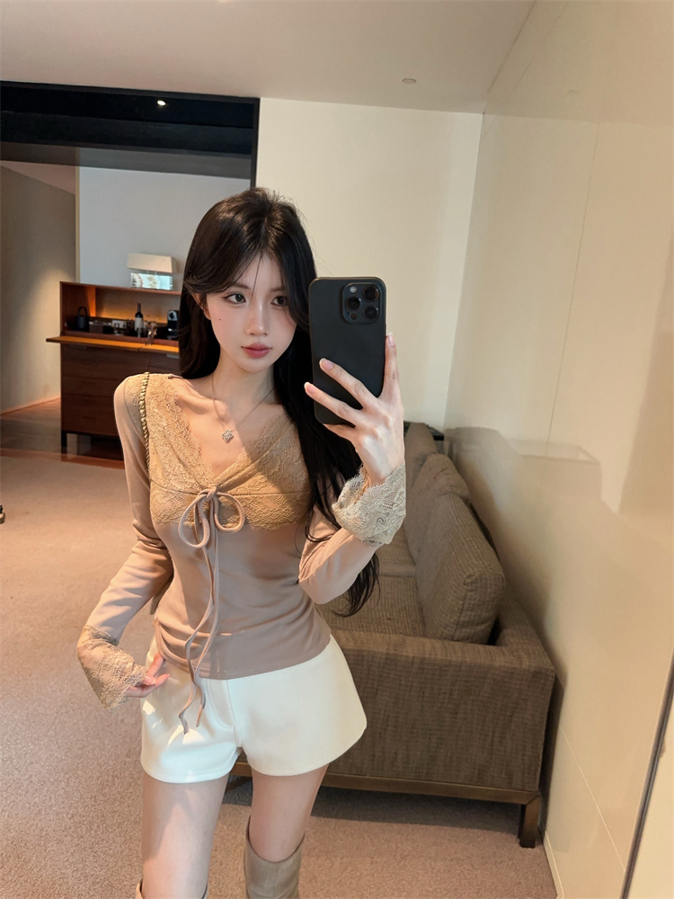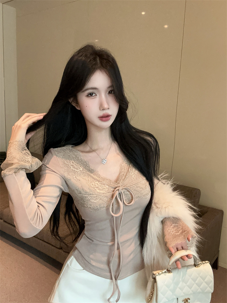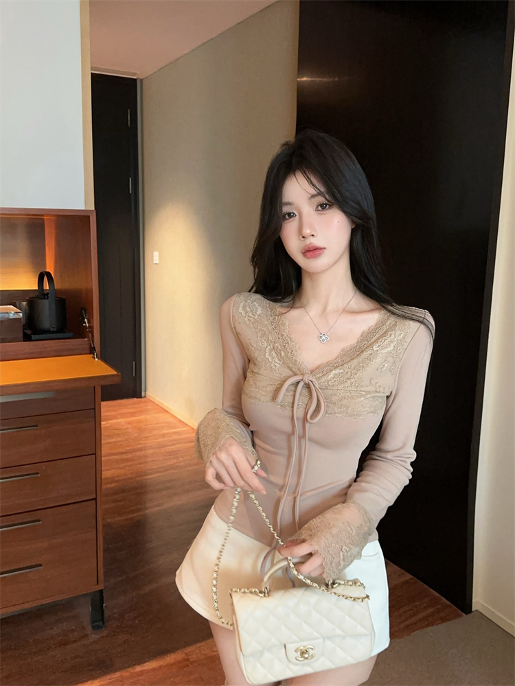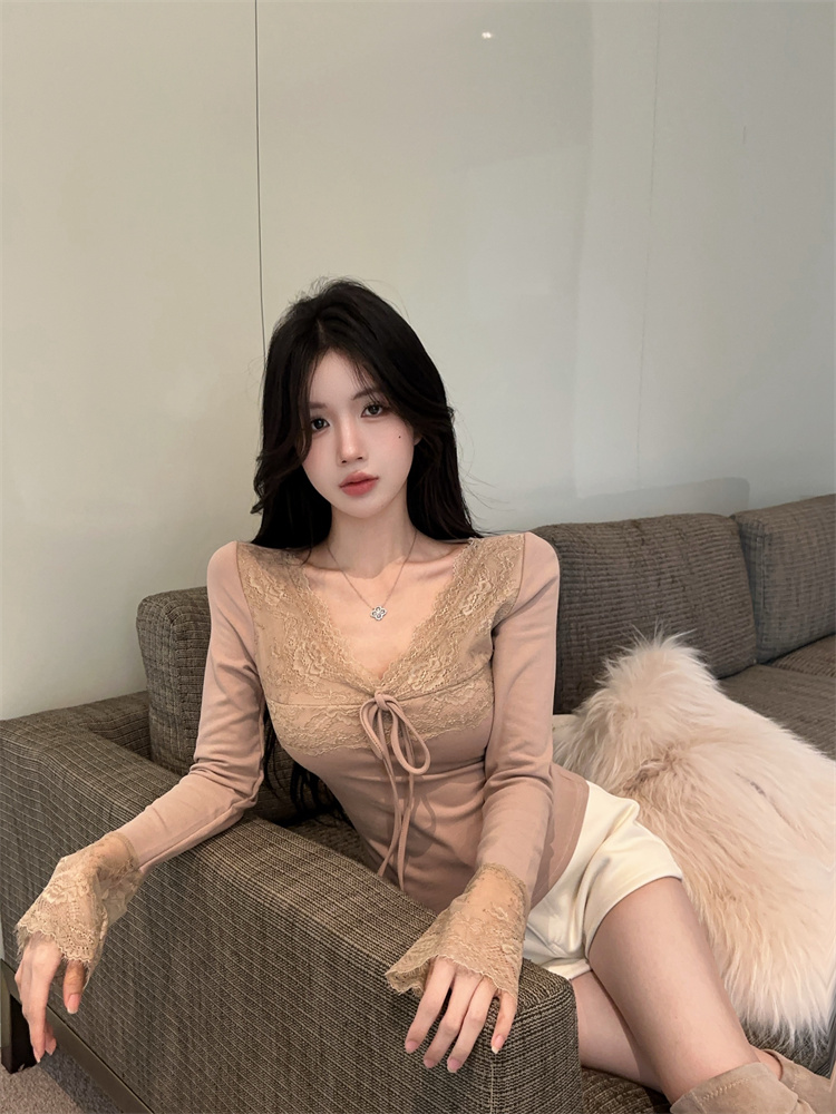 MY15371# 法式性感V领蕾丝拼接长袖系带小众辣妹修身喇叭袖上衣女裝貨源服裝批發