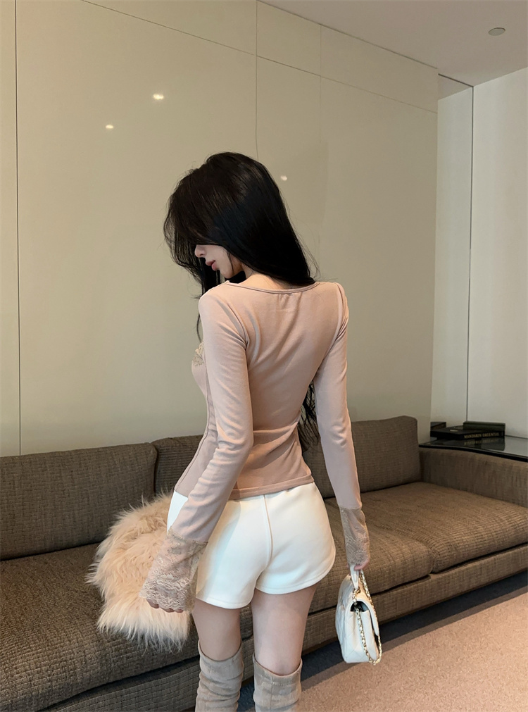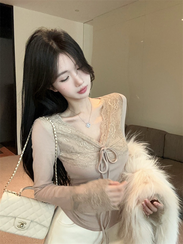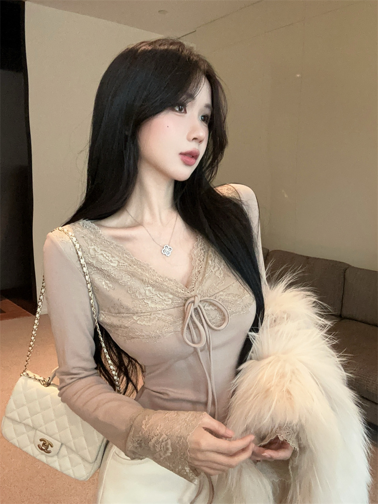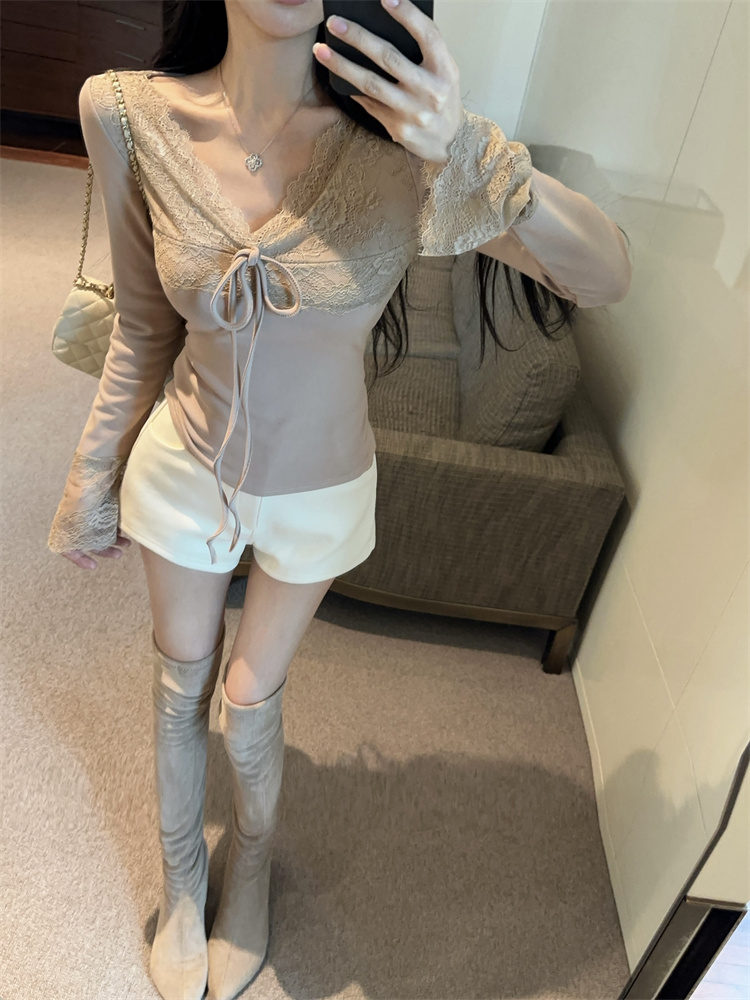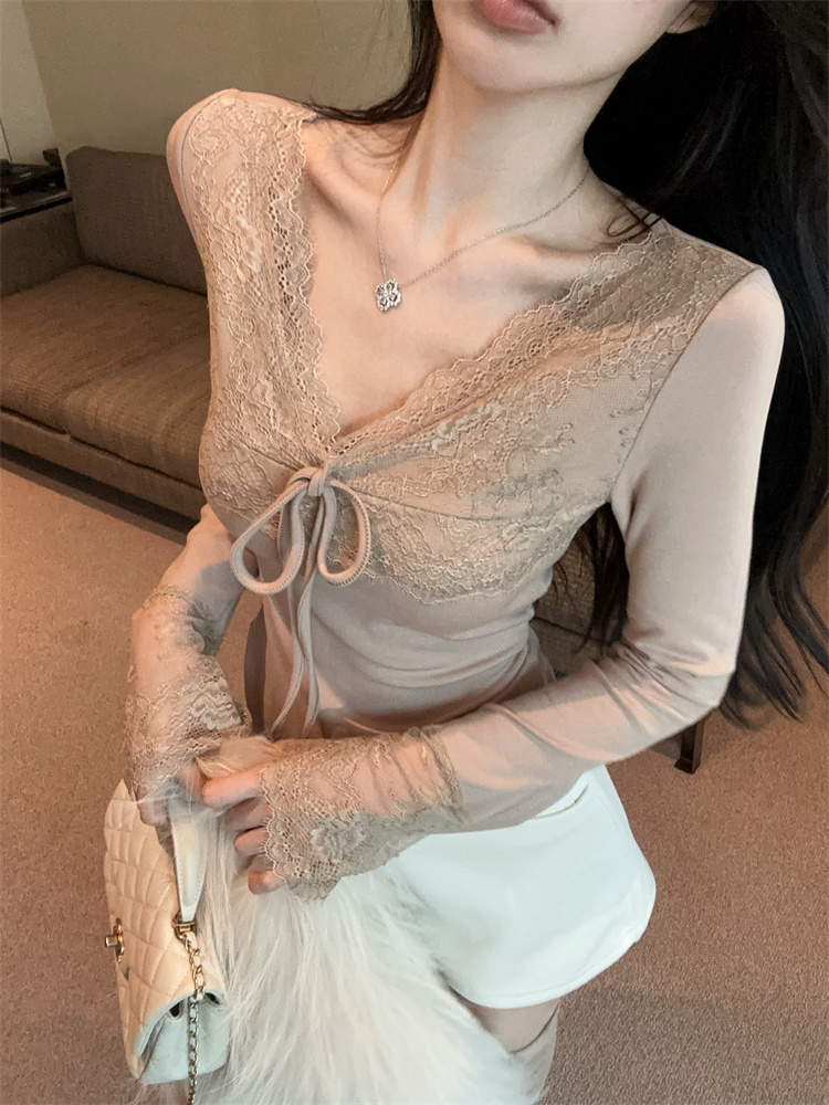 MY15371# 法式性感V领蕾丝拼接长袖系带小众辣妹修身喇叭袖上衣女裝貨源服裝批發