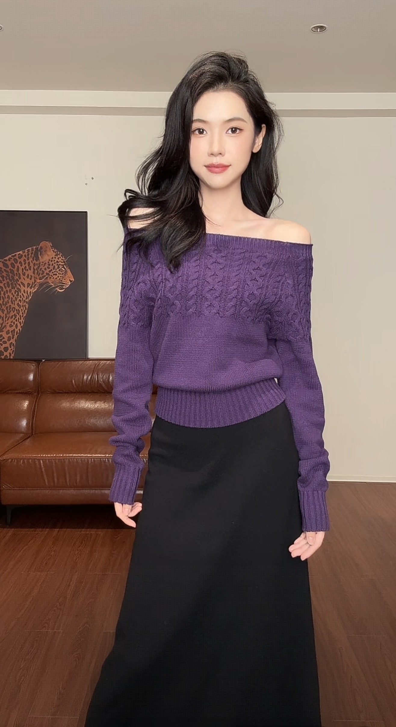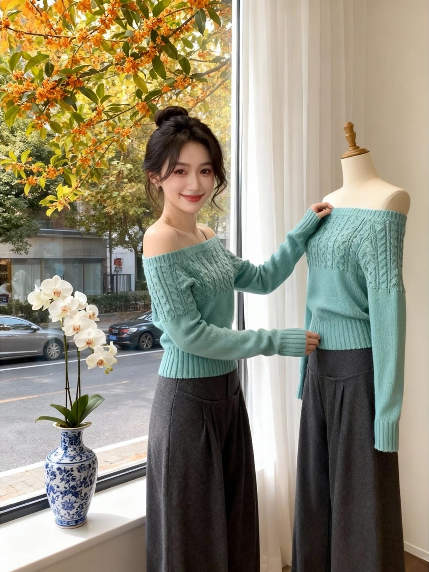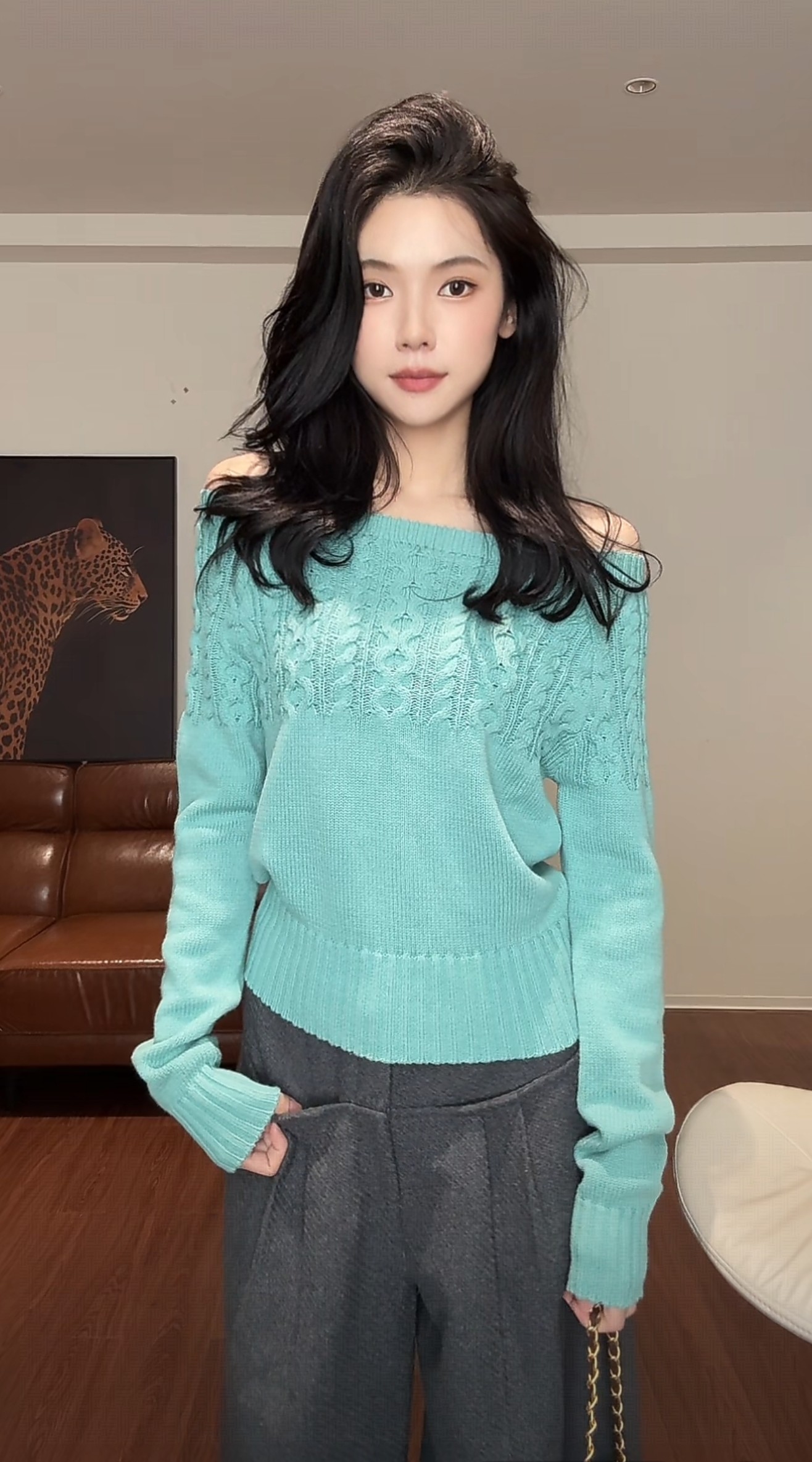MY15621# 绿色一字肩套头毛衣新款小众设计感宽松减龄内搭针织上衣潮女裝貨源服裝批發