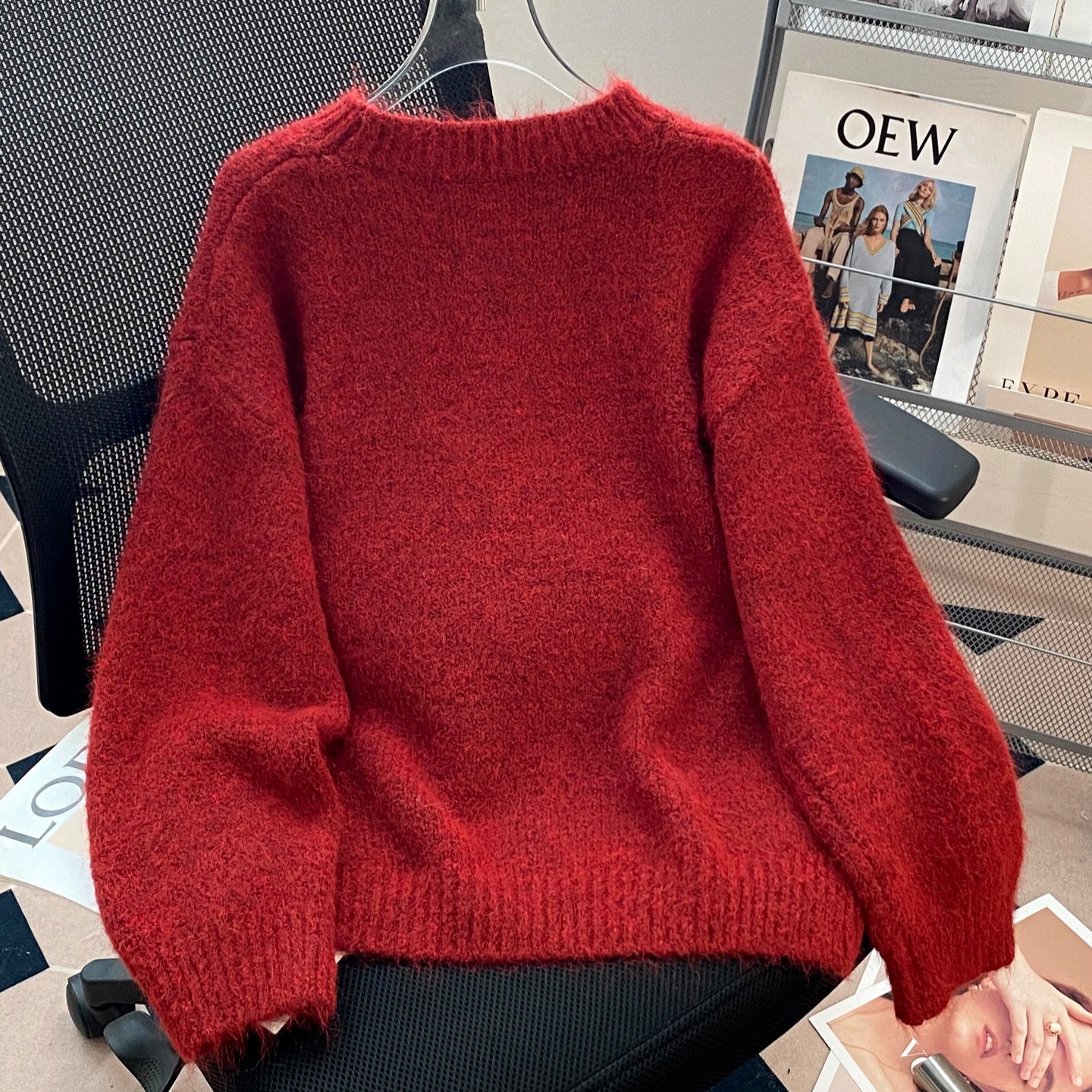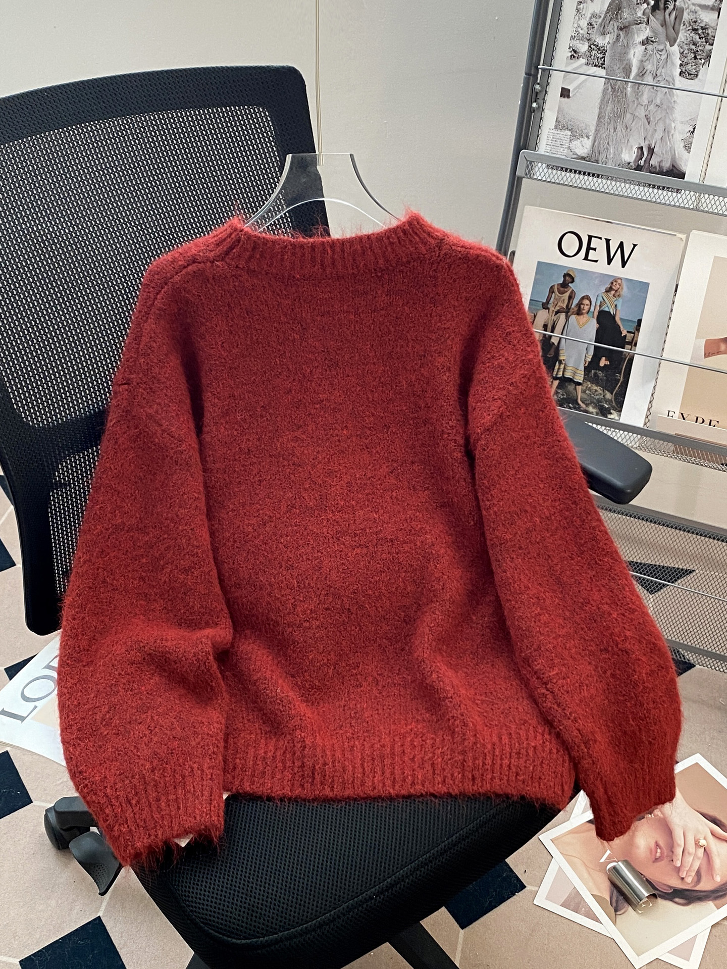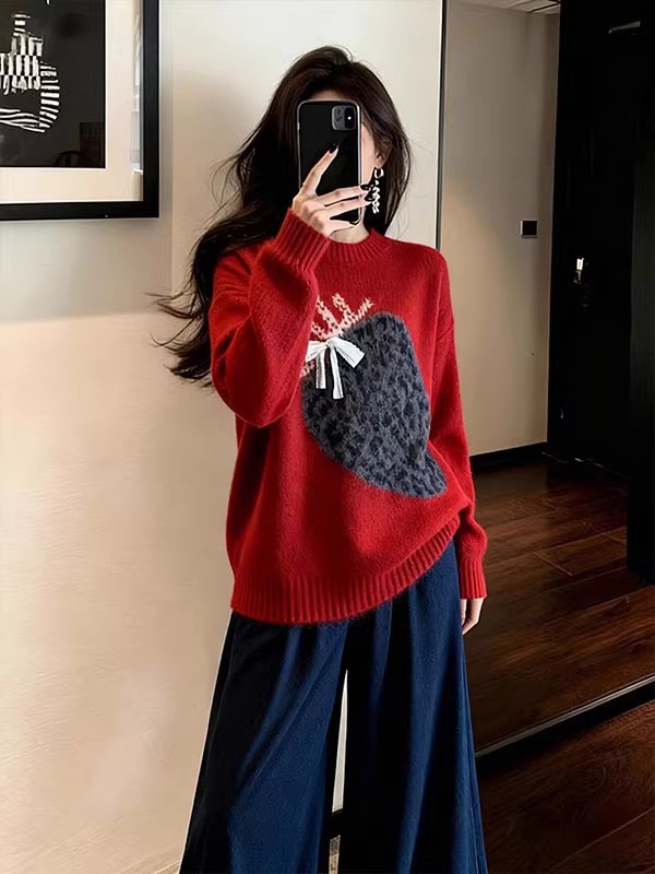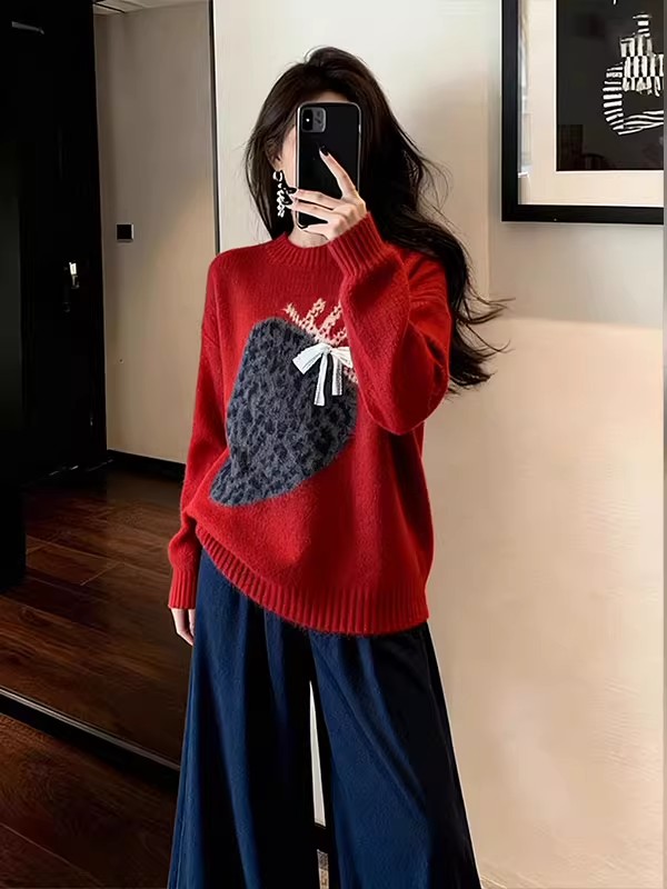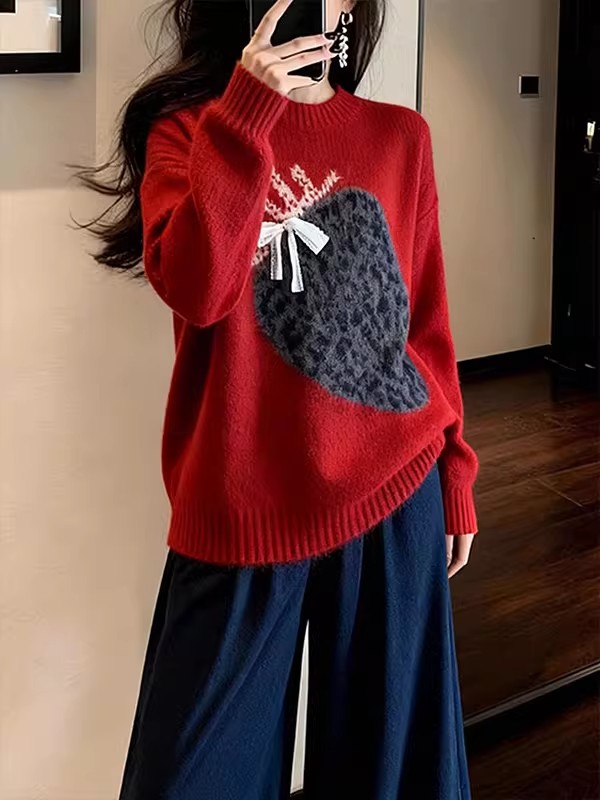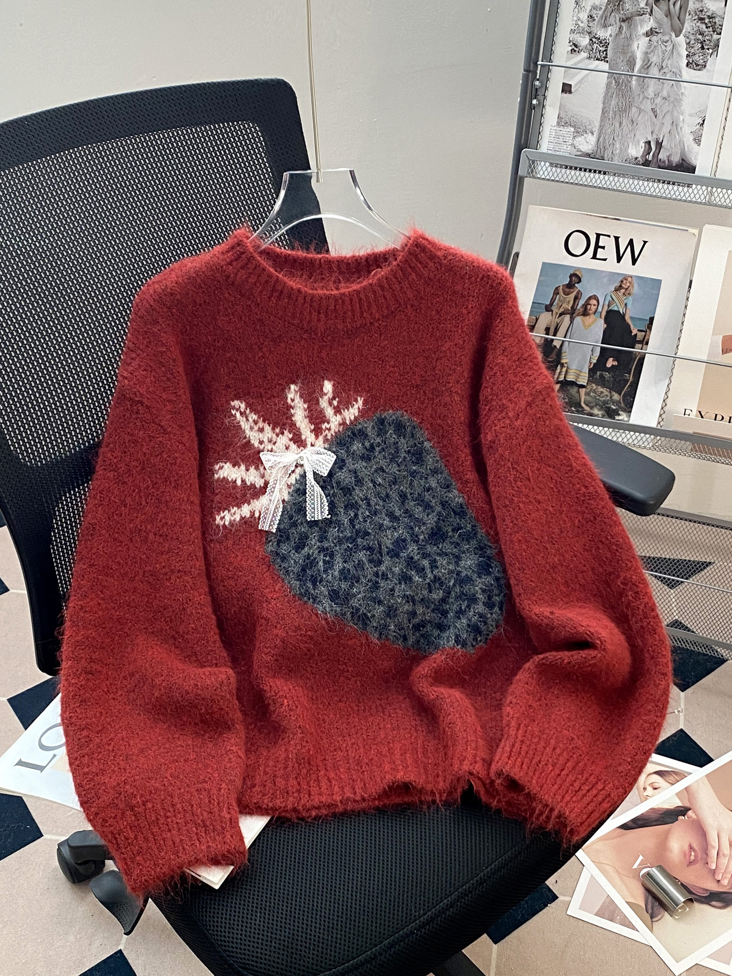 MY15625# 慵懒风红色草莓提花针织上衣新款休闲宽松中长款毛衣女裝貨源服裝批發
