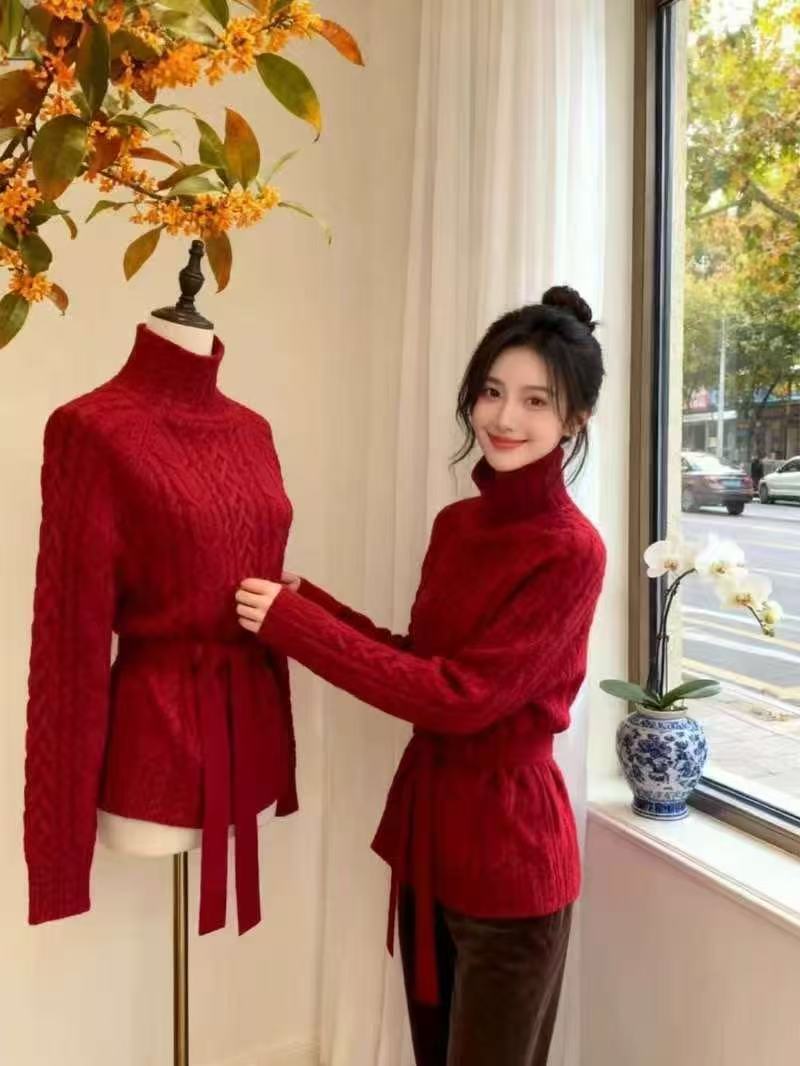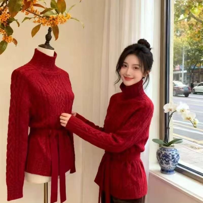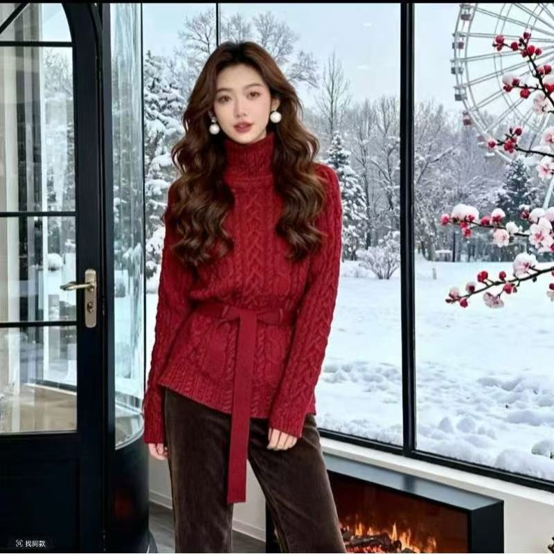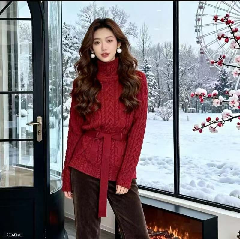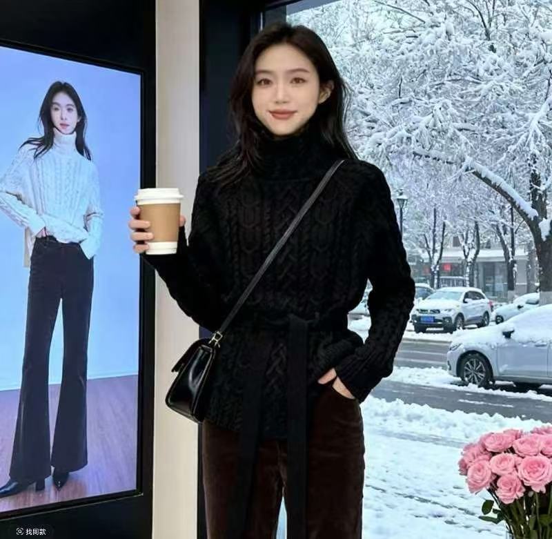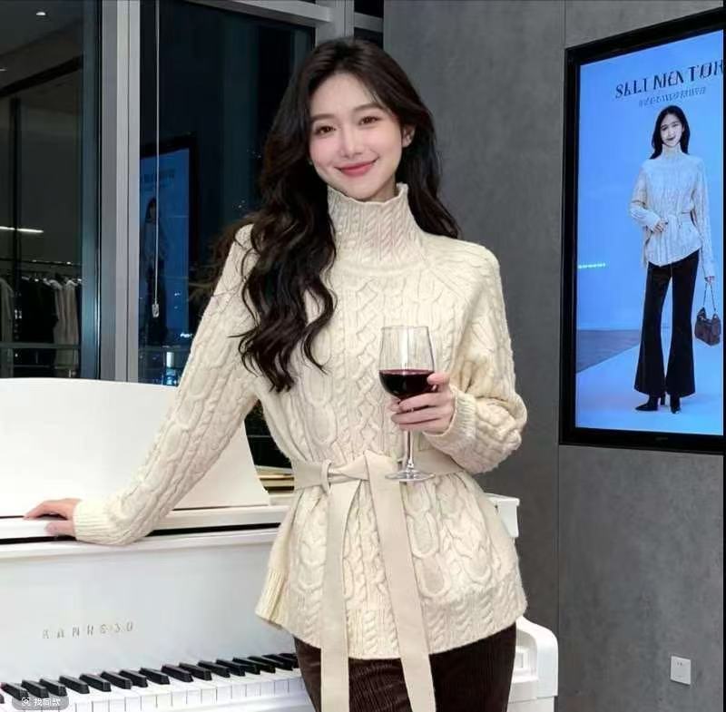 MY15634# 修身收腰系带套头高领麻花毛衣新款显瘦针织衫百搭上衣女裝貨源服裝批發