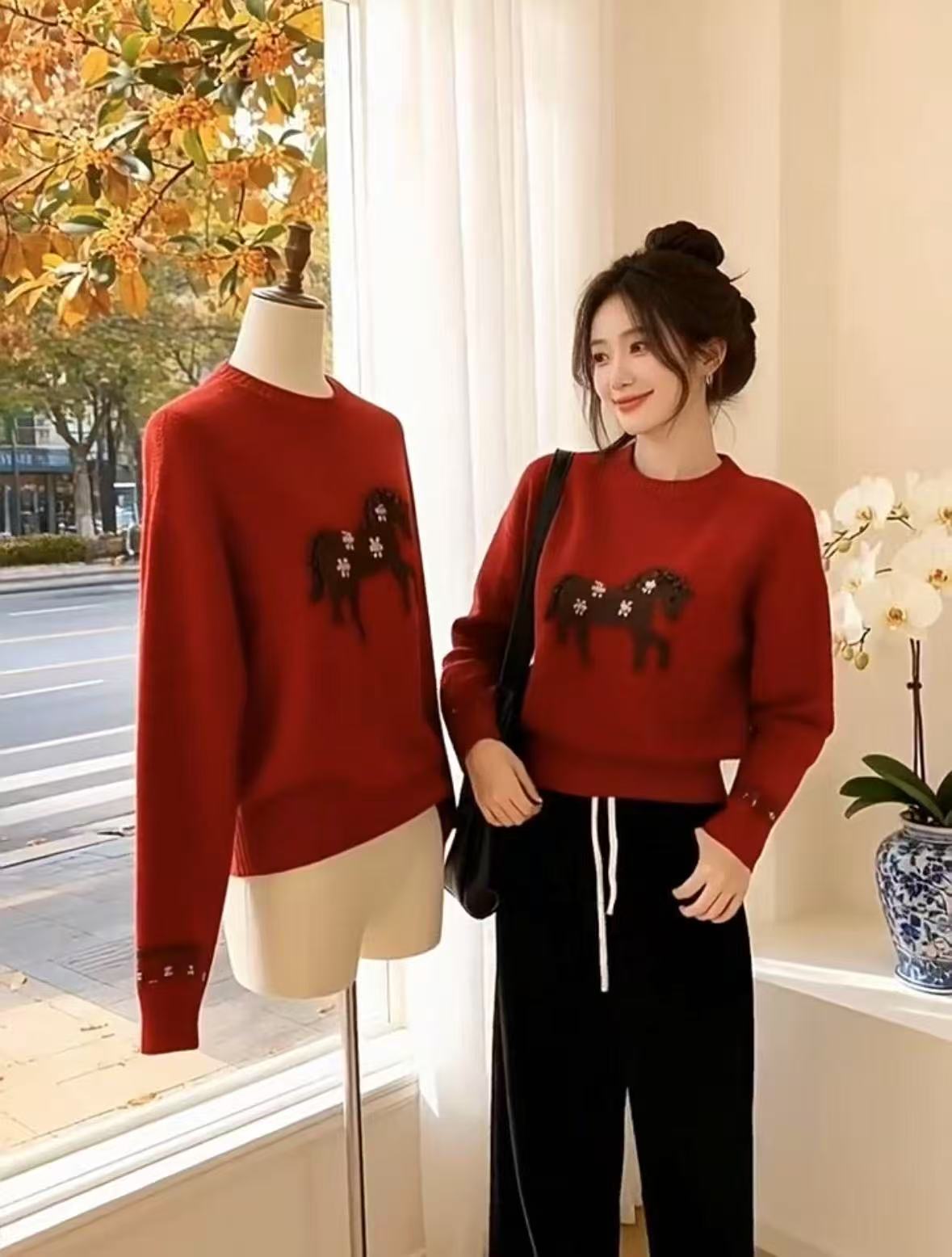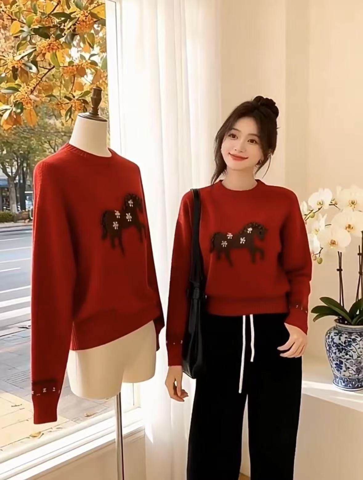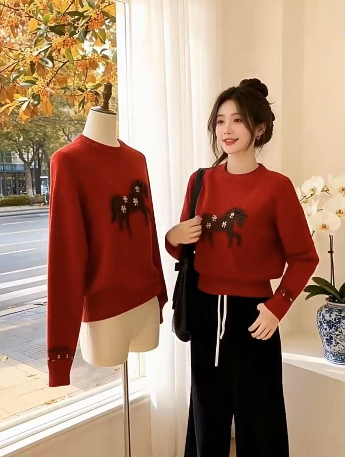MY15636# 绝美漂亮新年红色小马提花毛衣新款巨好看减龄高级感针织衫女裝貨源服裝批發