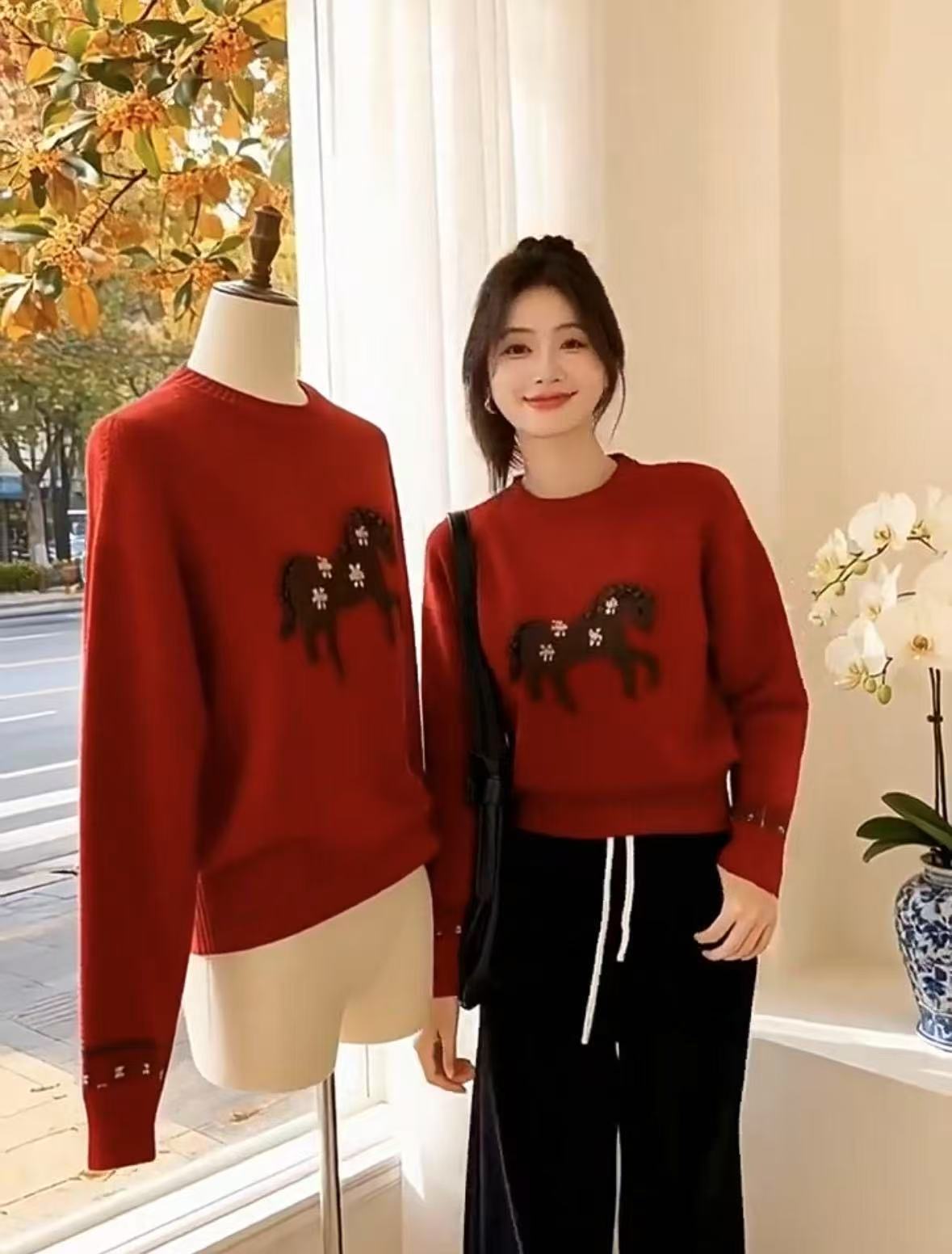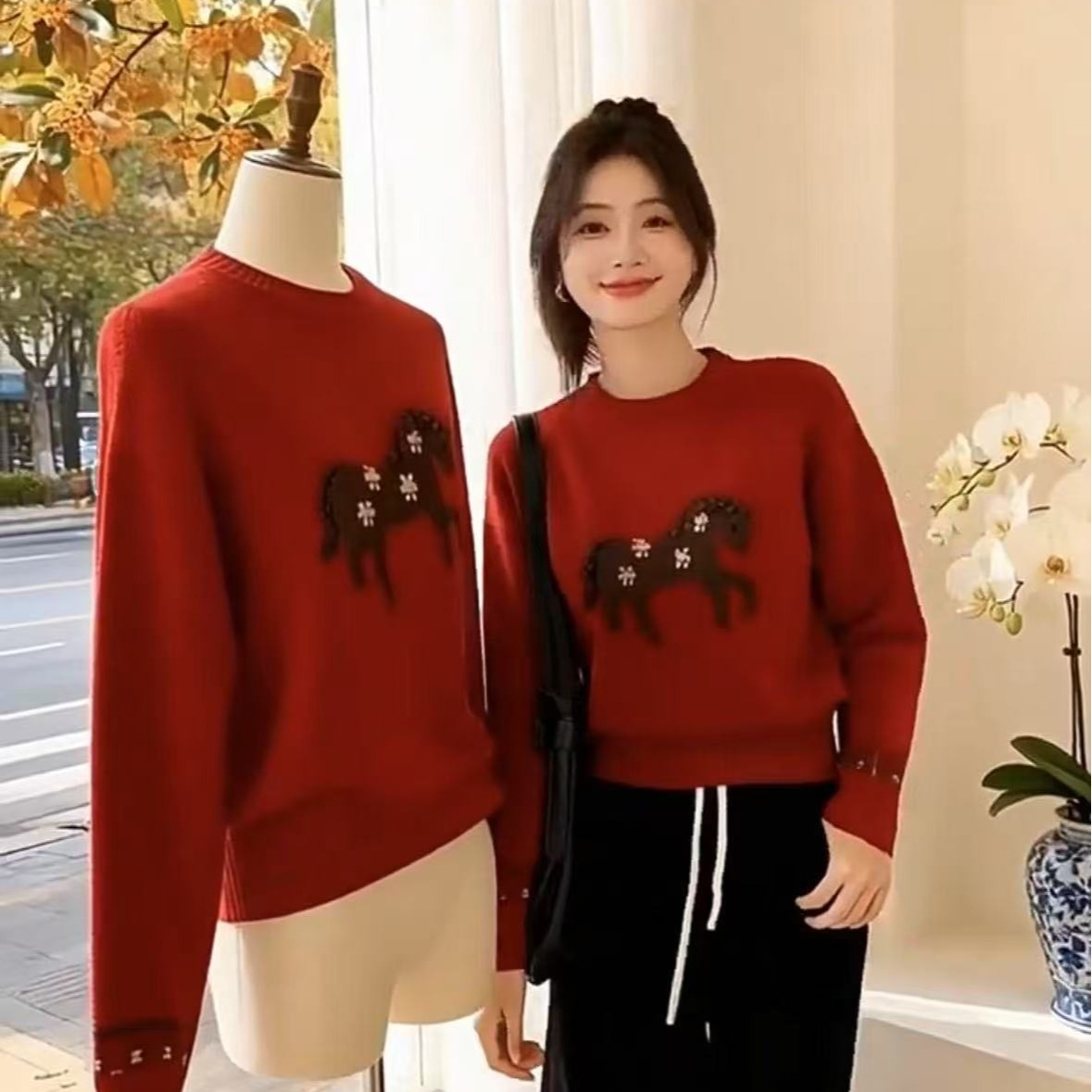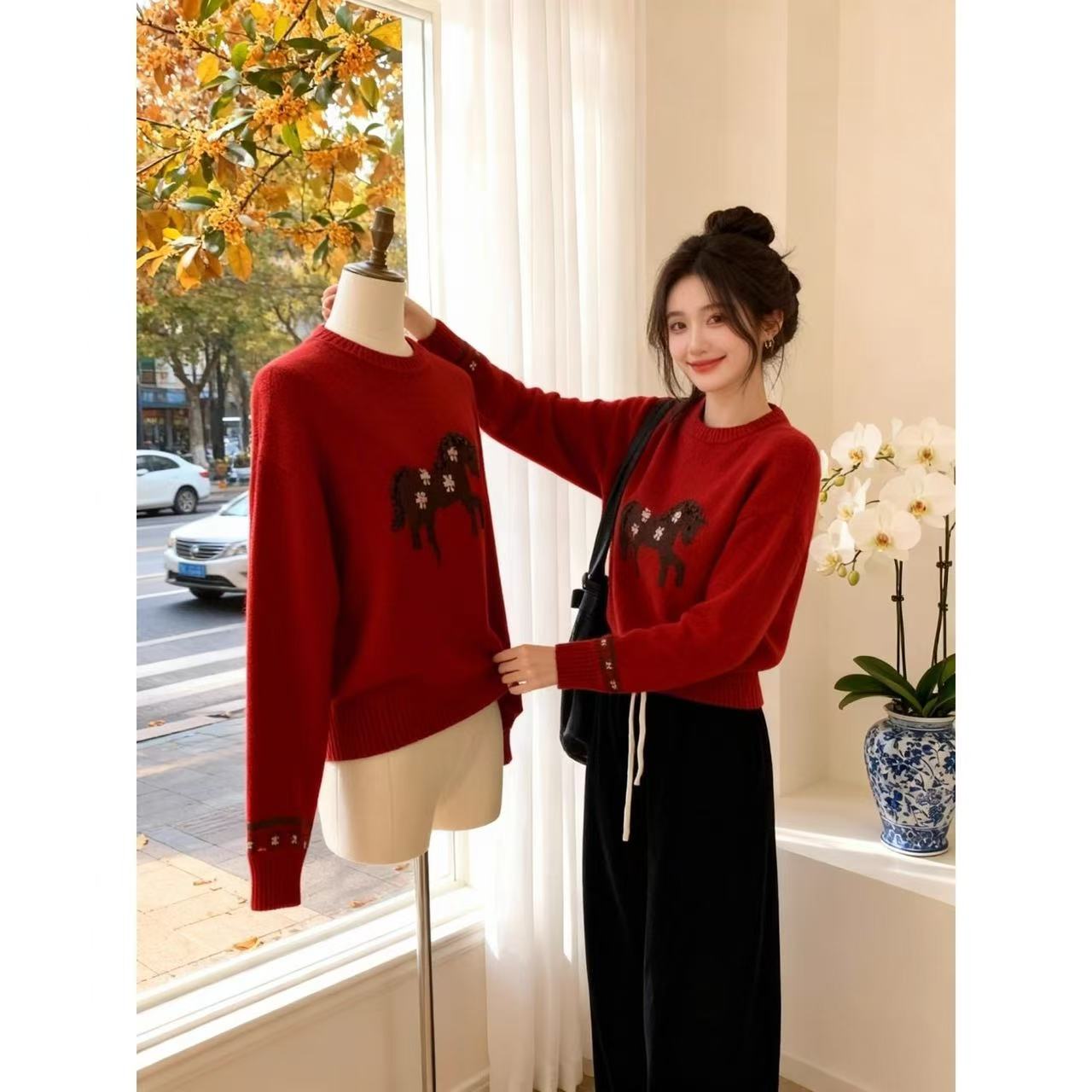 MY15636# 绝美漂亮新年红色小马提花毛衣新款巨好看减龄高级感针织衫女裝貨源服裝批發
