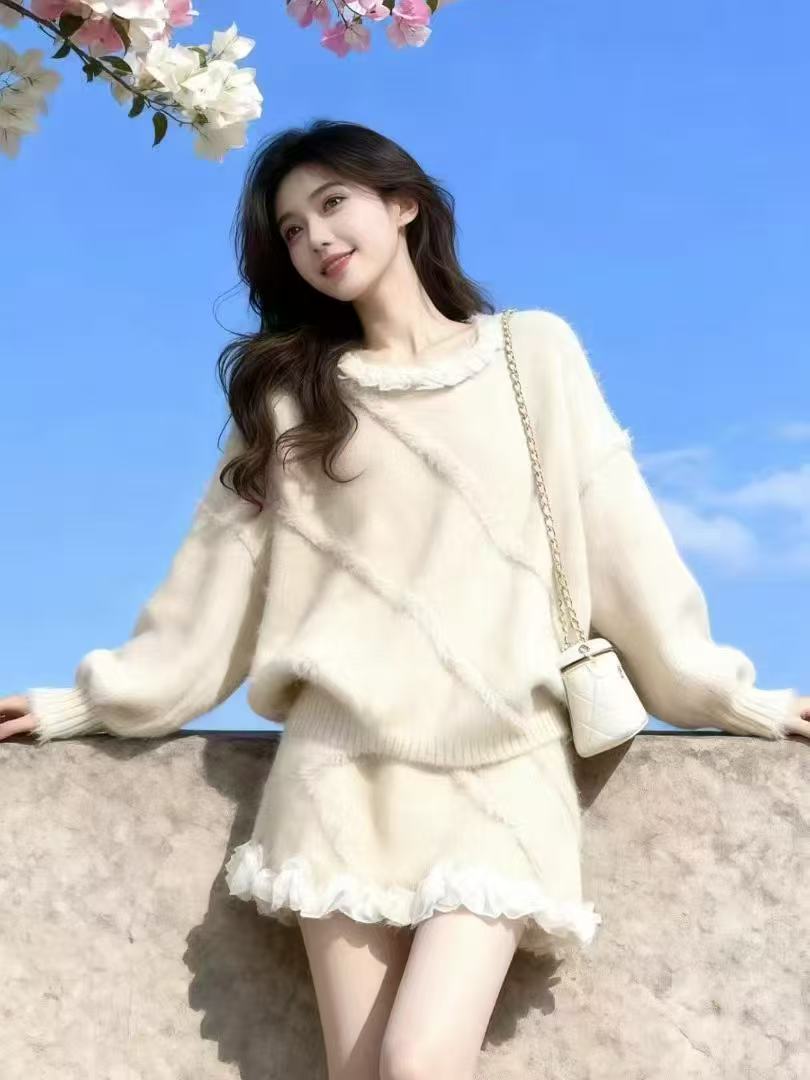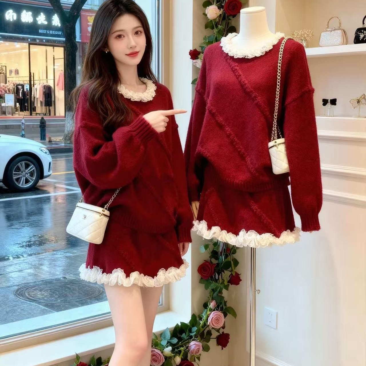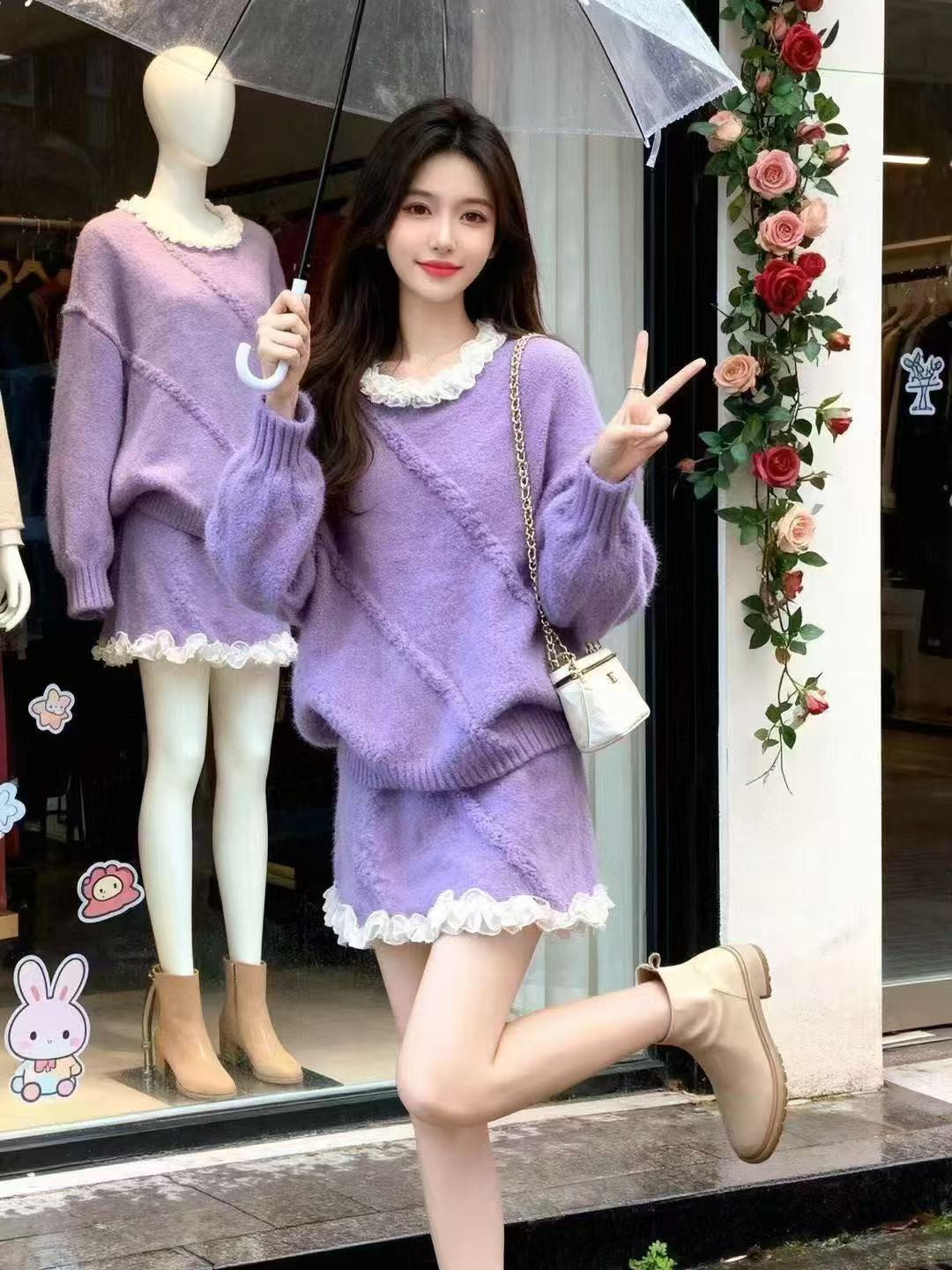 MY15640# 蕾丝花边甜美毛衣套装加厚慵懒+时尚休闲短裙两件套女裝貨源服裝批發