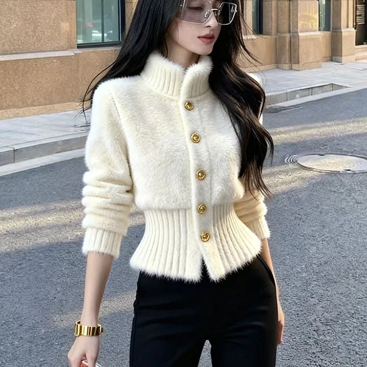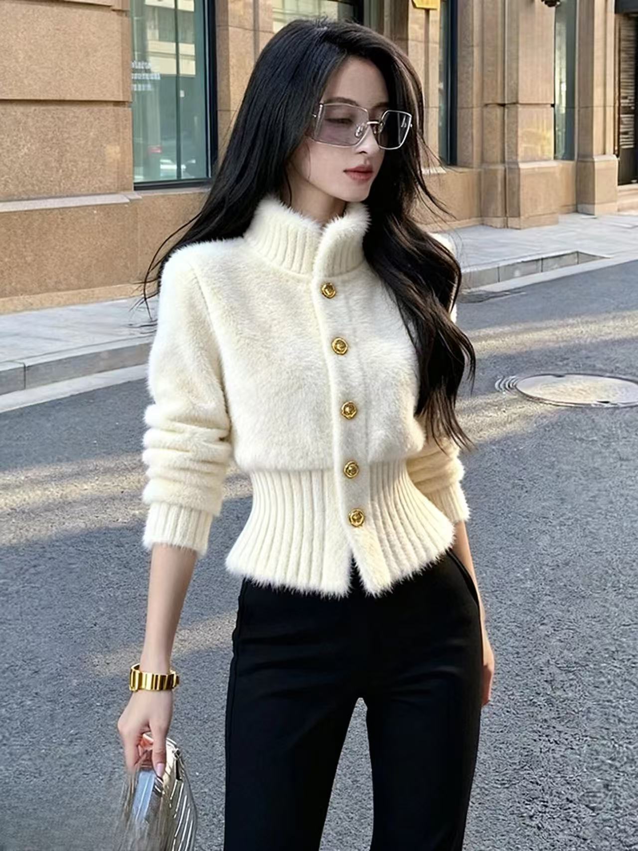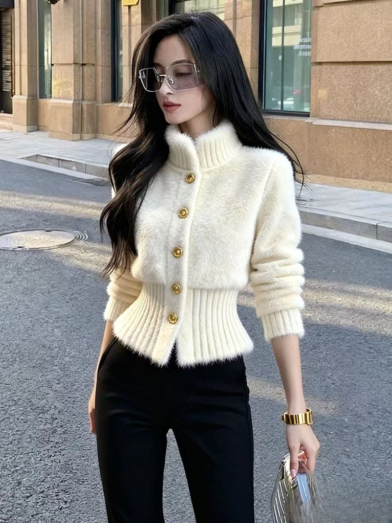 MY15641# 白色毛绒外套女款巨好看独特漂亮软糯气质高端掐腰小香风上衣女裝貨源服裝批發