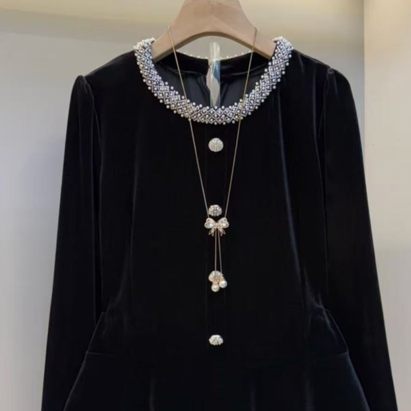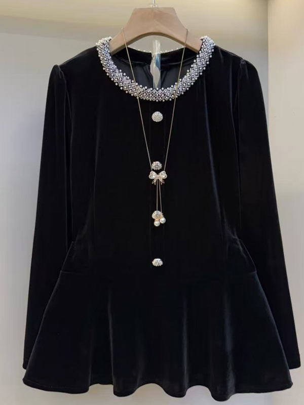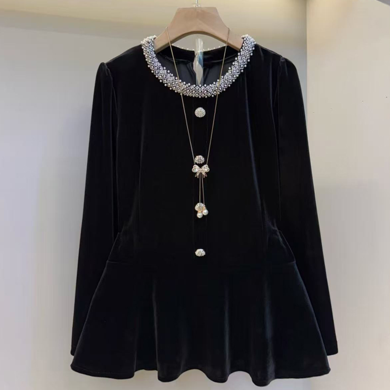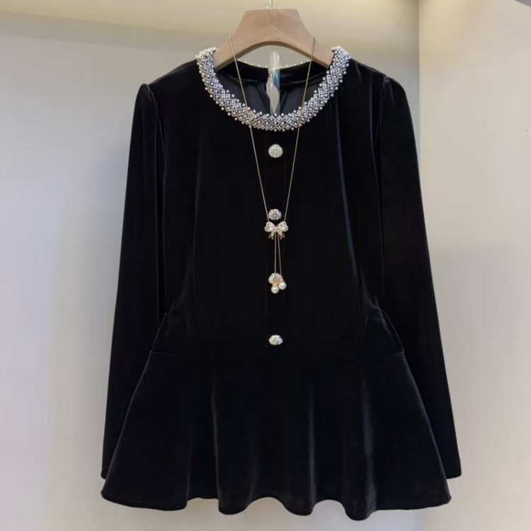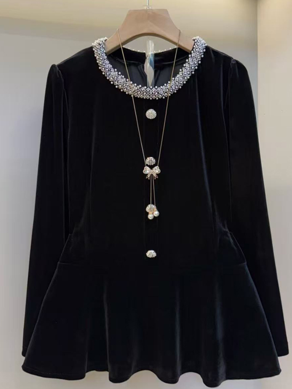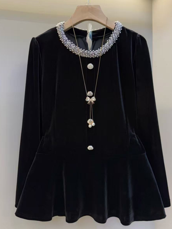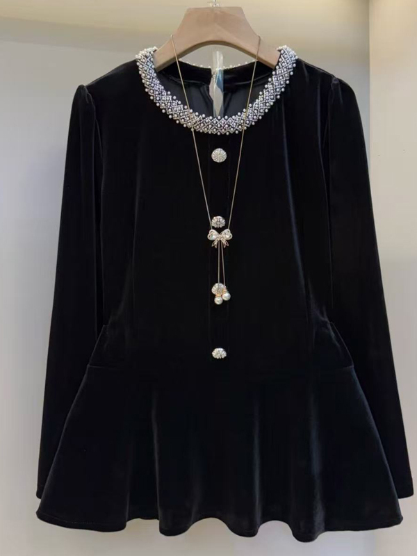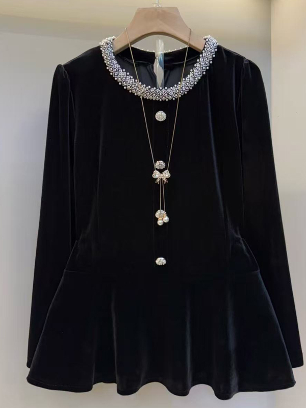 MY15841# 女装新款时尚女人衫韩版洋气圆领长袖钉珠丝绒黑色上衣潮女裝貨源服裝批發