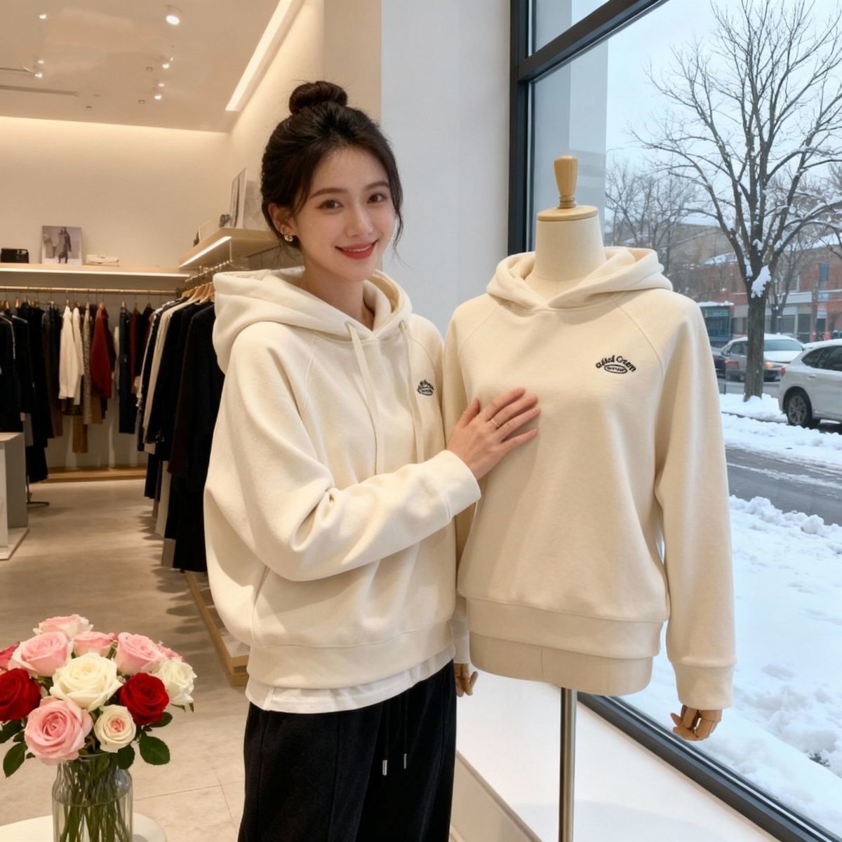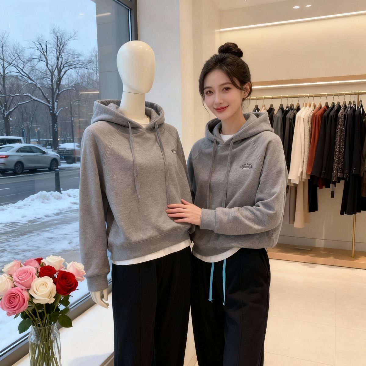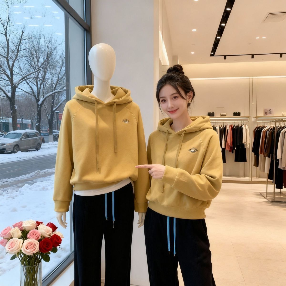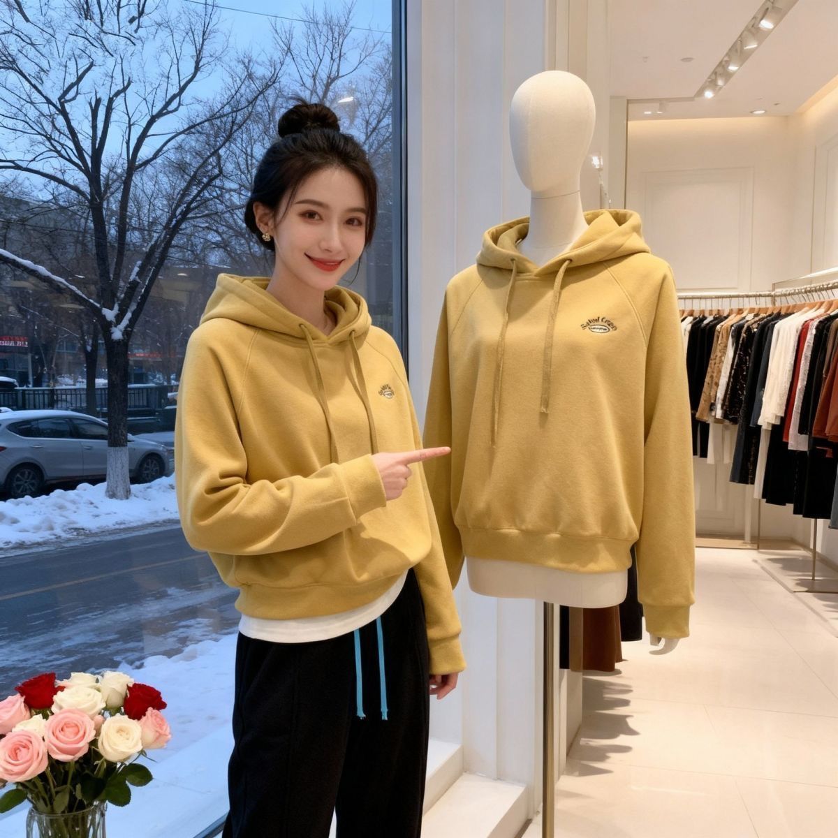 MY15858# 短款连帽卫衣新款加绒加厚刺绣长袖上衣小个子套头外套女裝貨源服裝批發