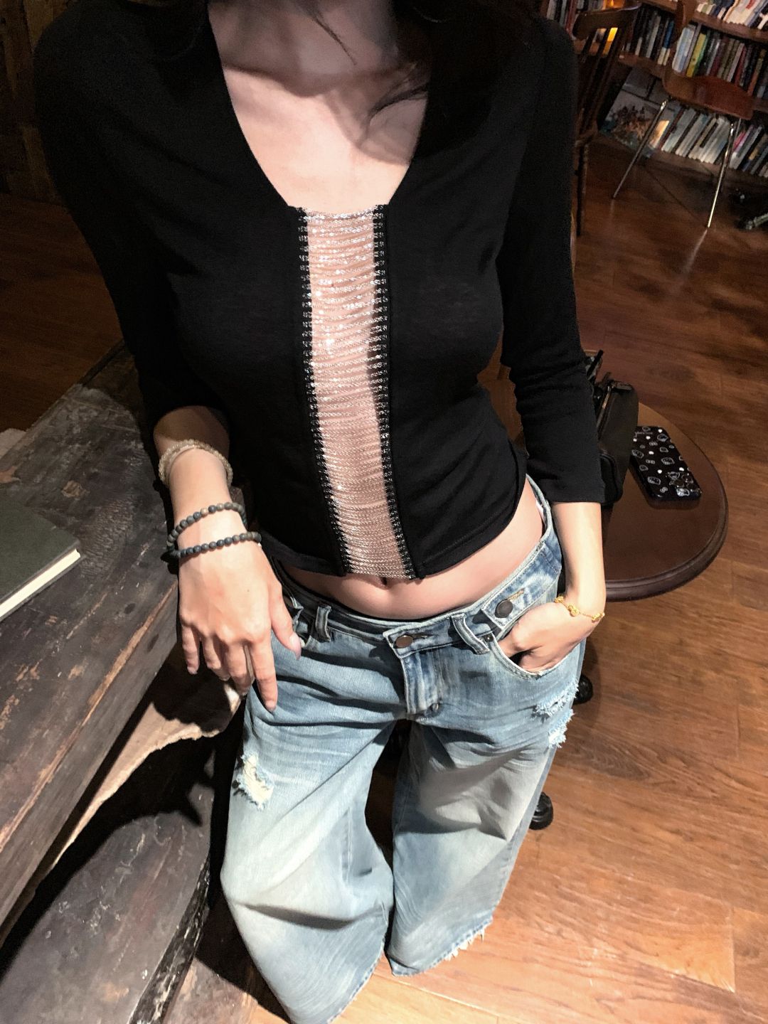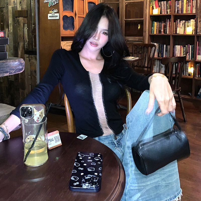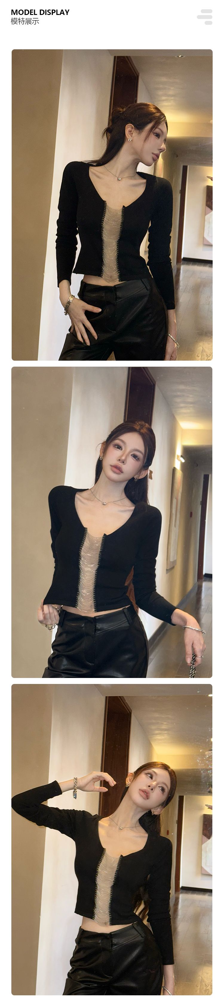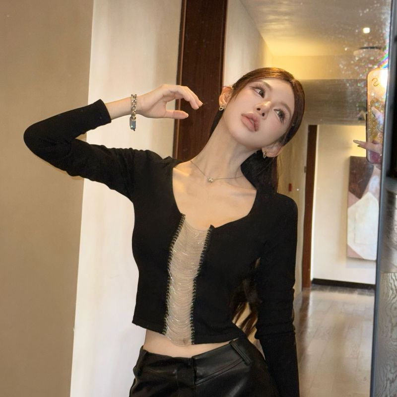 MY15860# 仿棉 设计感链条T恤八分袖修身辣妹风小众短上衣女裝貨源服裝批發