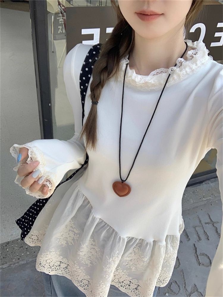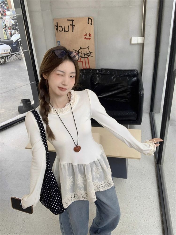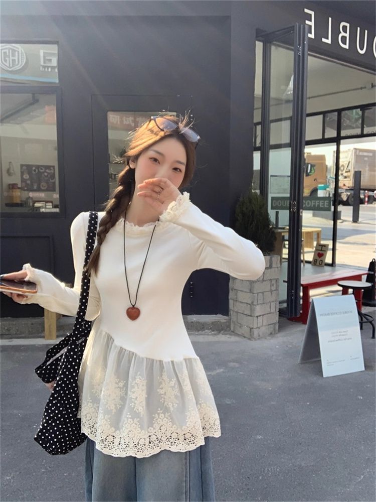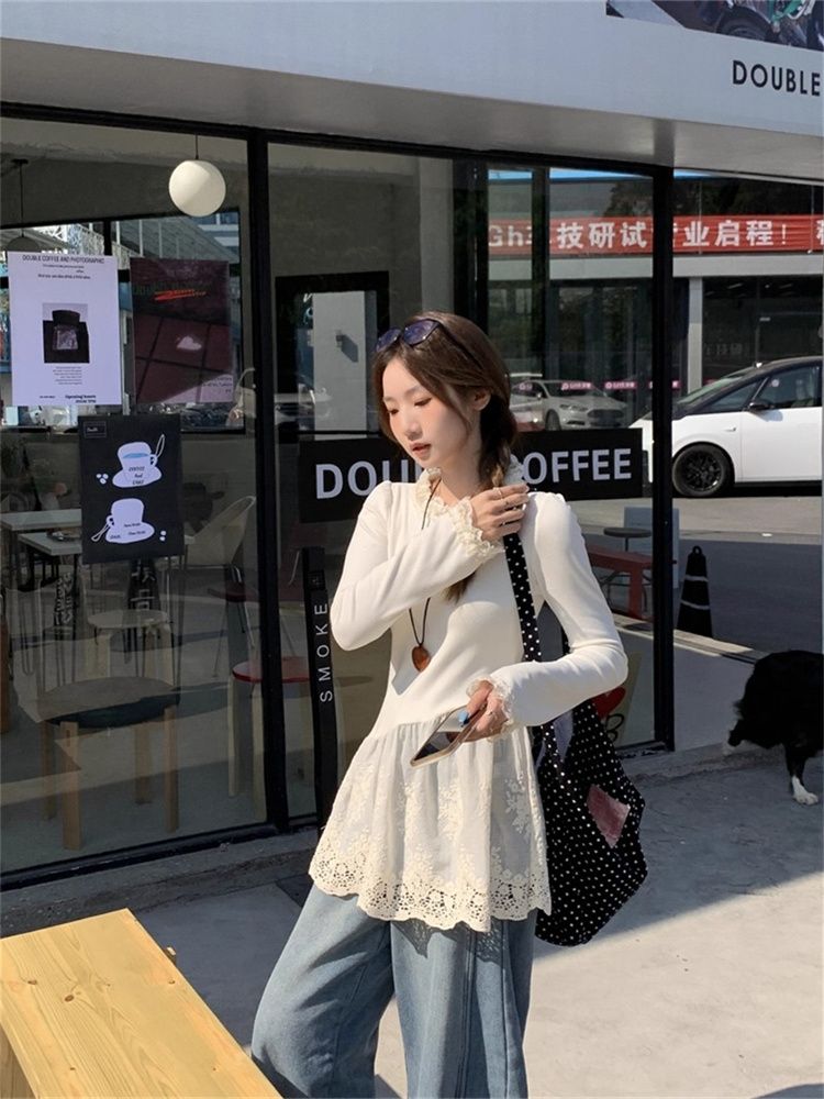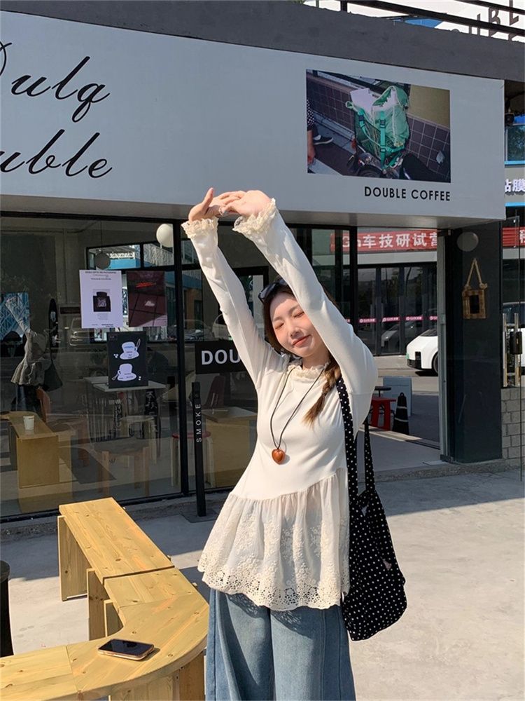 MY15863# 1*1德绒法式复古长袖t恤女新款蕾丝打底衫胖MM遮肉显瘦上衣女裝貨源服裝批發