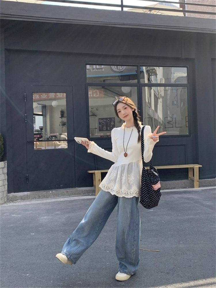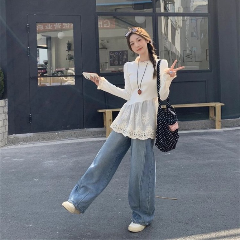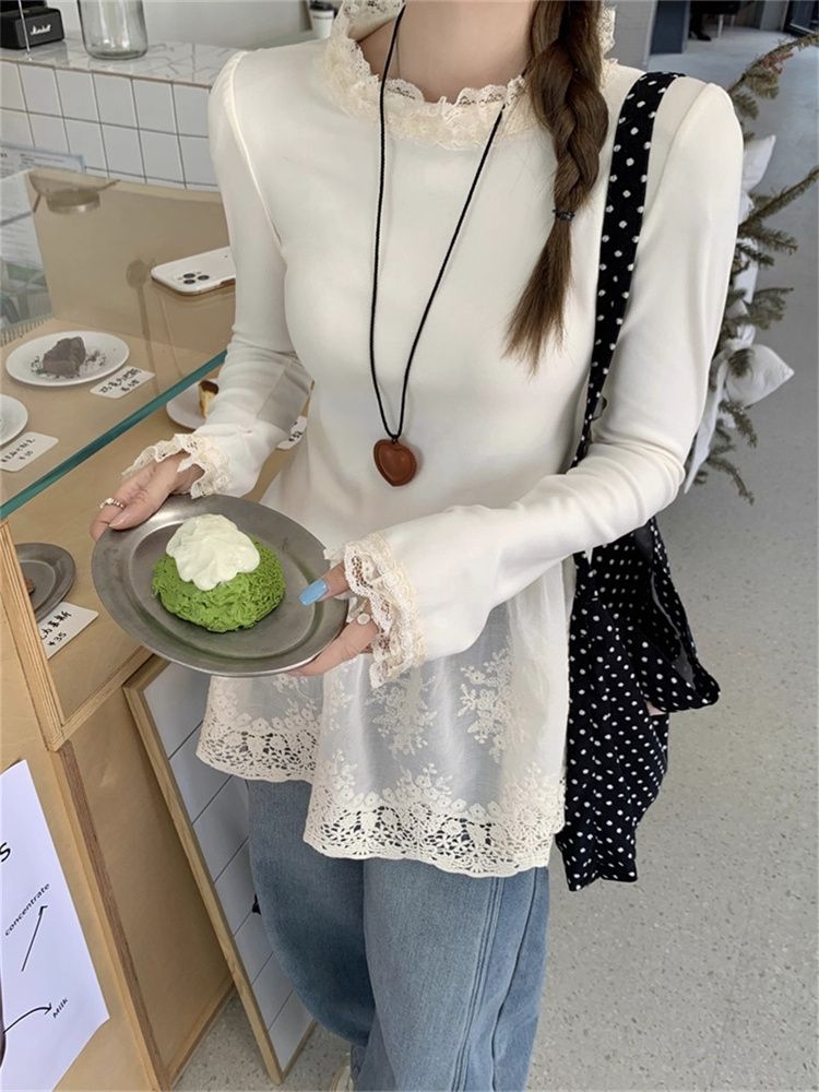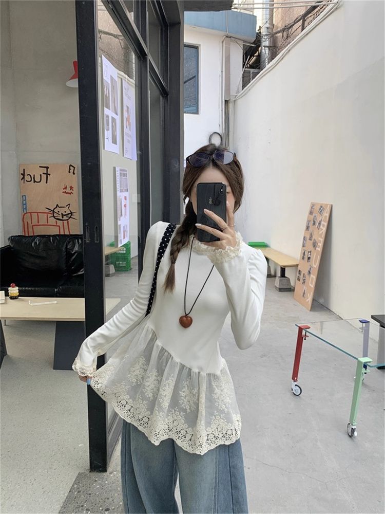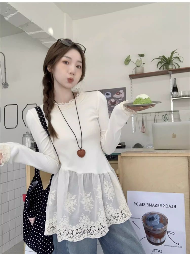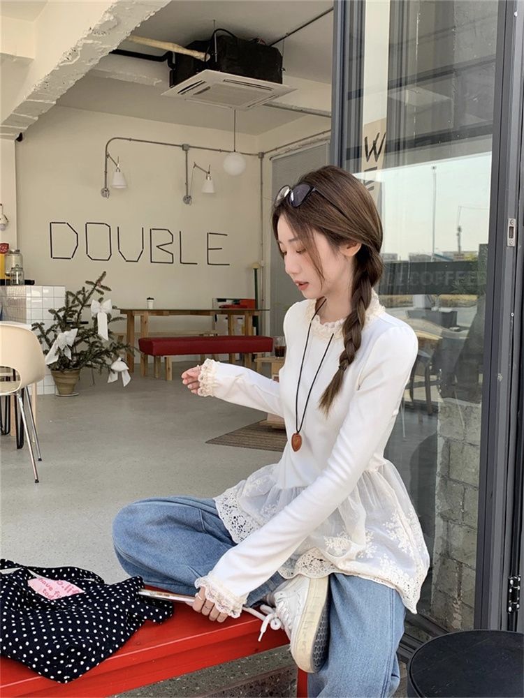 MY15863# 1*1德绒法式复古长袖t恤女新款蕾丝打底衫胖MM遮肉显瘦上衣女裝貨源服裝批發