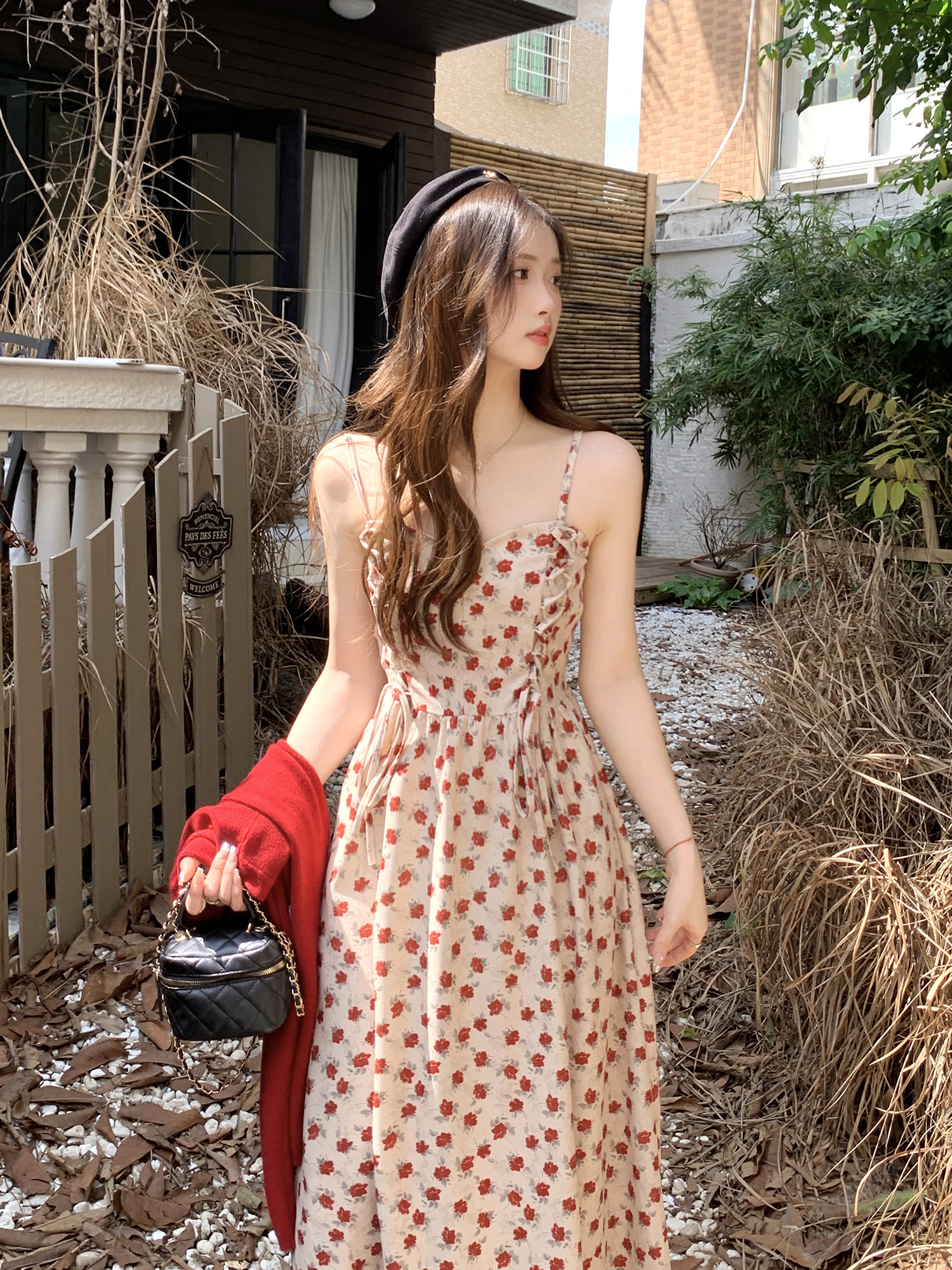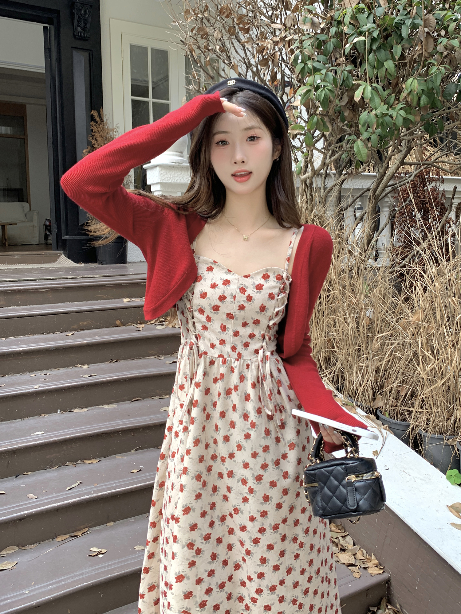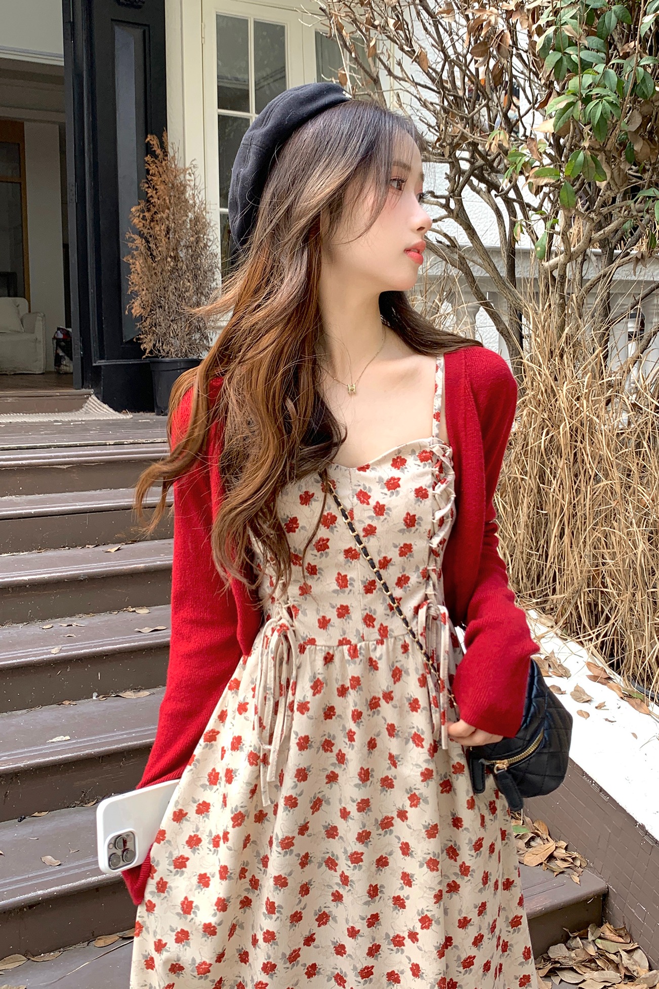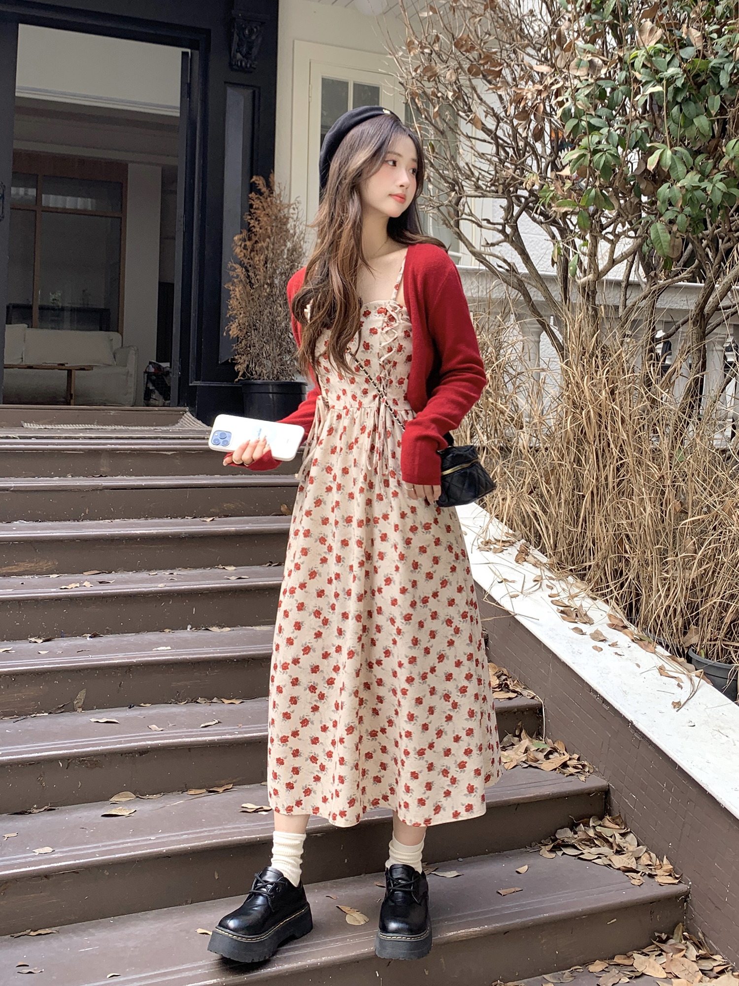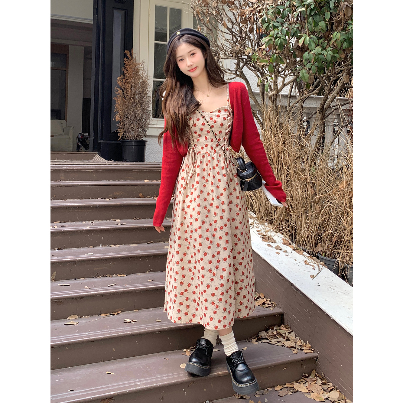MY15892# 韩版秋冬新款连衣裙温柔风别致灯芯绒碎花吊带裙针织开衫女裝貨源服裝批發