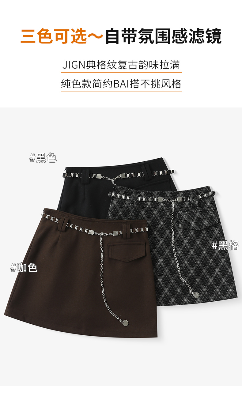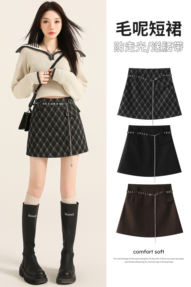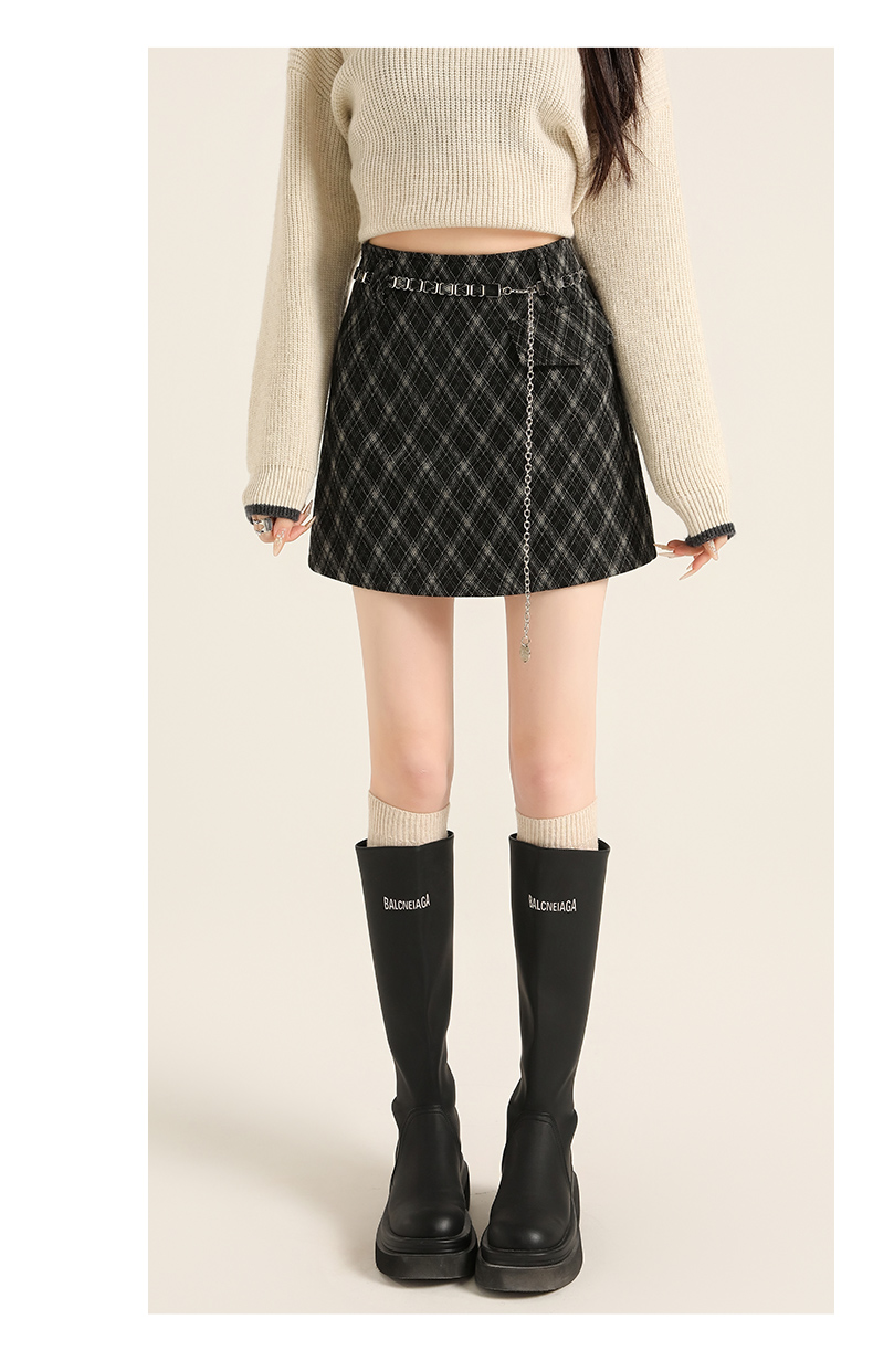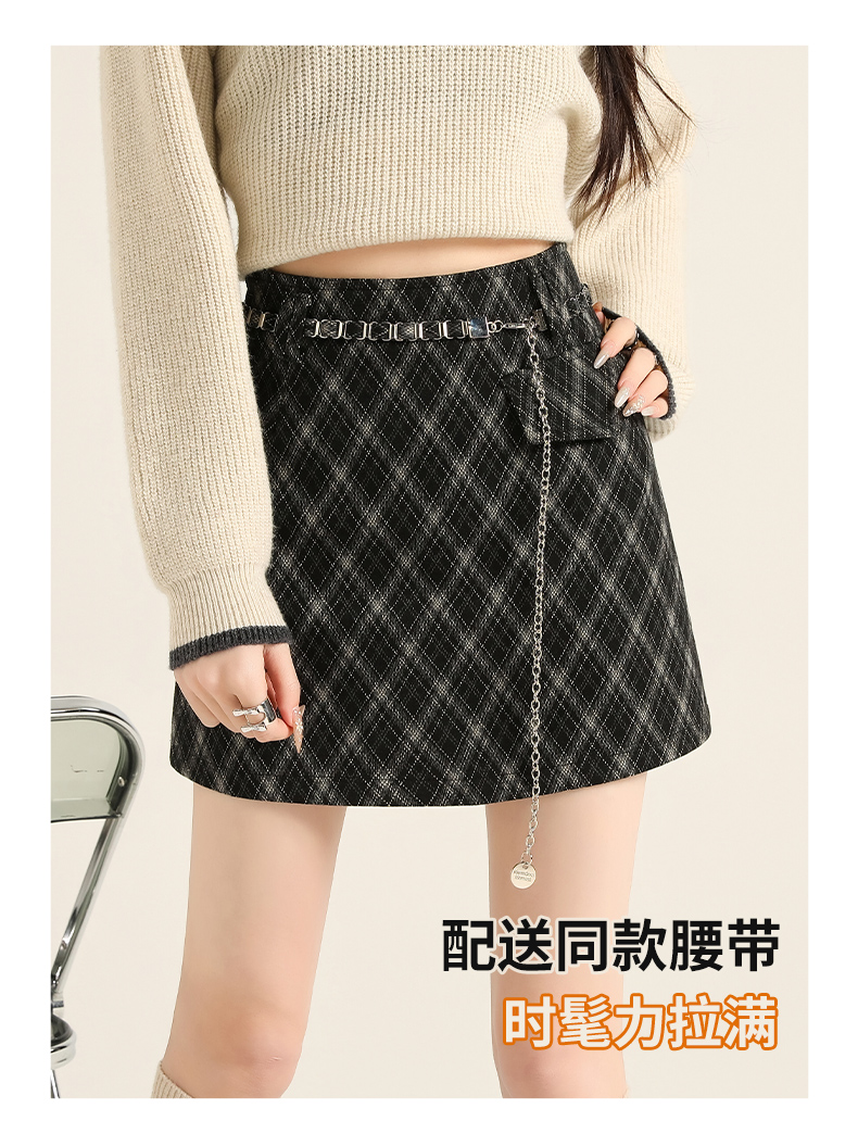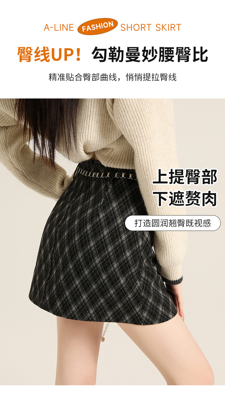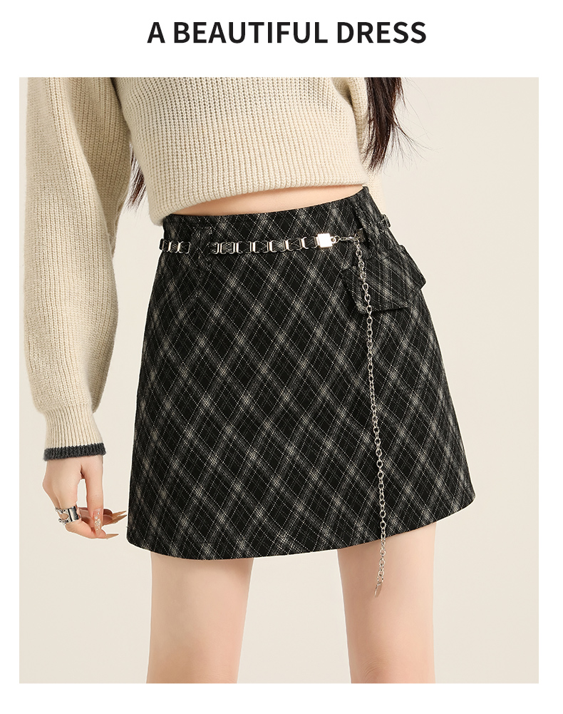 MY15898# 复古格纹毛呢半身裙新款秋冬季小个子链条高腰a字包臀短裙女裝貨源服裝批發
