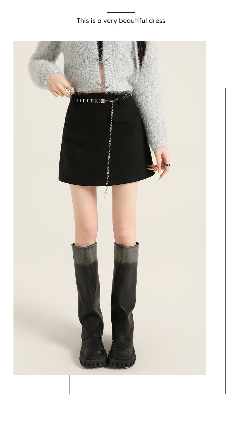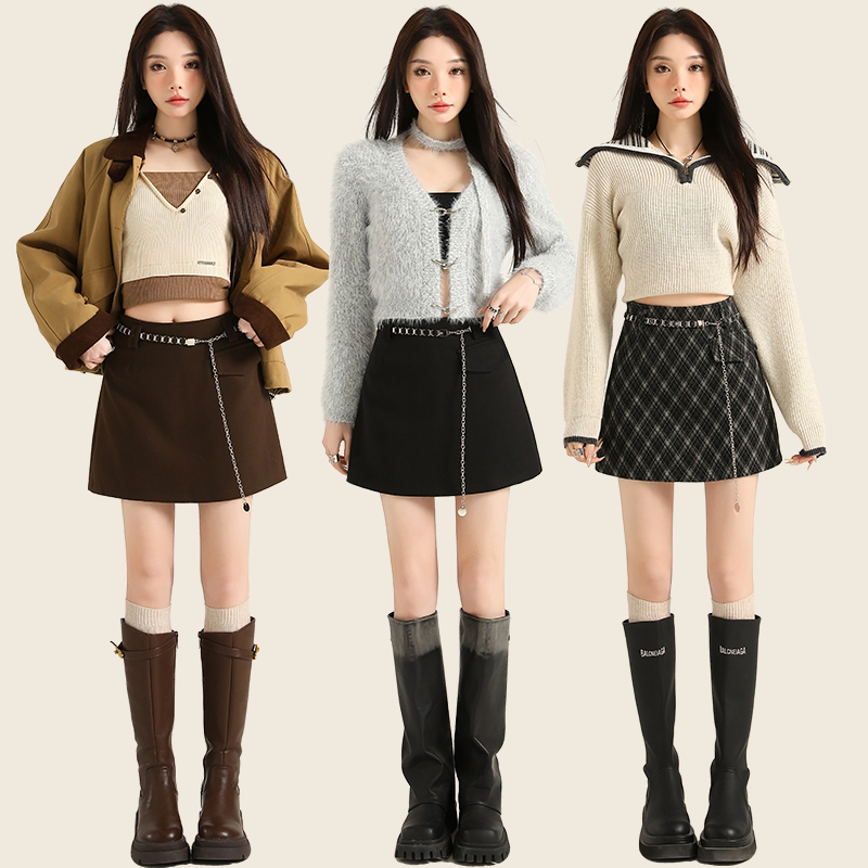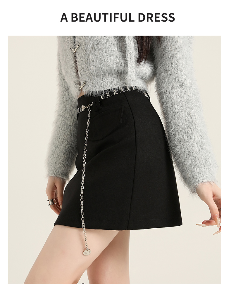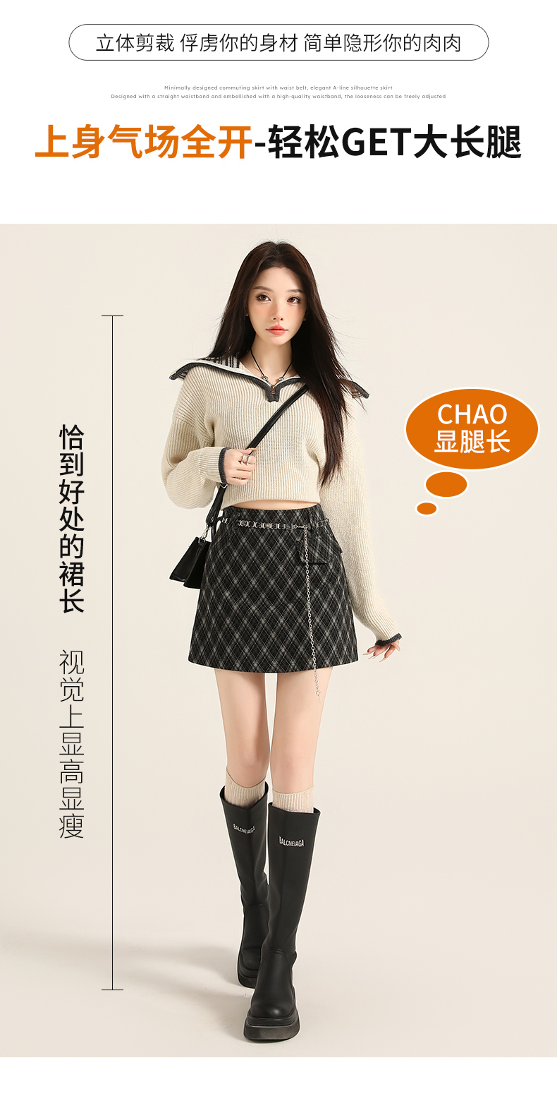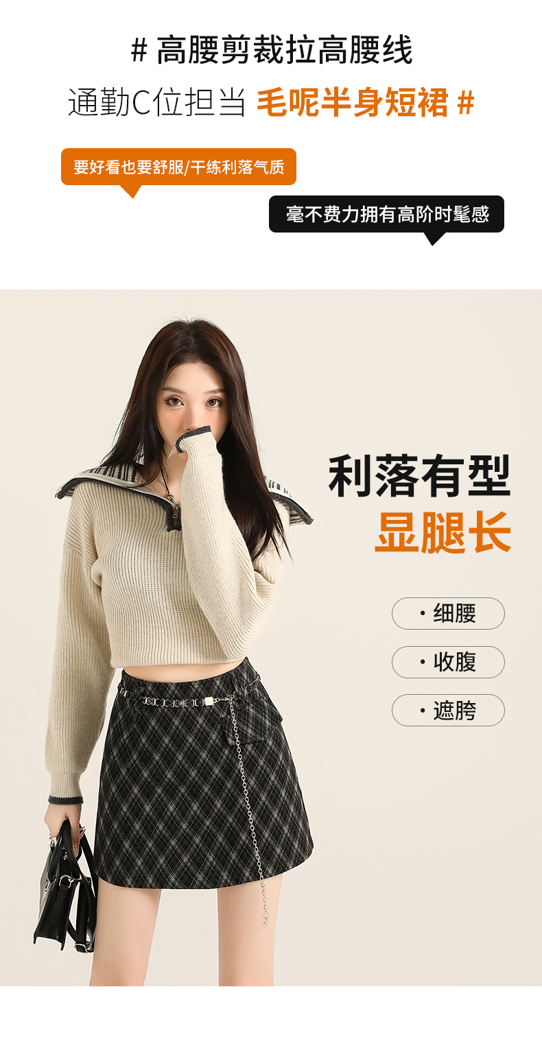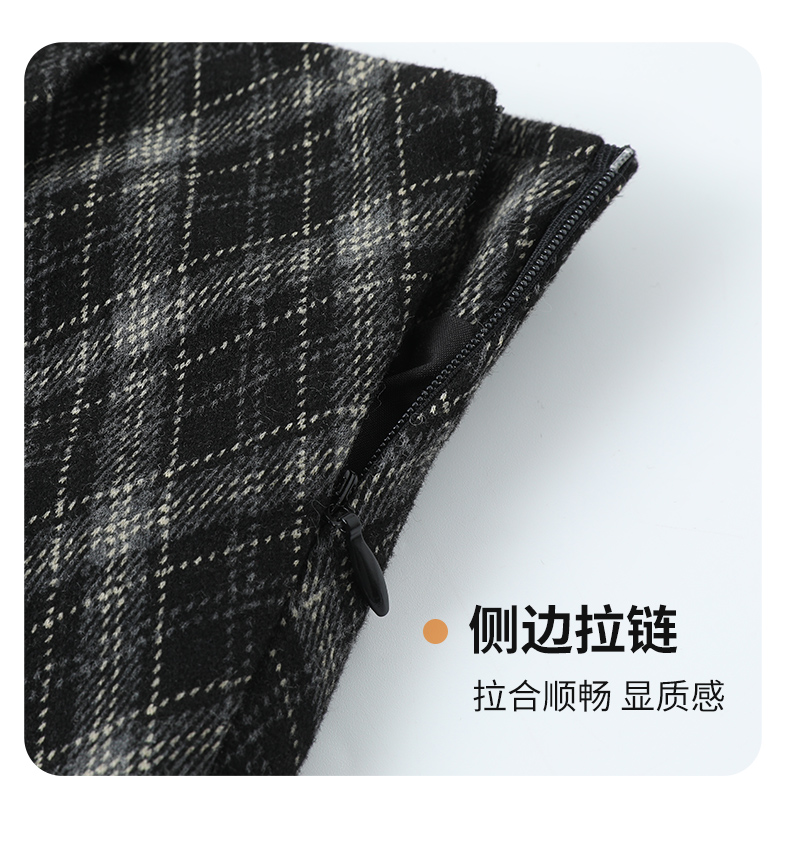 MY15898# 复古格纹毛呢半身裙新款秋冬季小个子链条高腰a字包臀短裙女裝貨源服裝批發