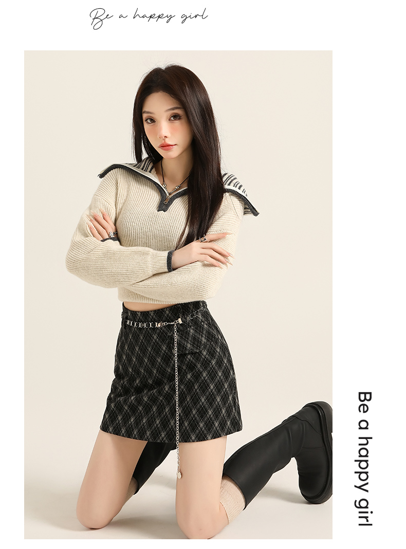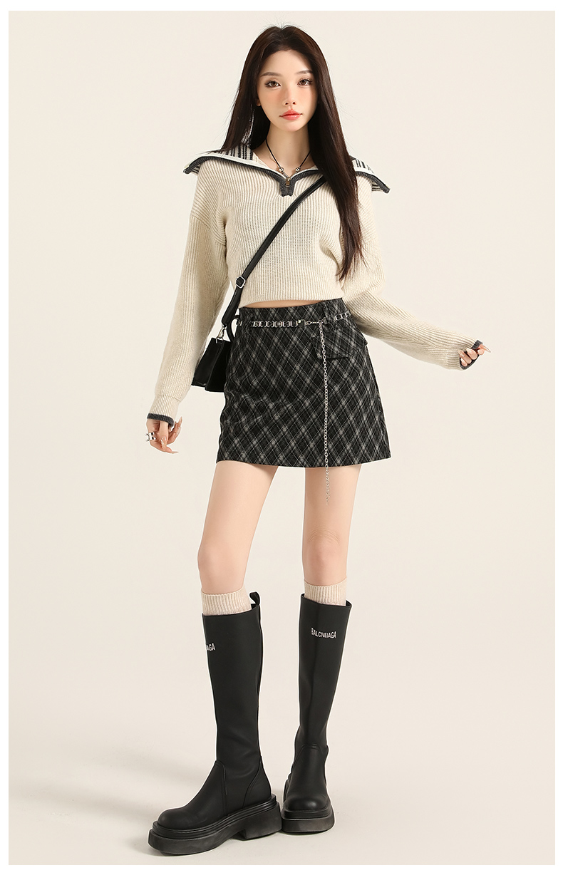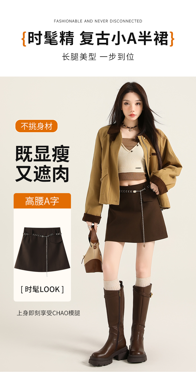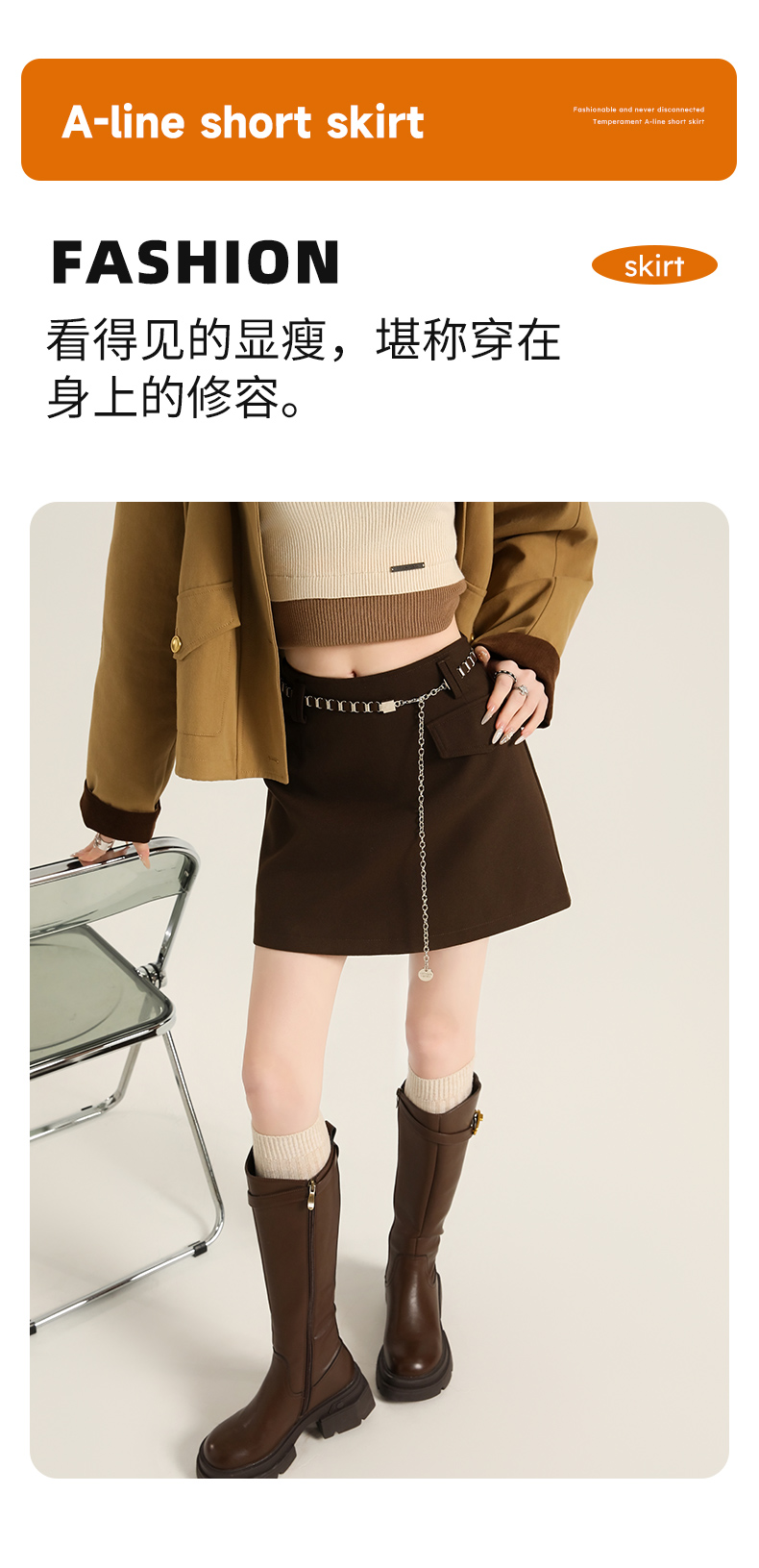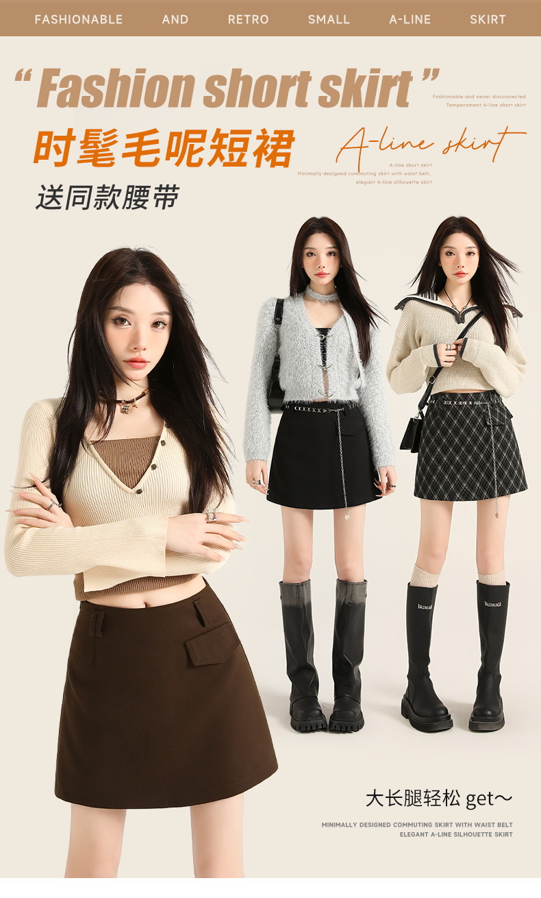 MY15898# 复古格纹毛呢半身裙新款秋冬季小个子链条高腰a字包臀短裙女裝貨源服裝批發