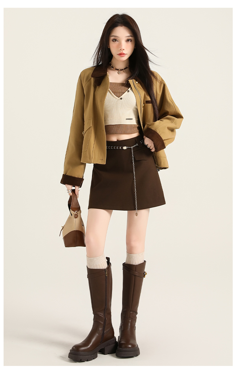 MY15913# 复古鹿皮绒立领长袖夹克外套女美式机车服宽松设计感气质上衣...