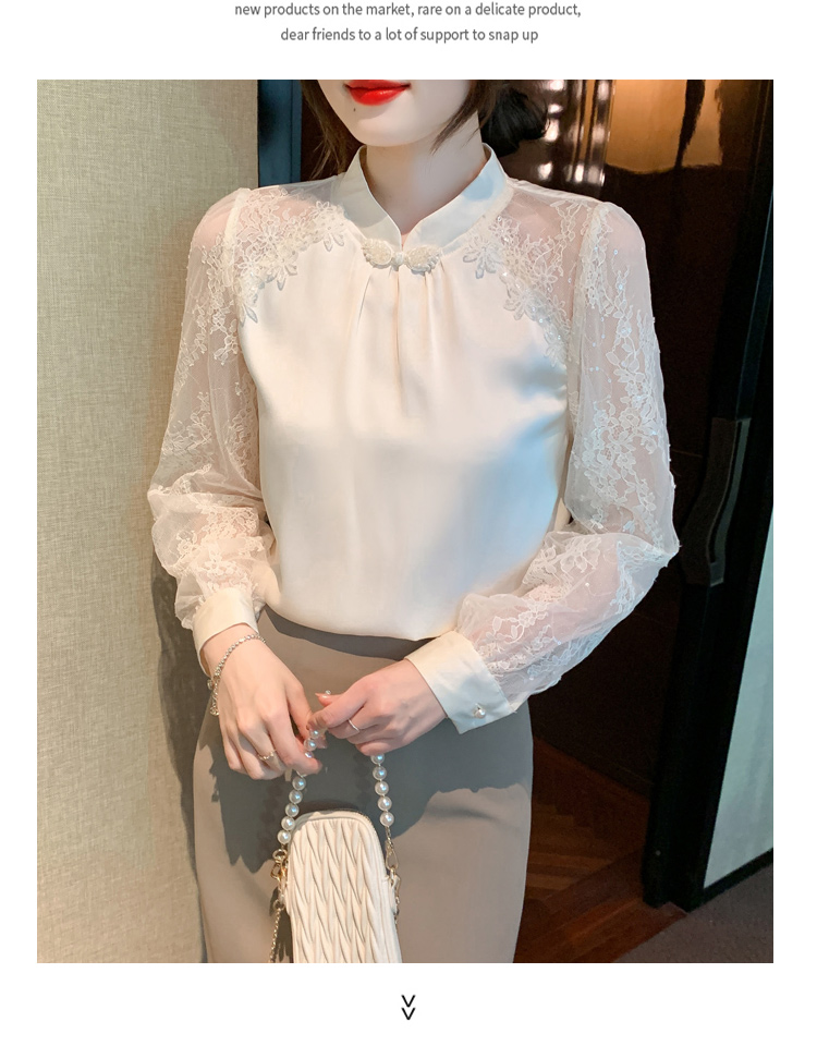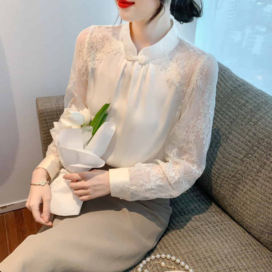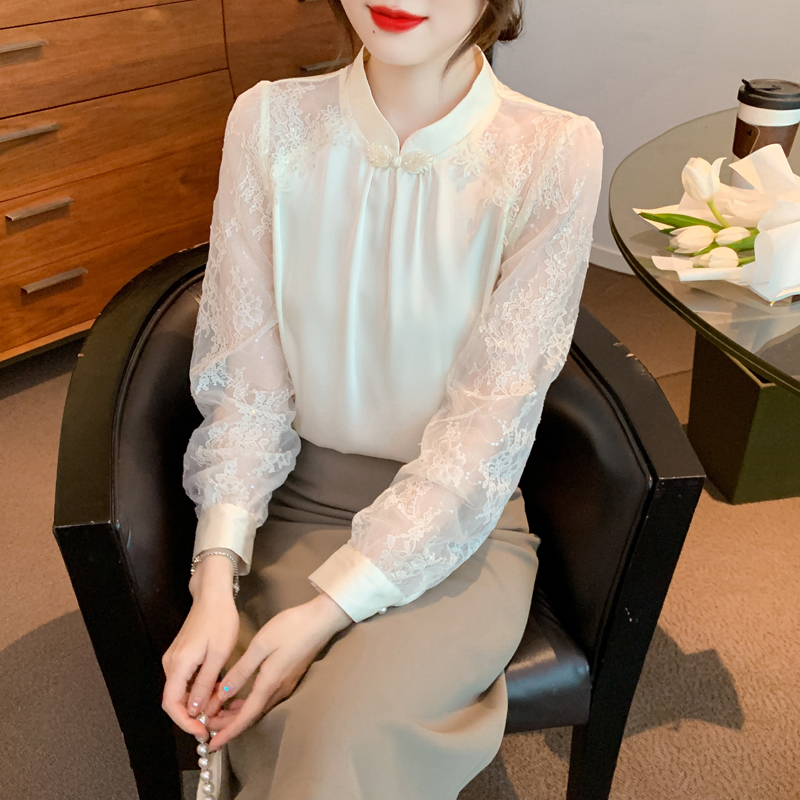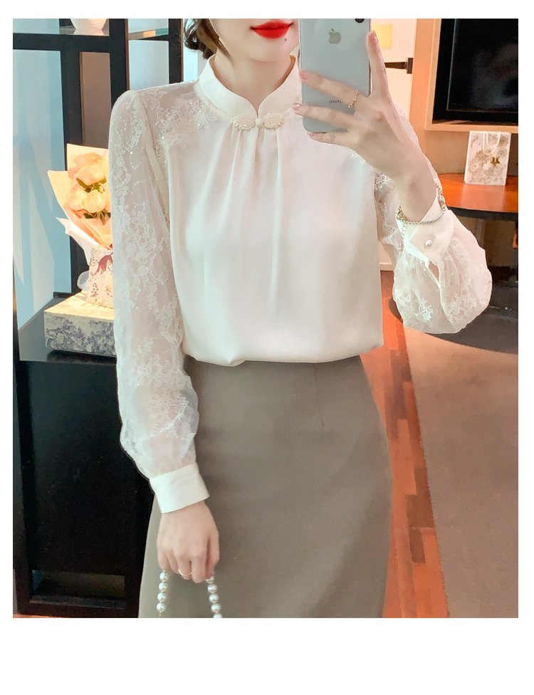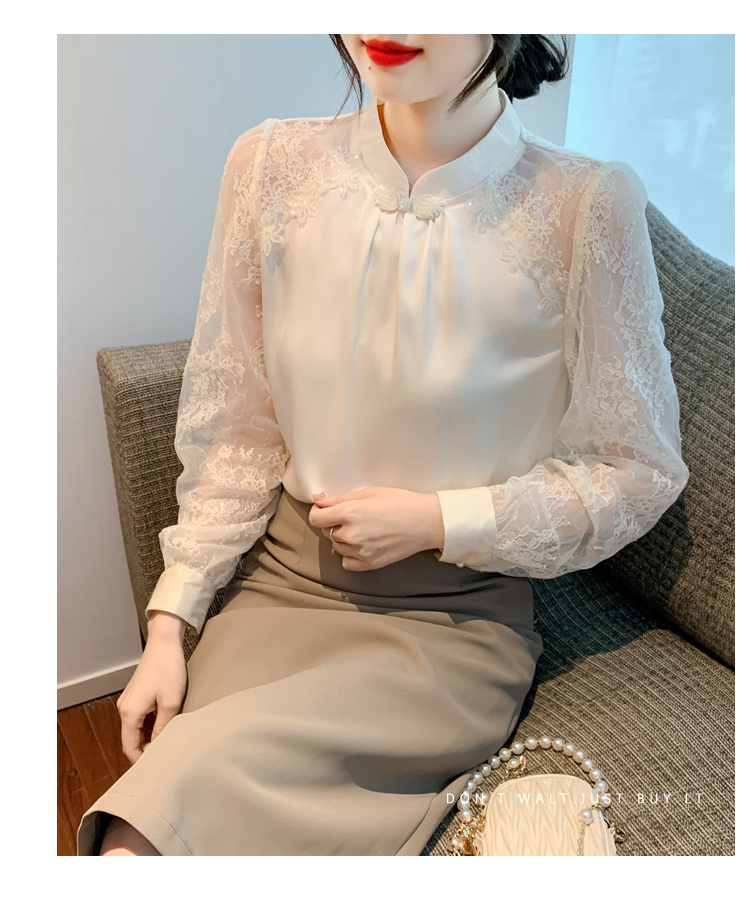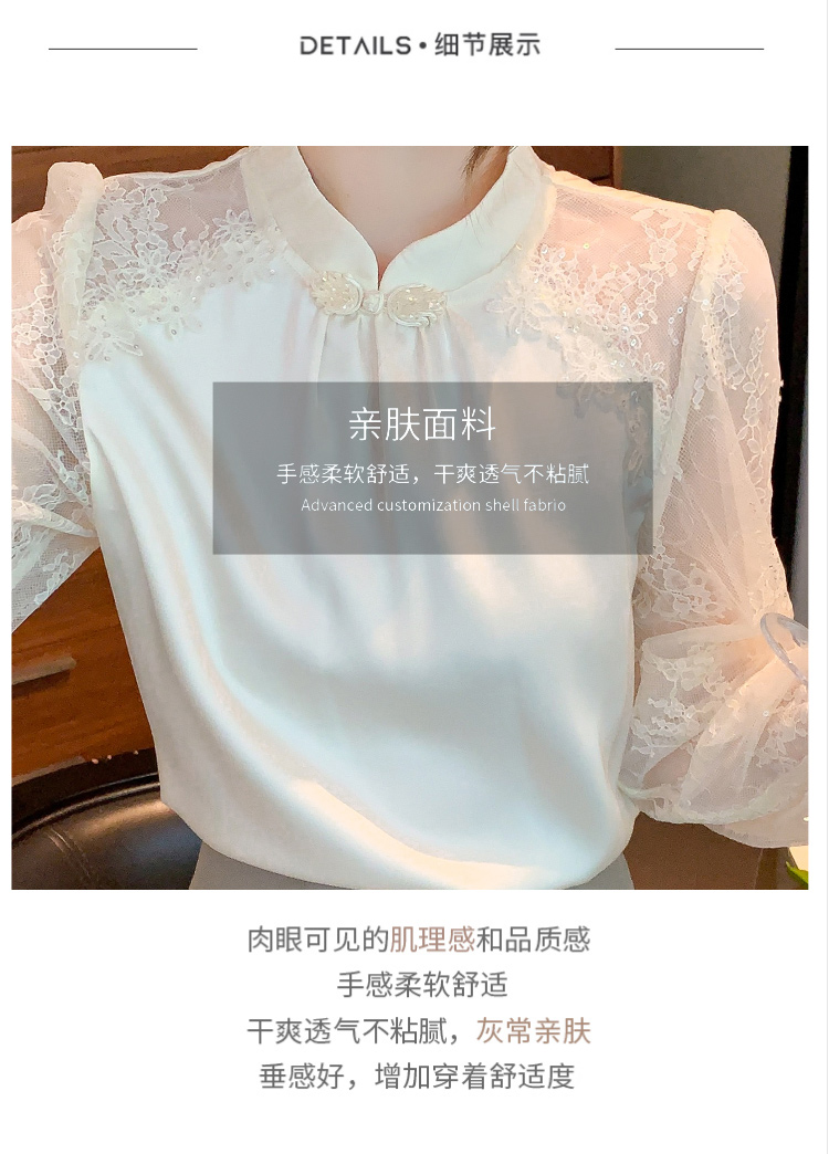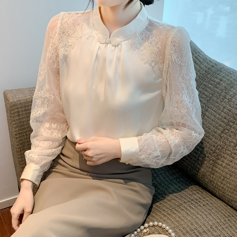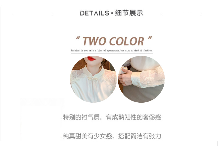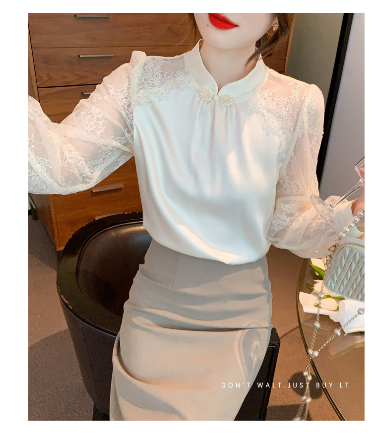 MY15902# 新款中式立领盘扣醋酸缎面衬衫女蕾丝拼接小衫上衣女裝貨源服裝批發