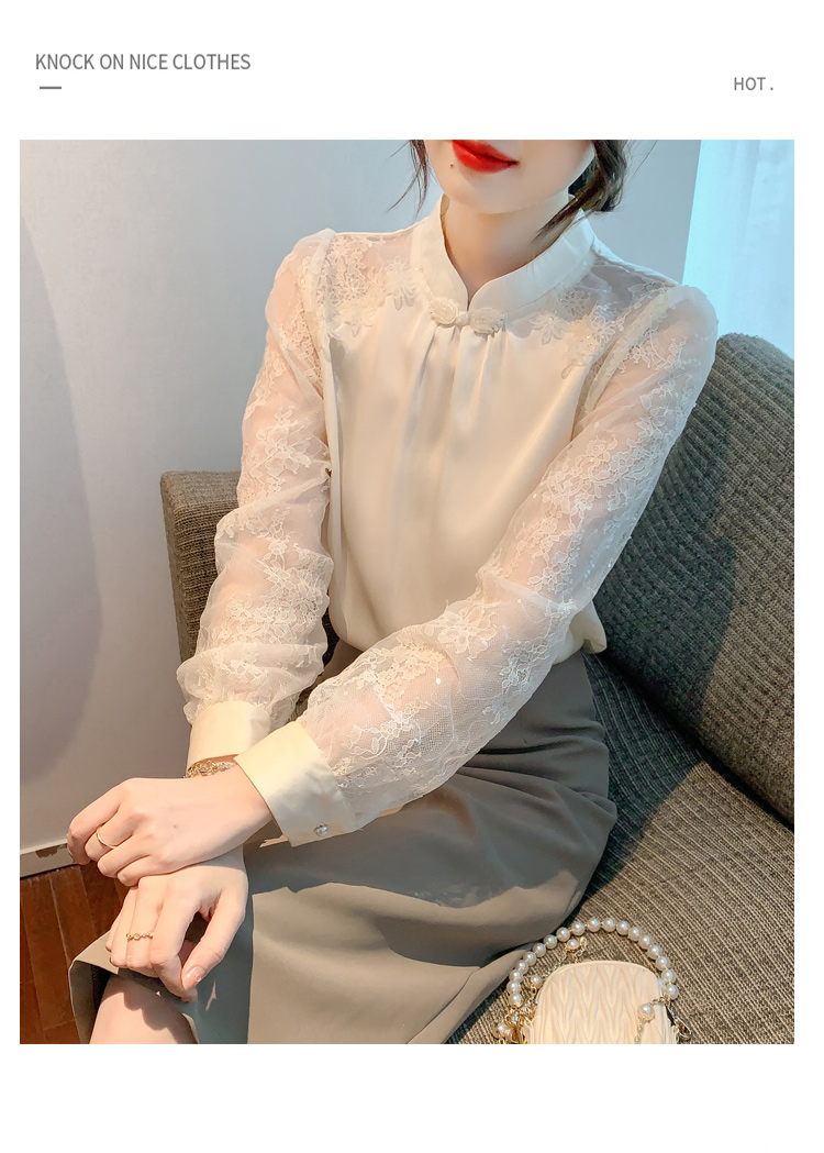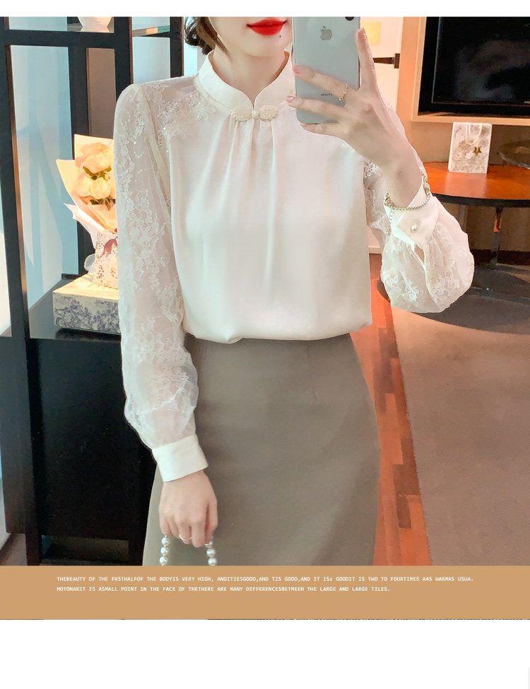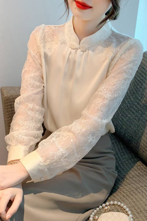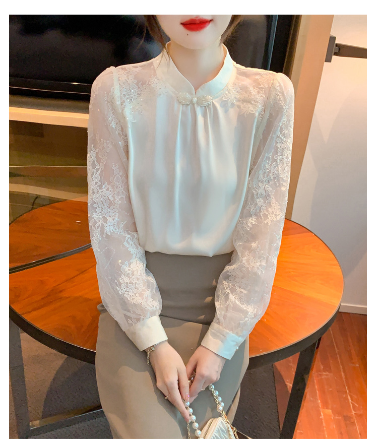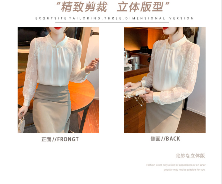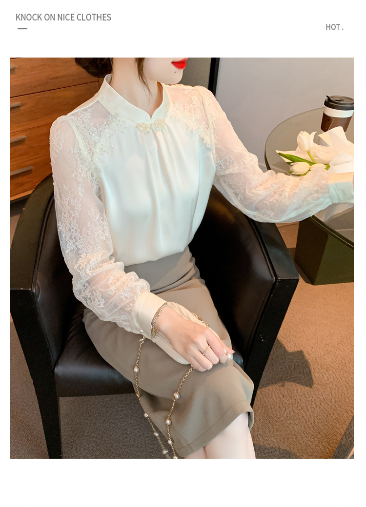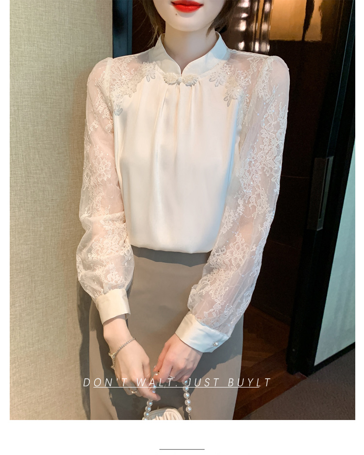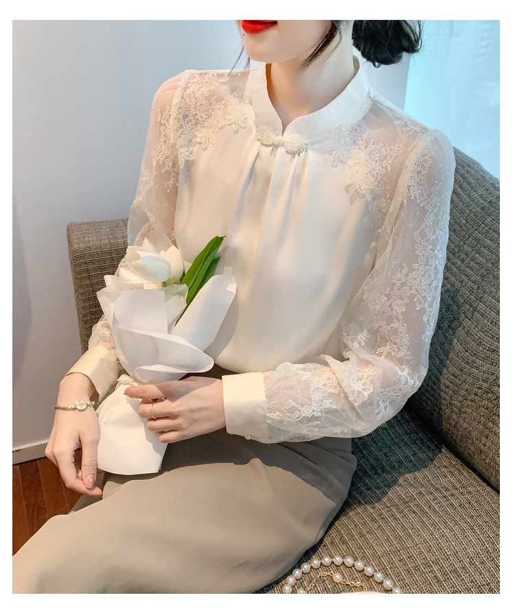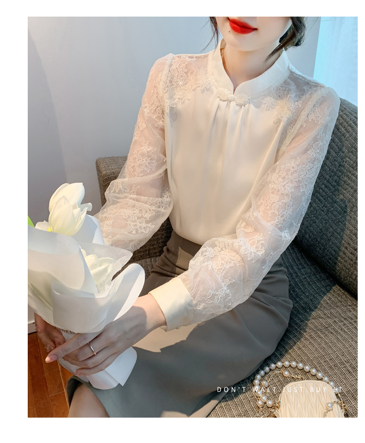 MY15902# 新款中式立领盘扣醋酸缎面衬衫女蕾丝拼接小衫上衣女裝貨源服裝批發