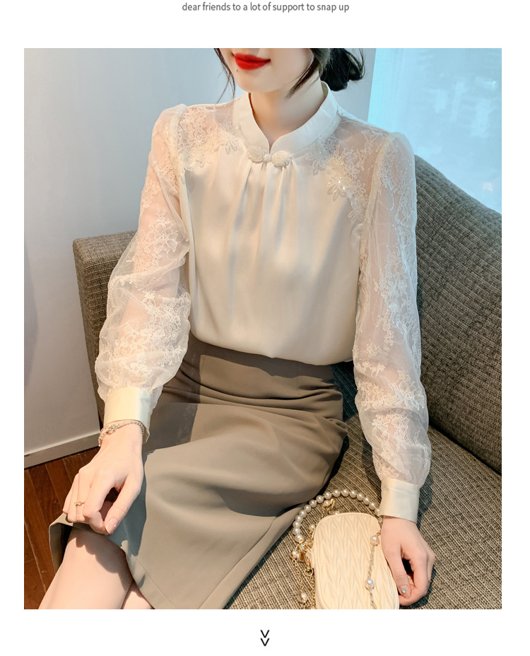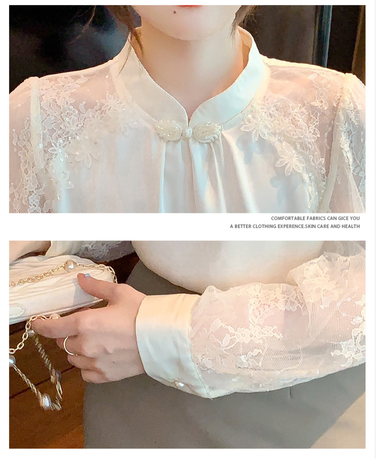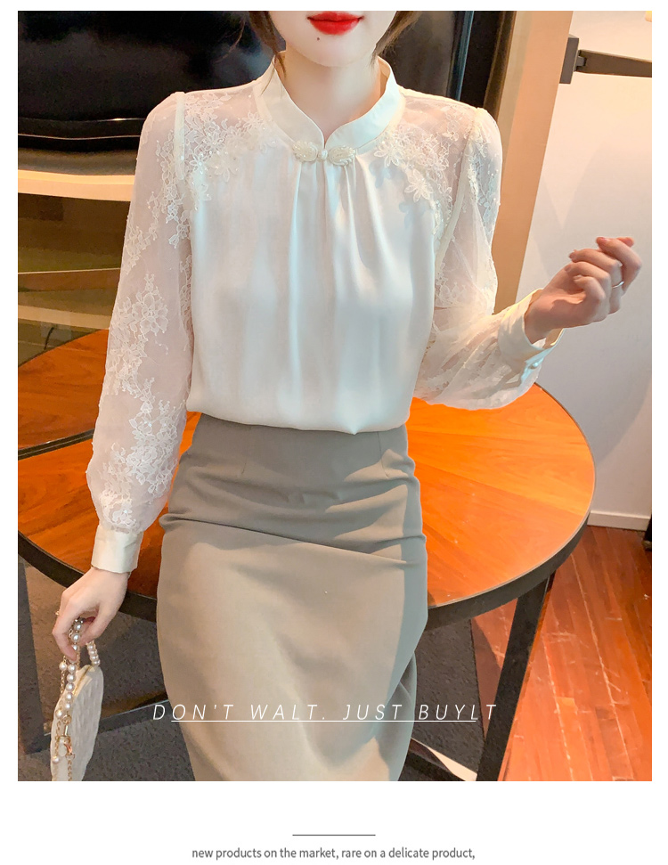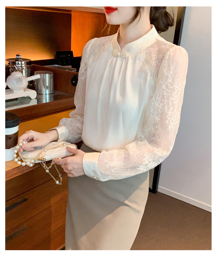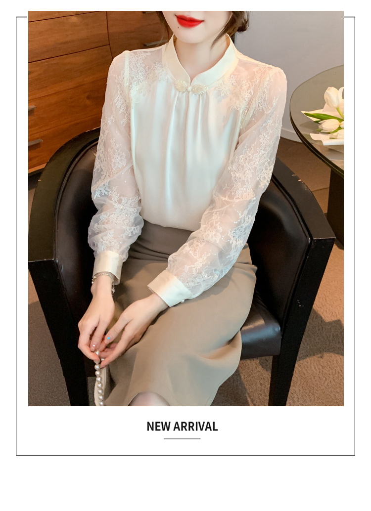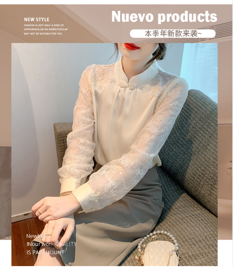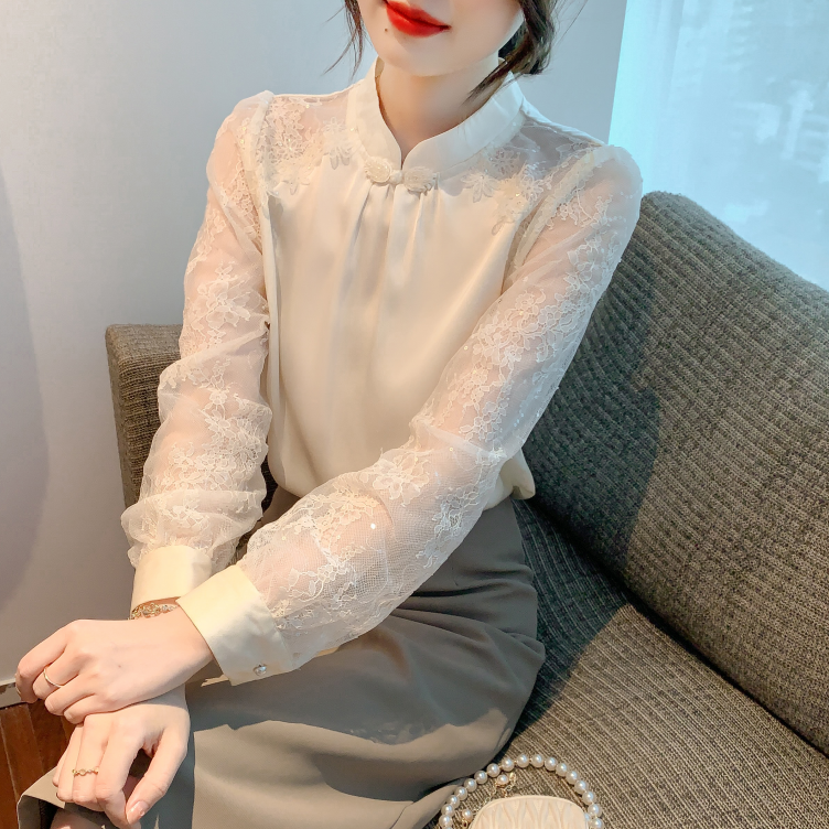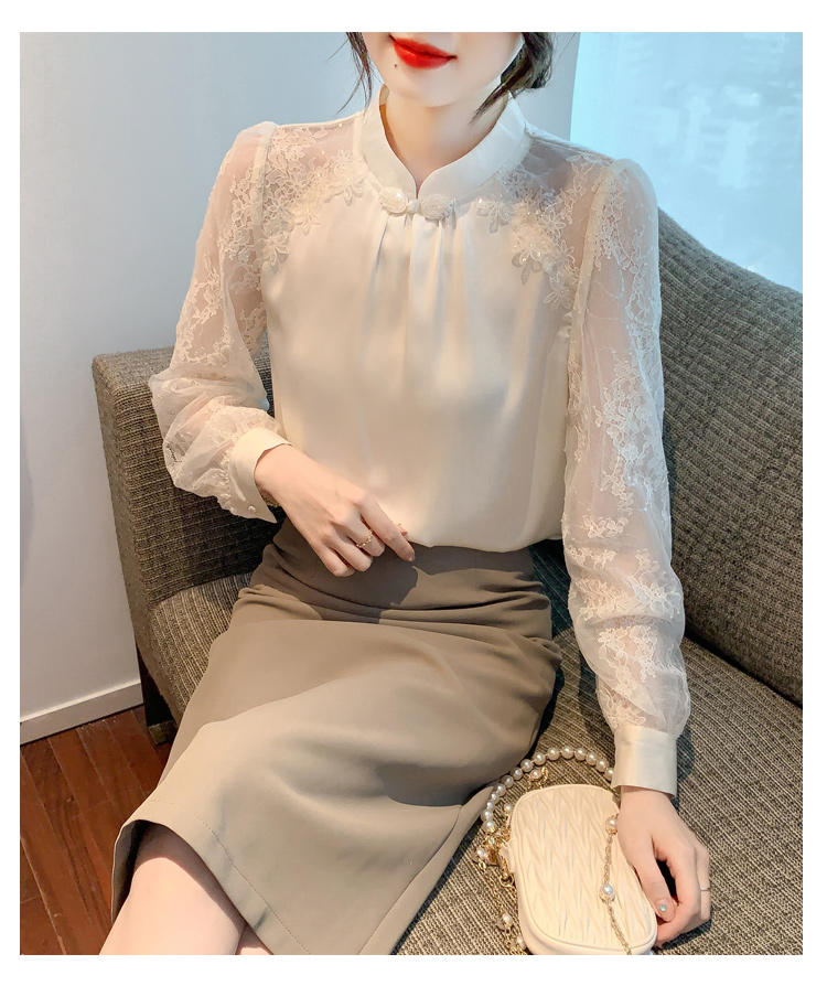 MY15902# 新款中式立领盘扣醋酸缎面衬衫女蕾丝拼接小衫上衣女裝貨源服裝批發