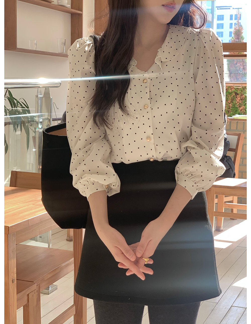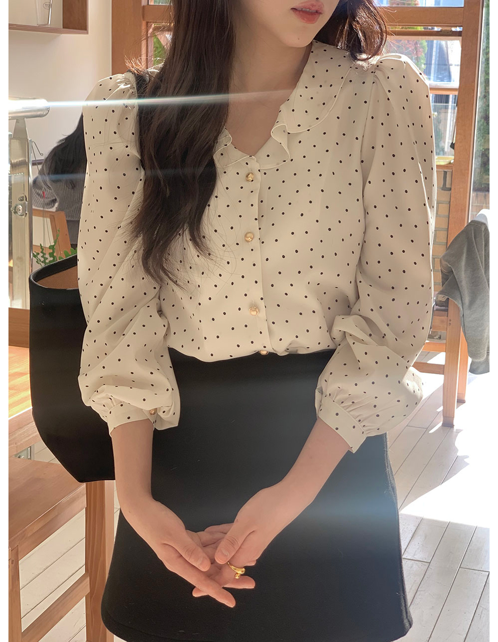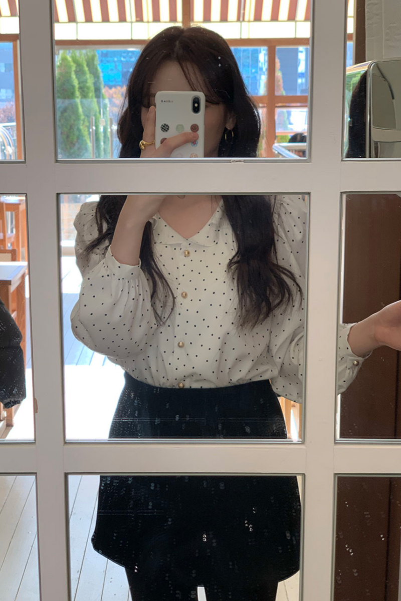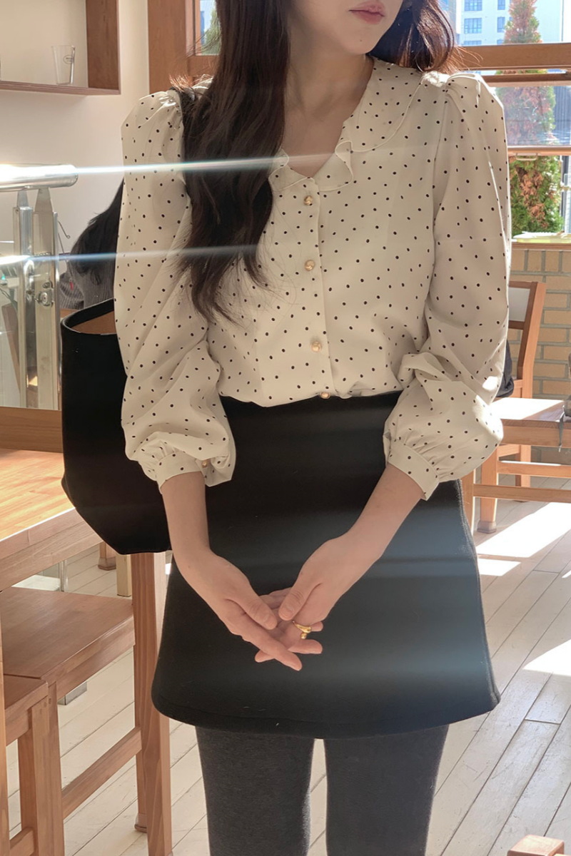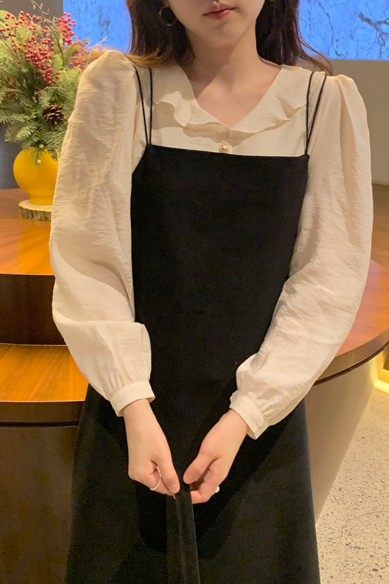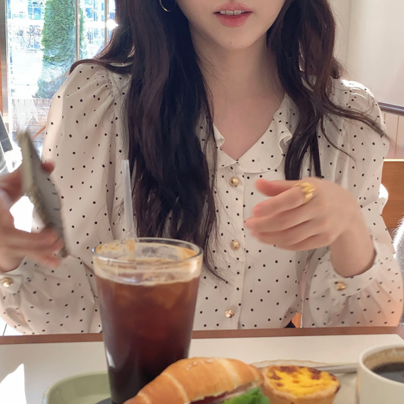 MY15909# KOREA 法式轻熟氧气感娃娃领撞色金扣点缀泡泡长袖上衣衬衫女女裝貨源服裝批發
