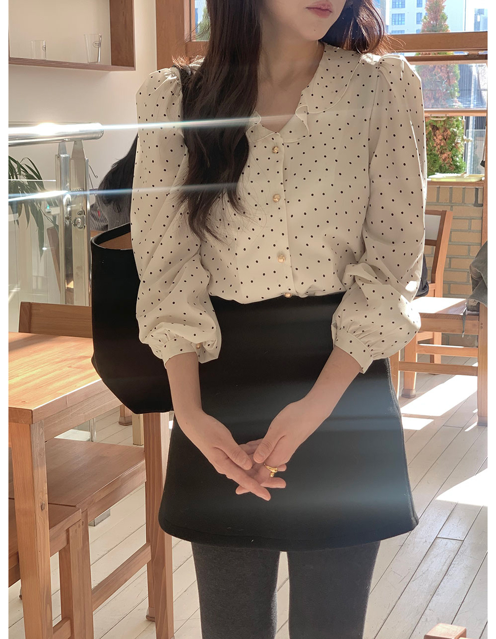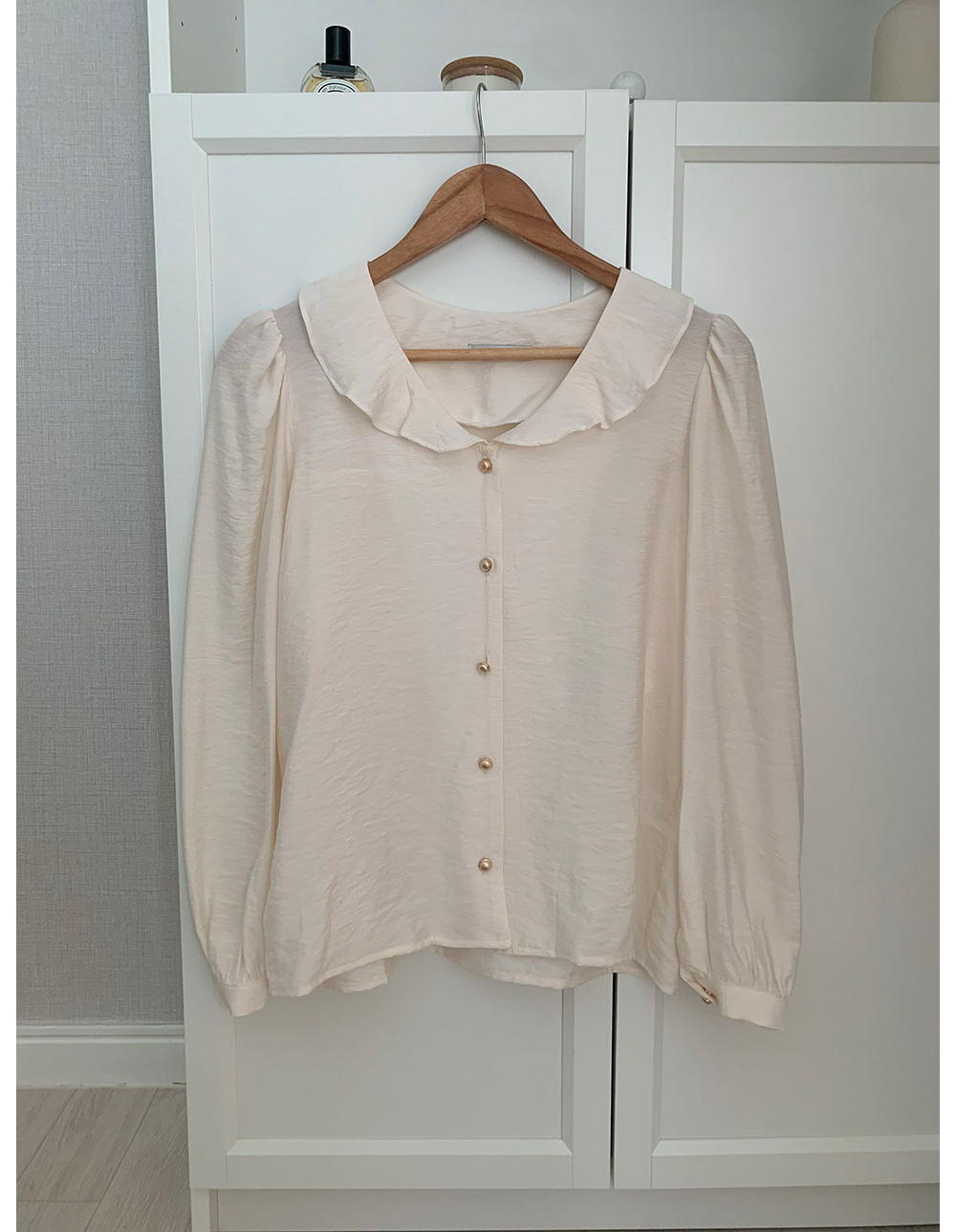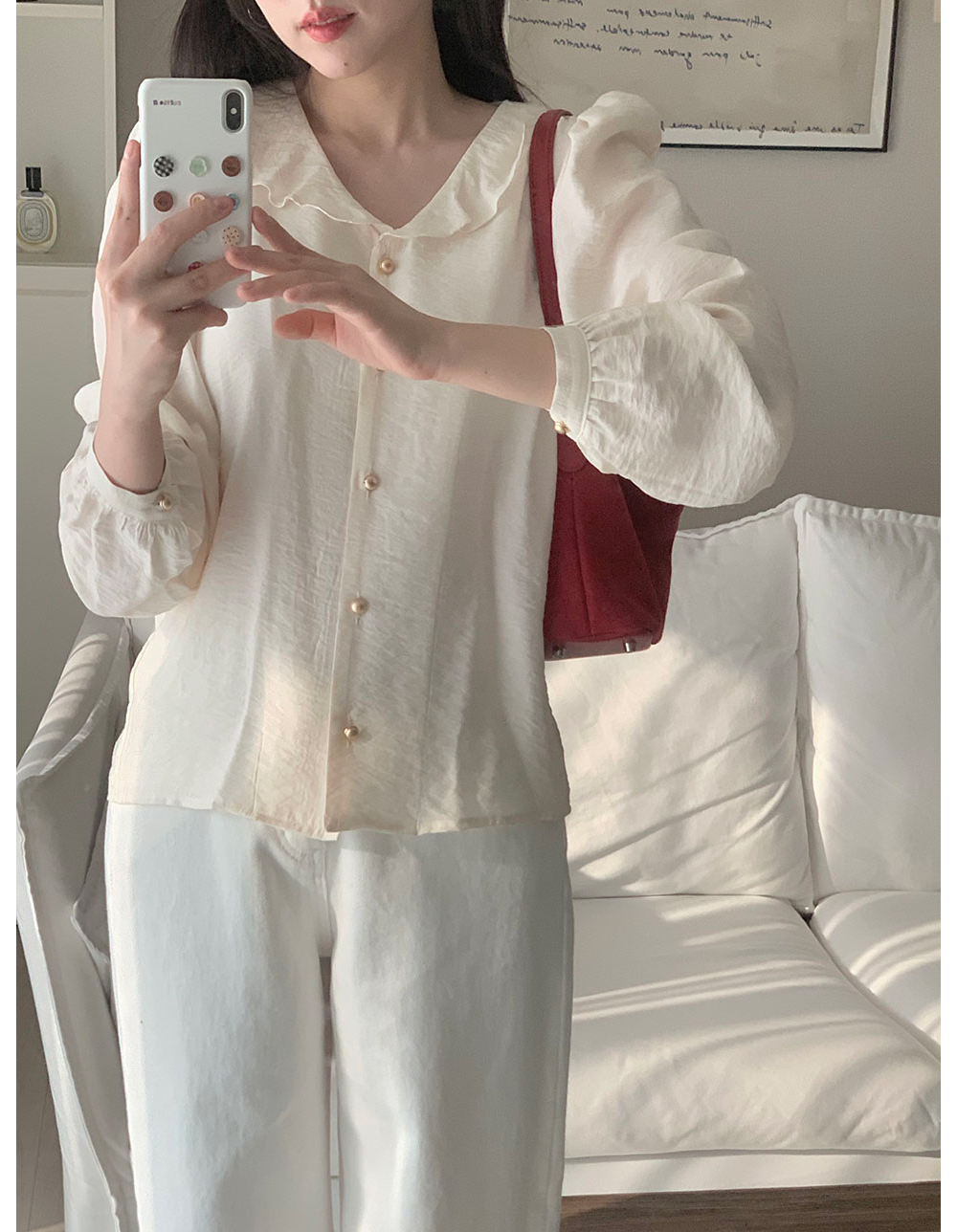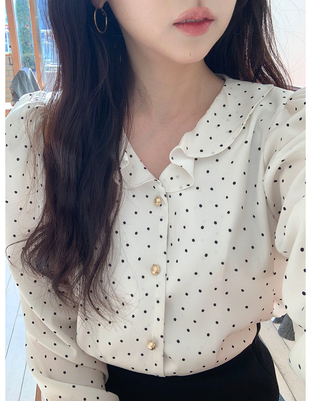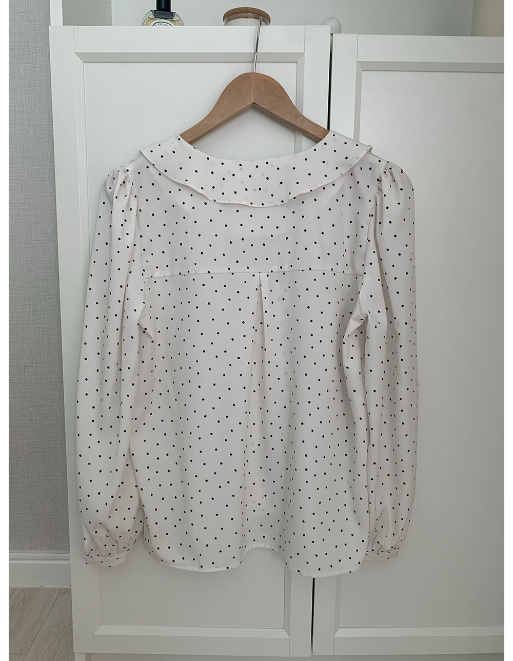 MY15909# KOREA 法式轻熟氧气感娃娃领撞色金扣点缀泡泡长袖上衣衬衫女女裝貨源服裝批發