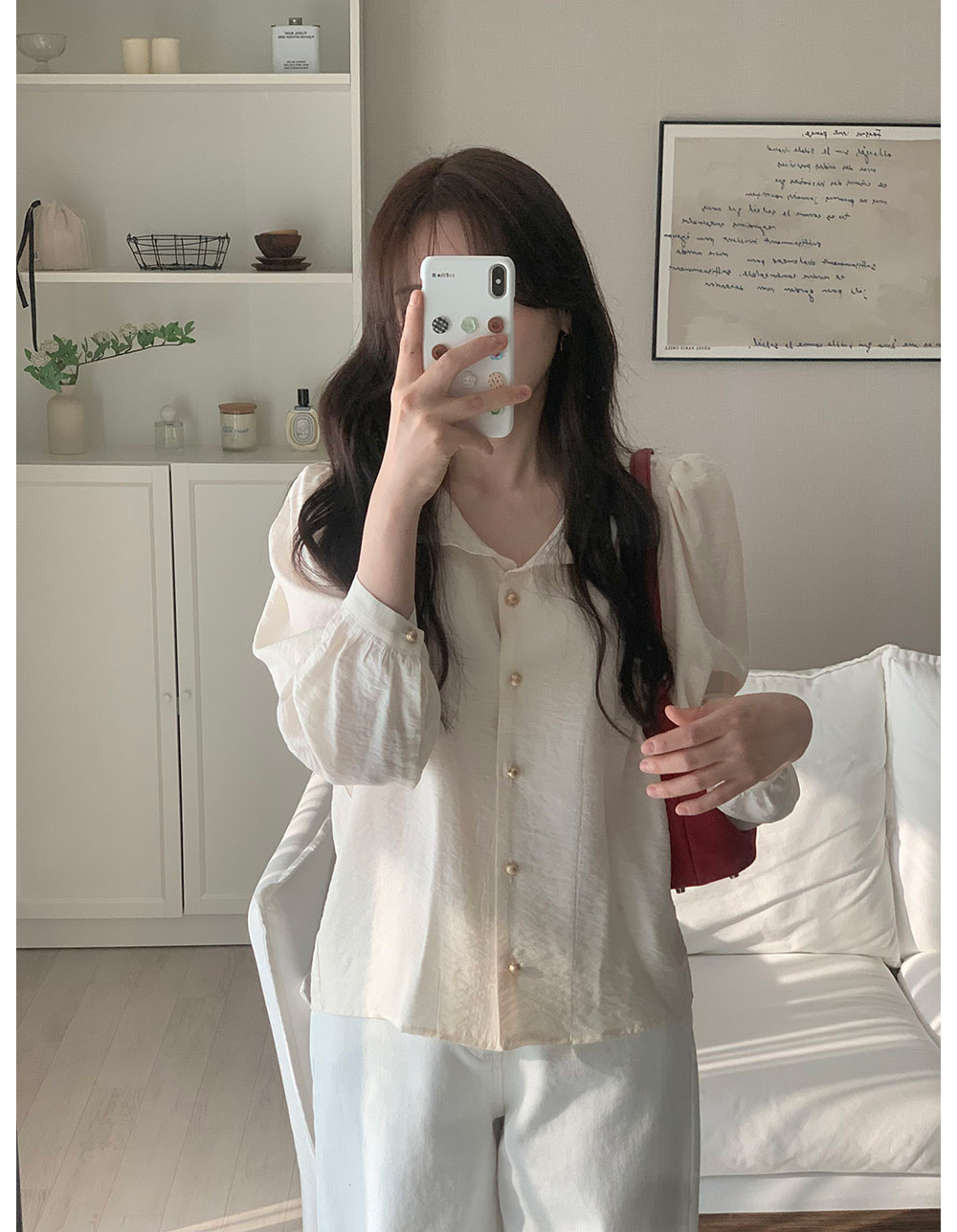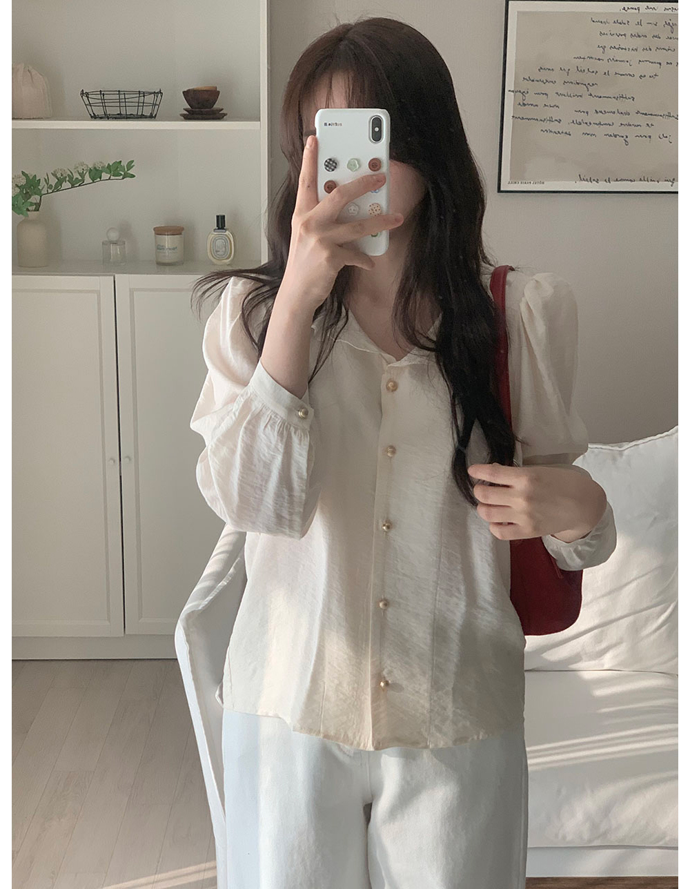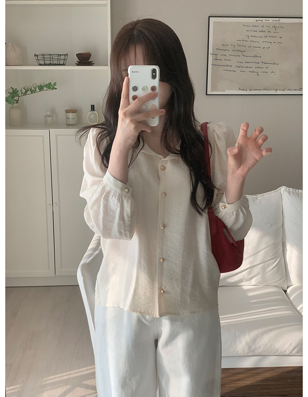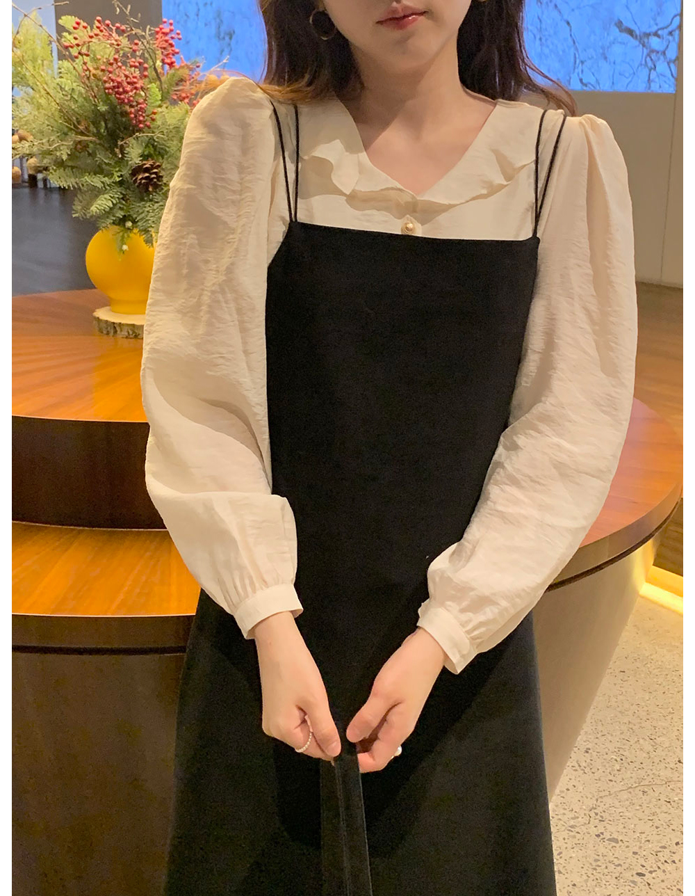 MY15909# KOREA 法式轻熟氧气感娃娃领撞色金扣点缀泡泡长袖上衣衬衫女女裝貨源服裝批發
