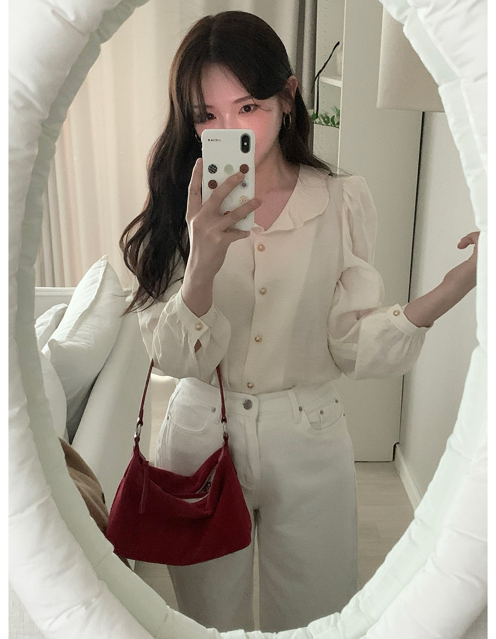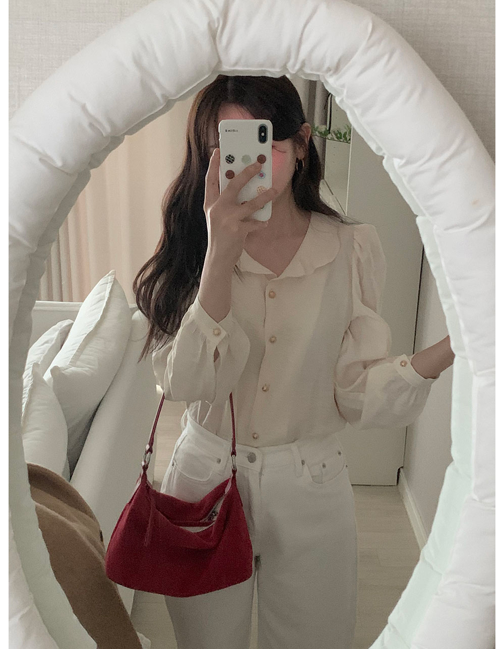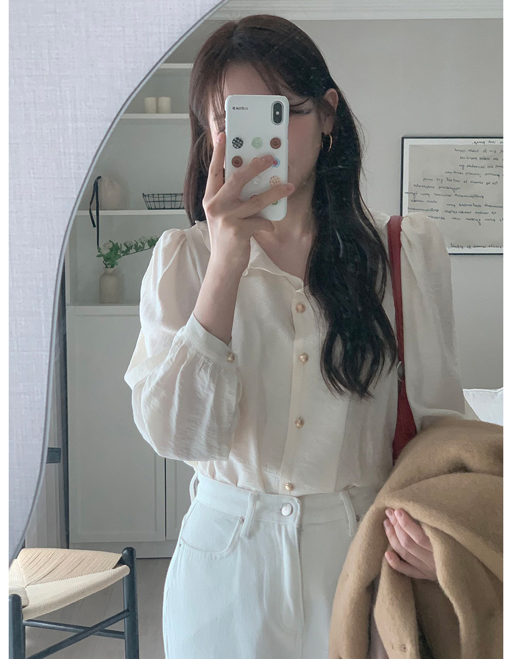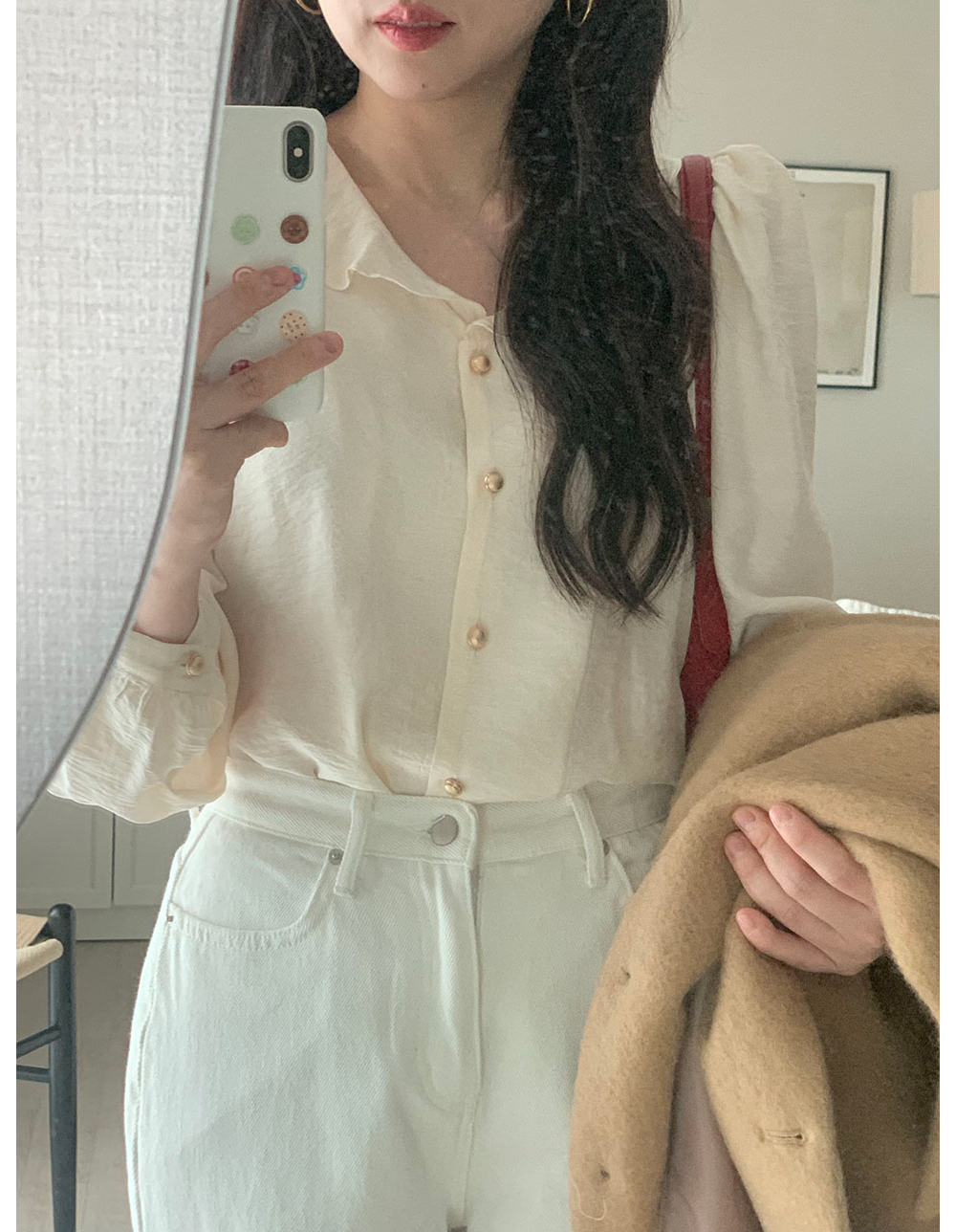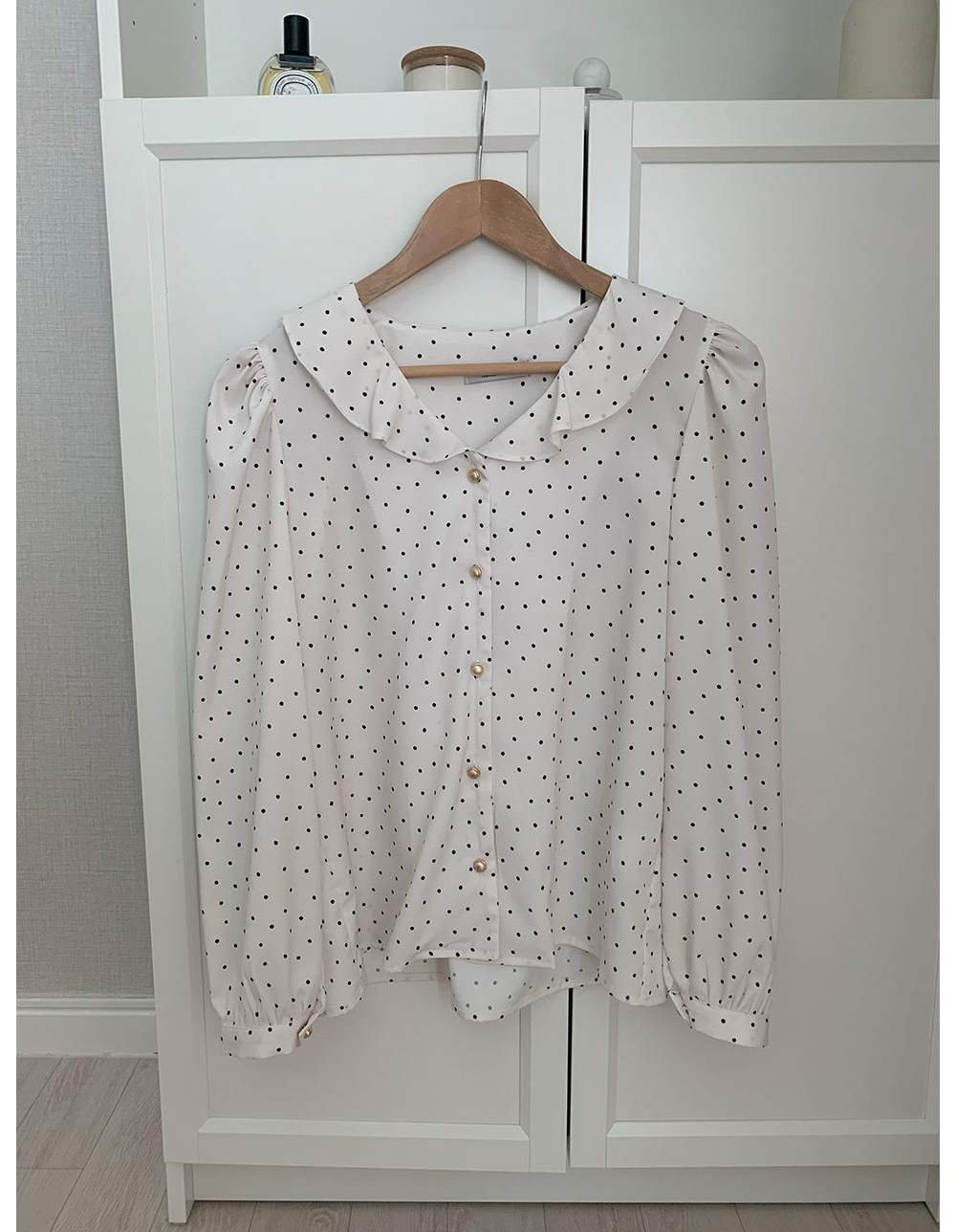 MY15909# KOREA 法式轻熟氧气感娃娃领撞色金扣点缀泡泡长袖上衣衬衫女女裝貨源服裝批發