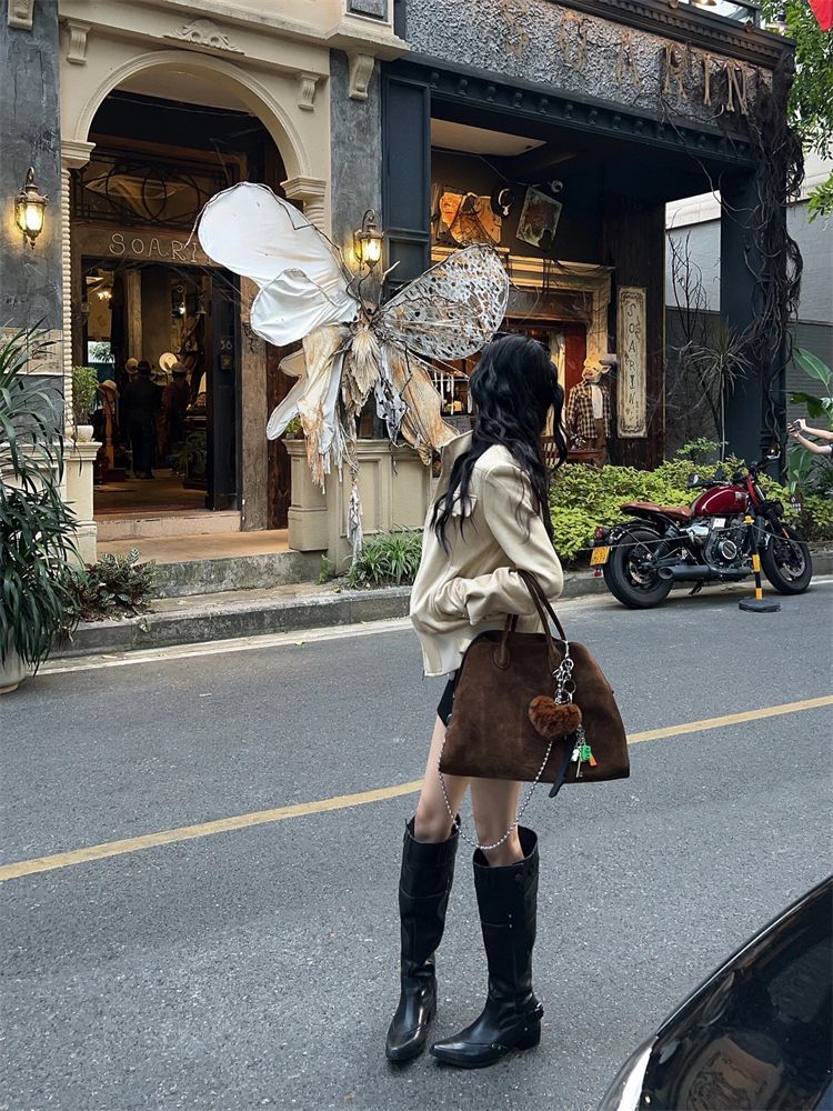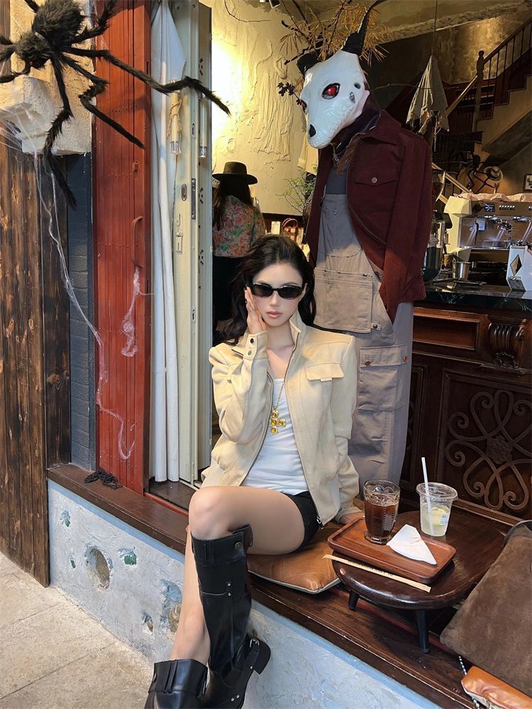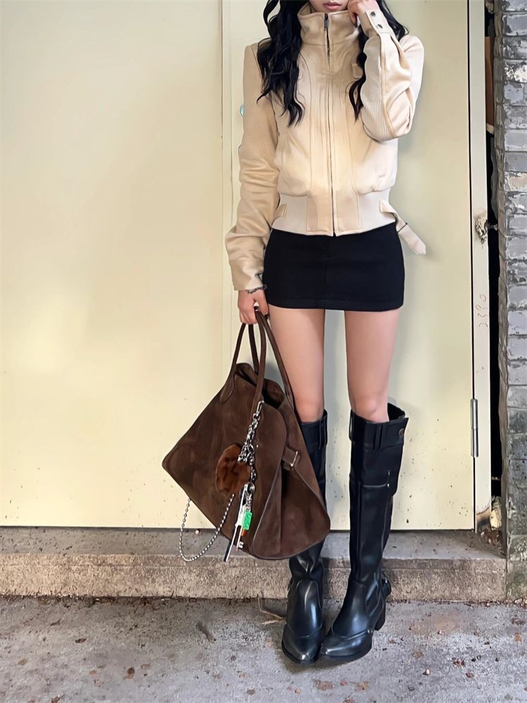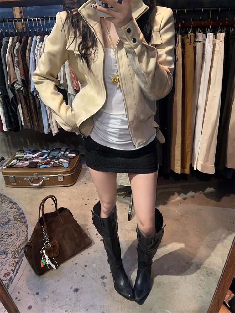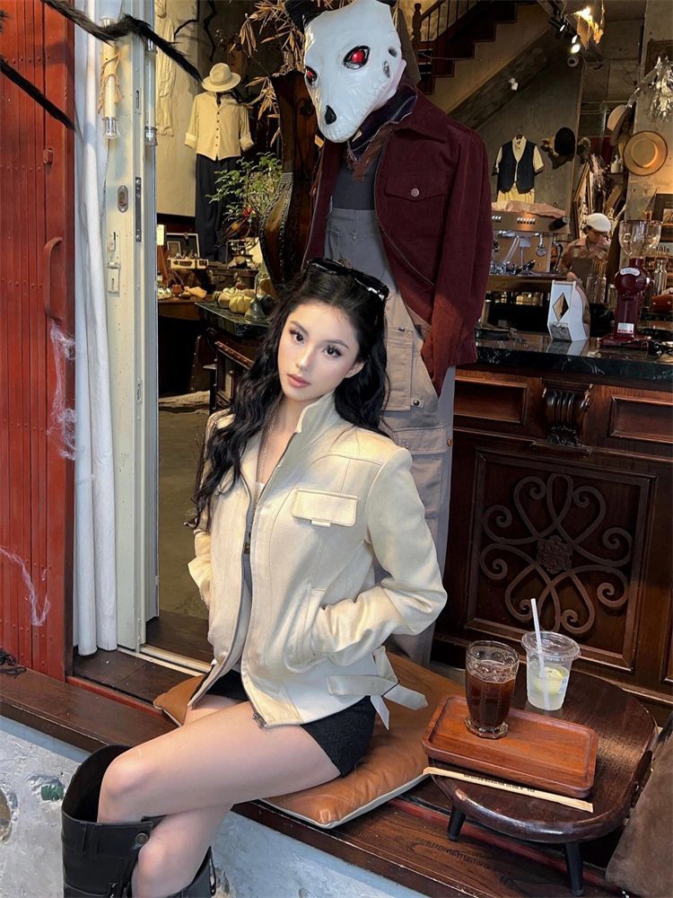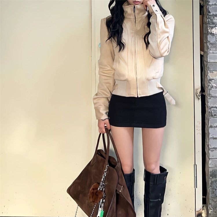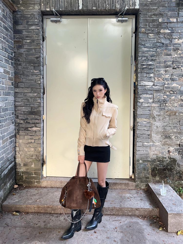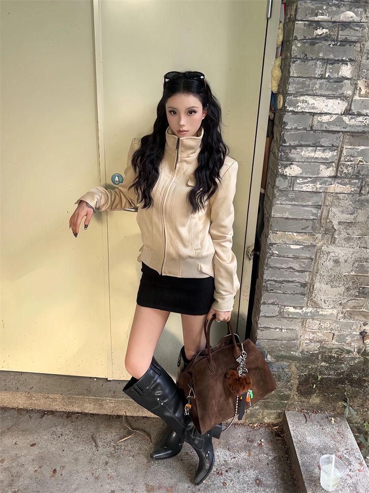 MY15913# 复古鹿皮绒立领长袖夹克外套女美式机车服宽松设计感气质上衣女裝貨源服裝批發