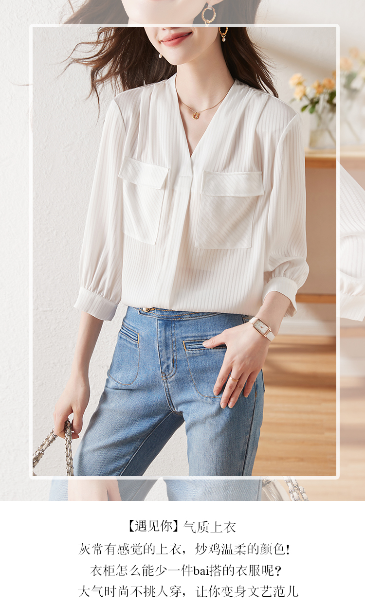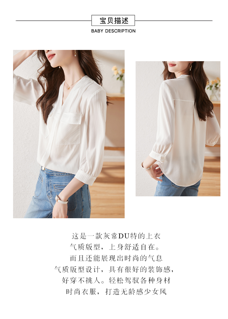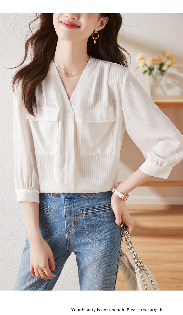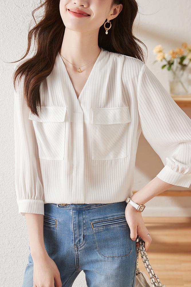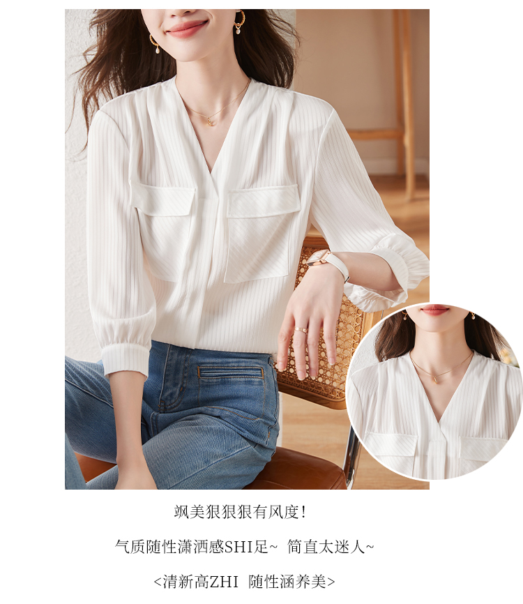 MY15917# 时尚白色V领衬衫上衣新款小个子通勤百搭七分袖衬衣女裝貨源服裝批發