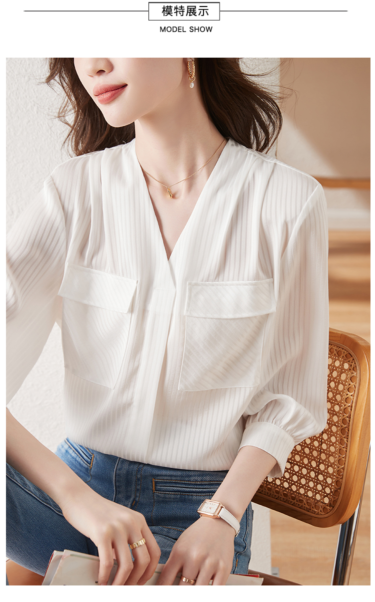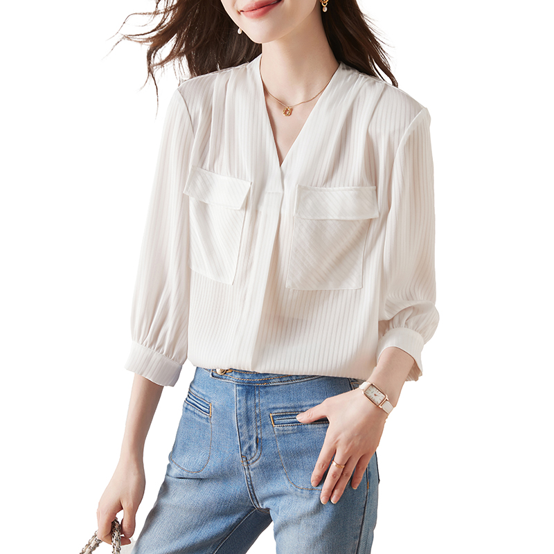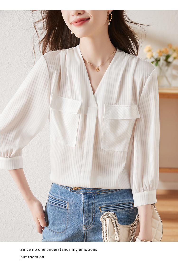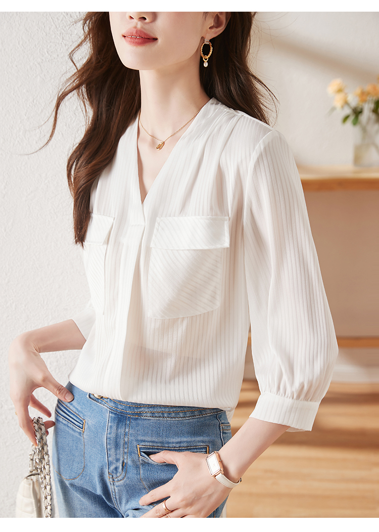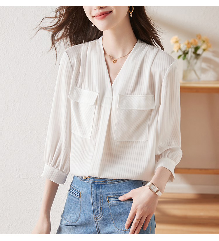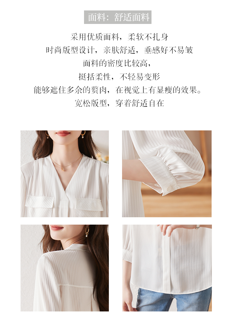 MY15917# 时尚白色V领衬衫上衣新款小个子通勤百搭七分袖衬衣女裝貨源服裝批發