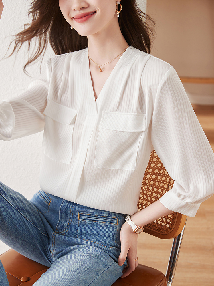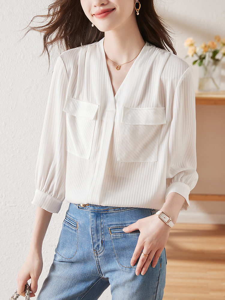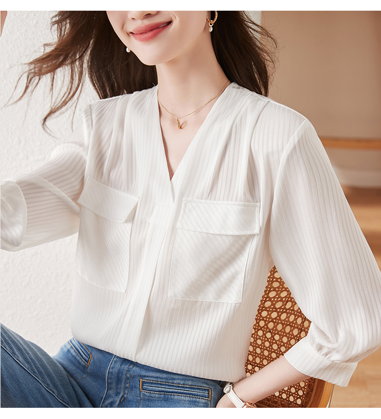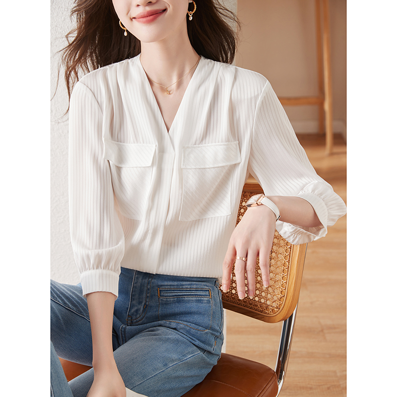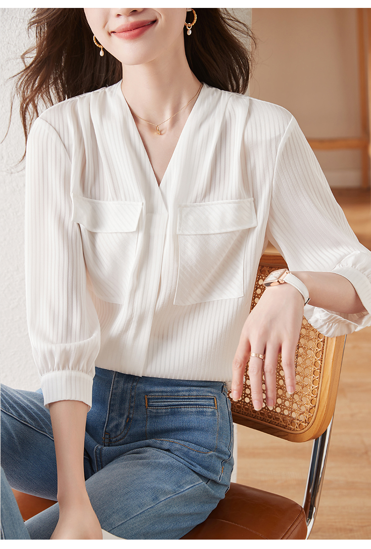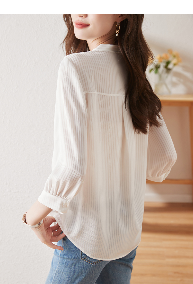 MY15917# 时尚白色V领衬衫上衣新款小个子通勤百搭七分袖衬衣女裝貨源服裝批發
