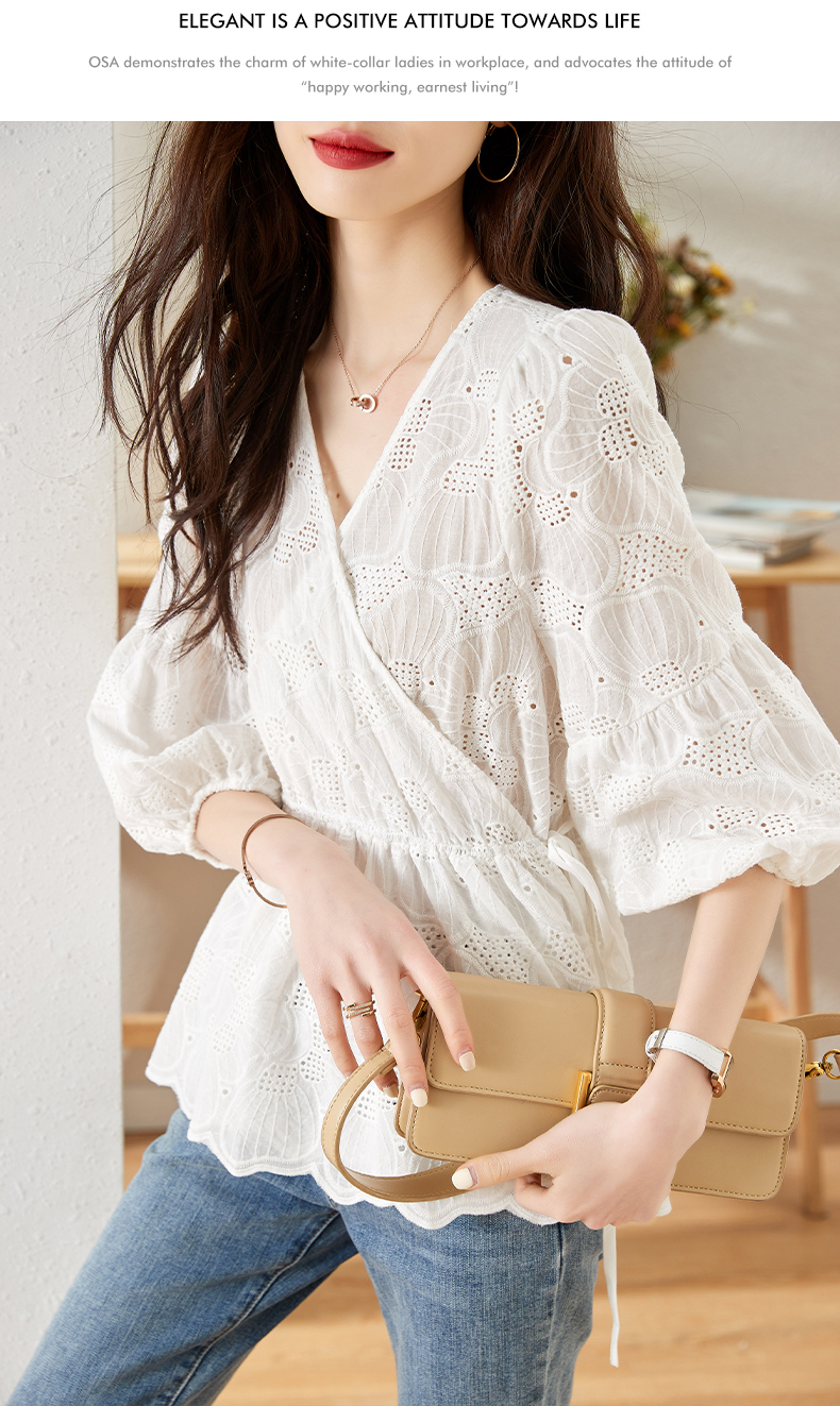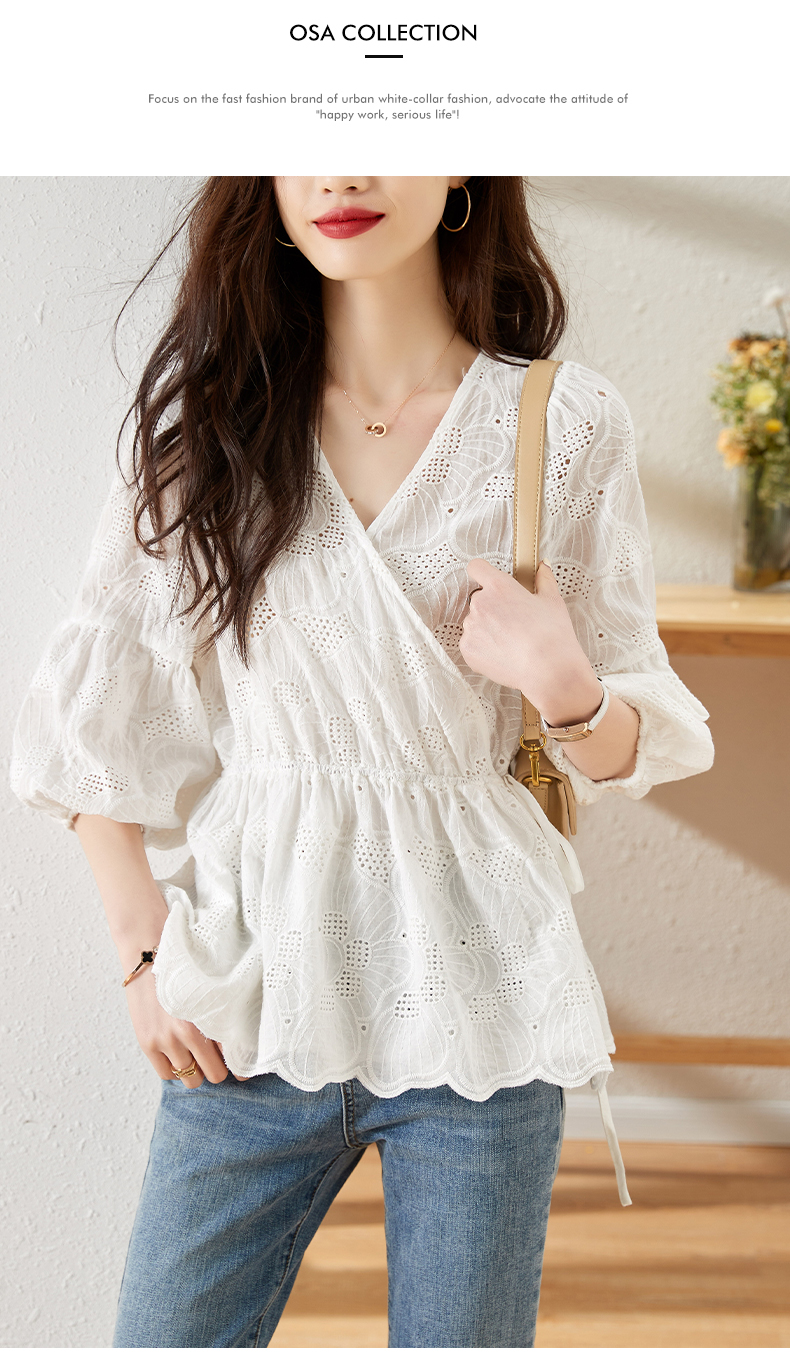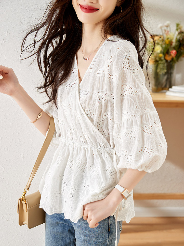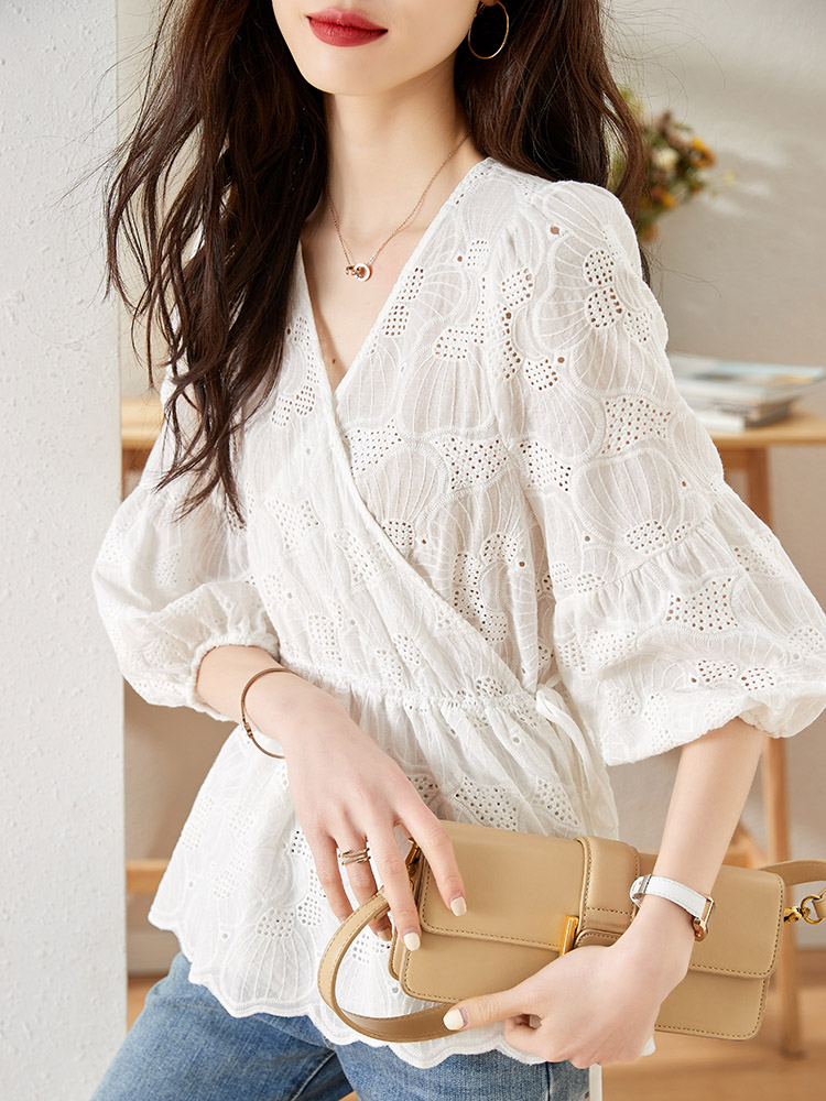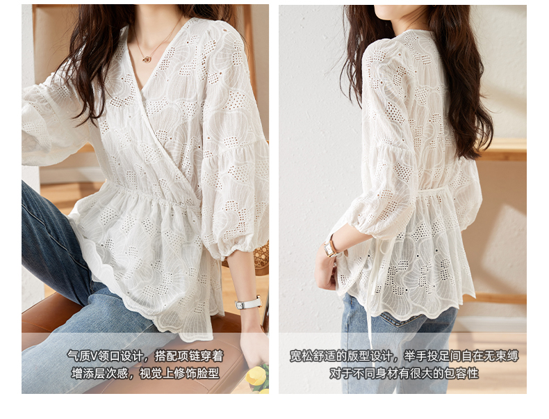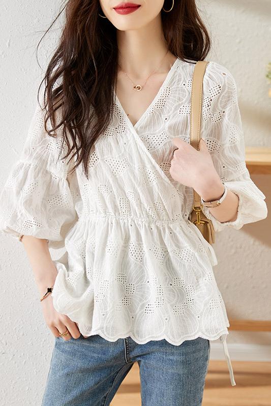 MY15930# 镂空刺绣V领雪纺上衣新款女宽松洋气长袖收腰娃娃衫女裝貨源服裝批發