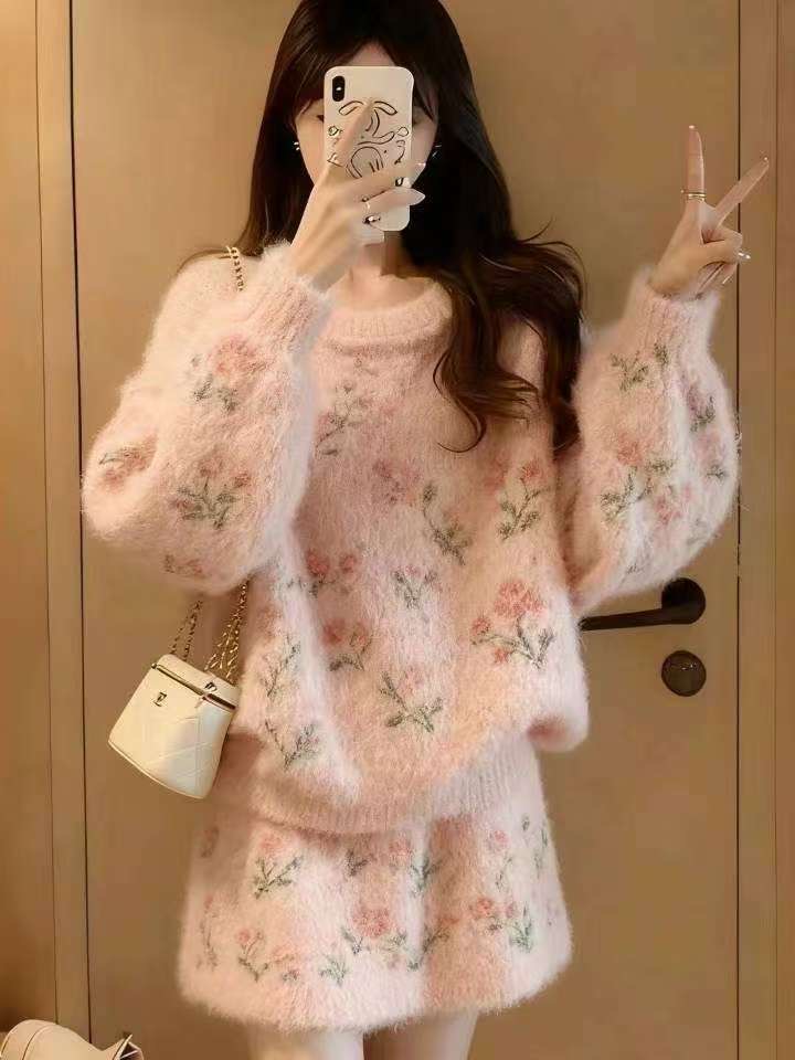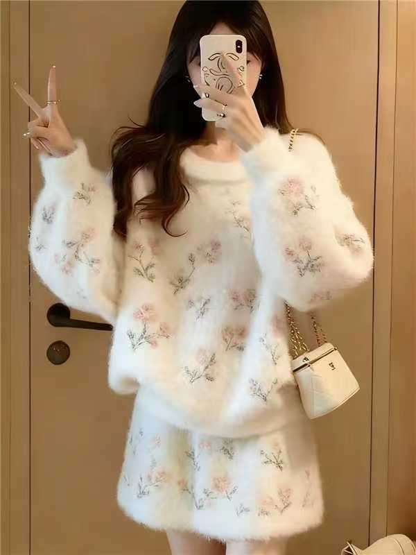 MY15934# 穿搭一整套超火独特漂亮氛围感圣诞白色针织毛衣套装裙子女裝貨源服裝批發