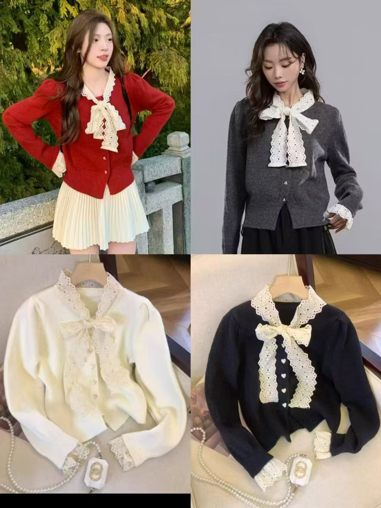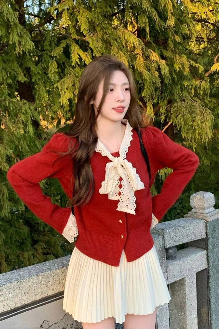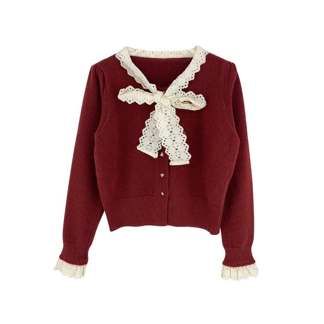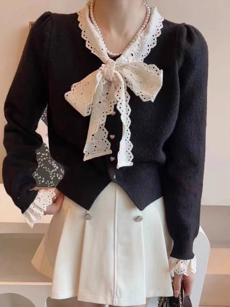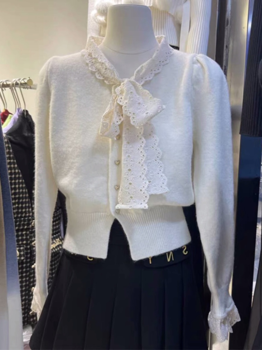 MY15938#女法式蕾丝系带针织开衫泡泡袖显瘦时髦外搭毛衣外套女裝貨源服裝批發