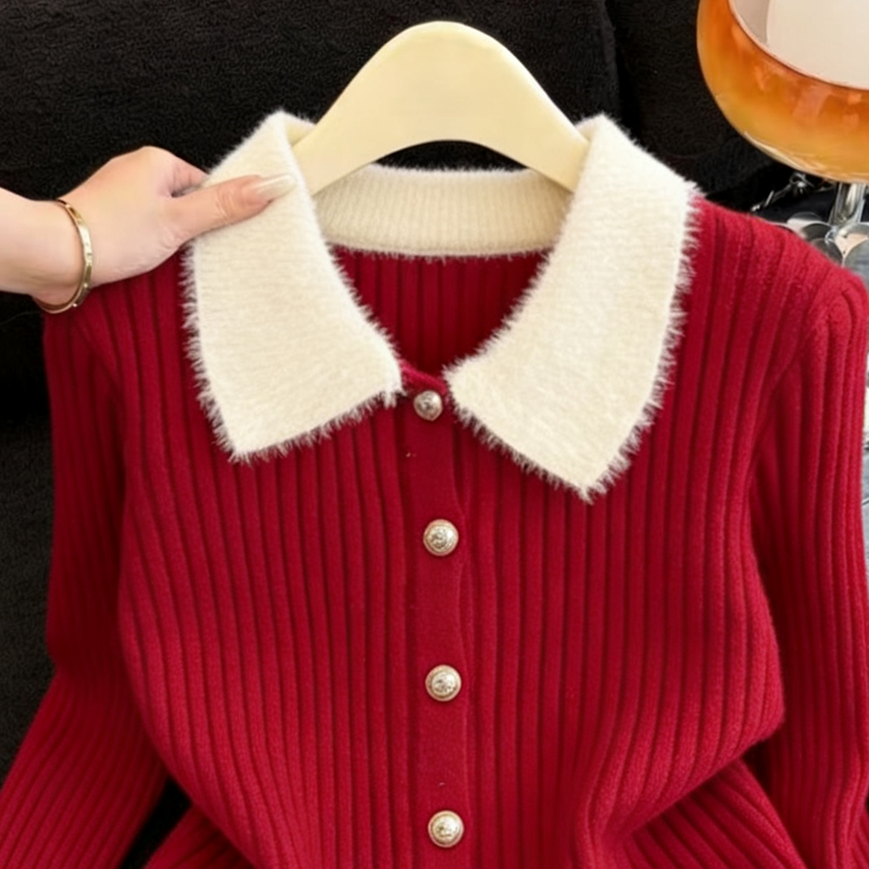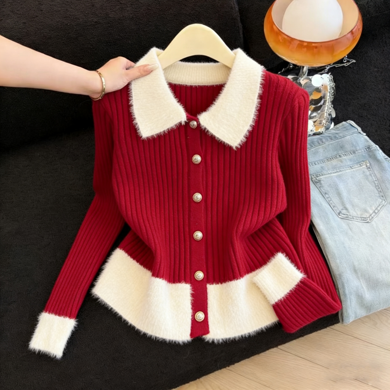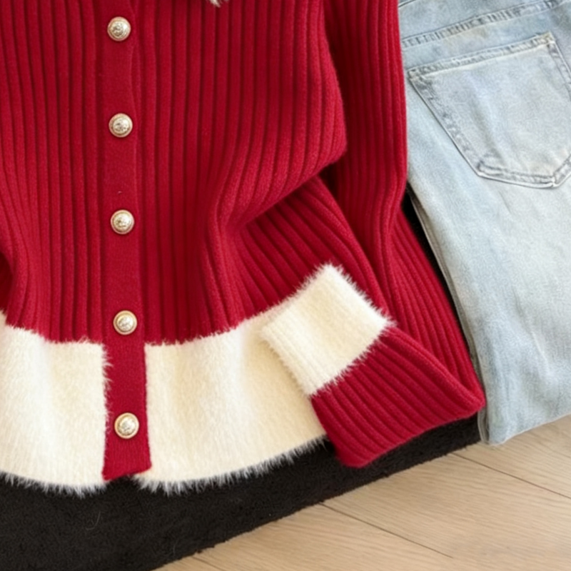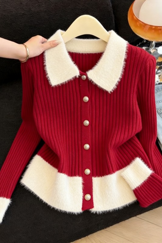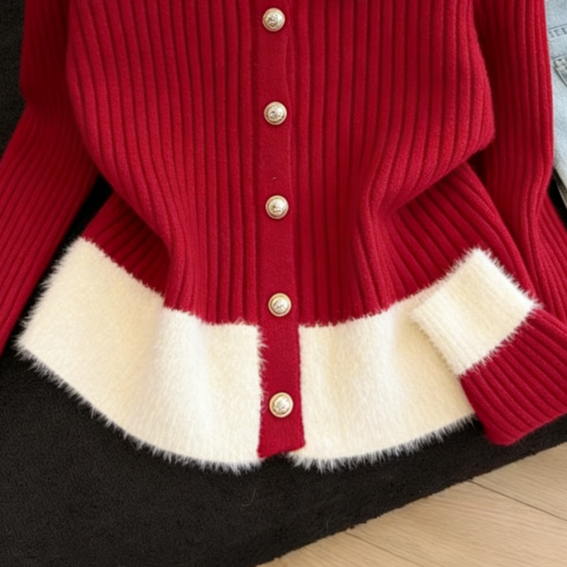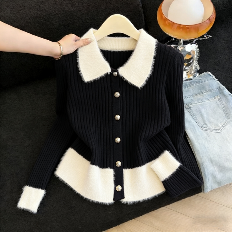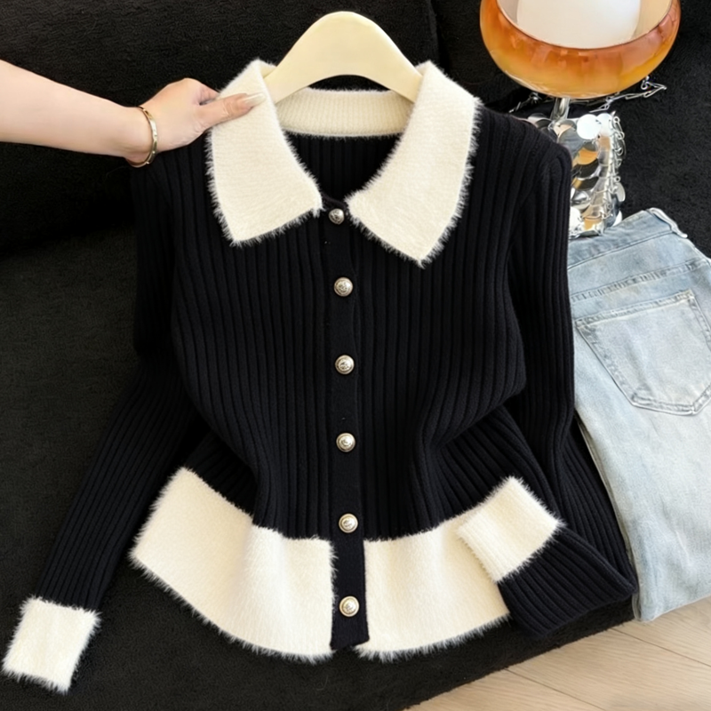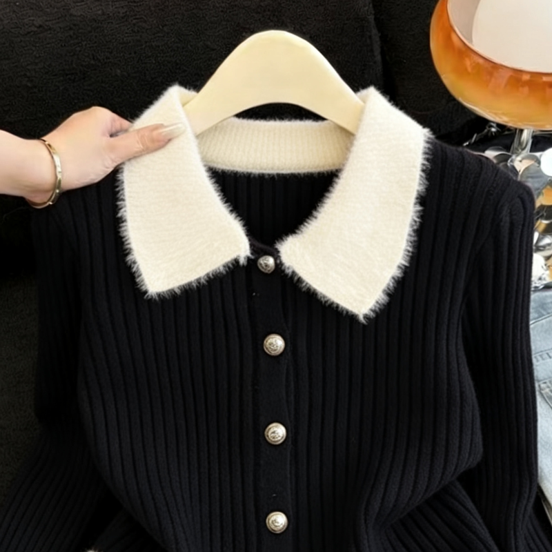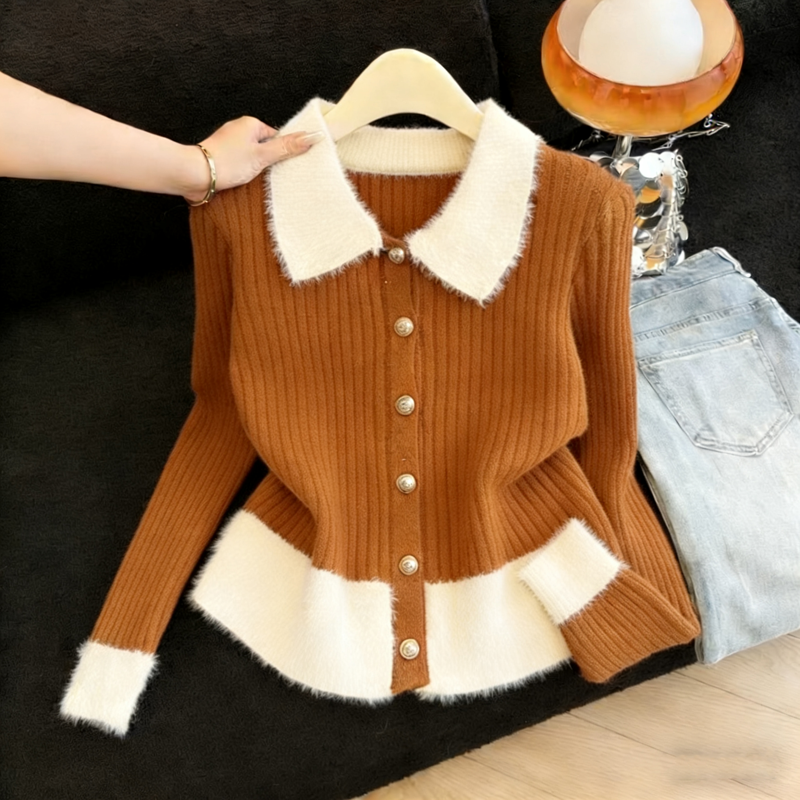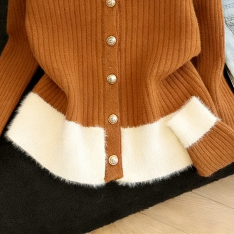 MY16190# 小香风软糯拼接毛绒绒毛衣开衫新款气质百搭显瘦长袖上衣女裝貨源服裝批發