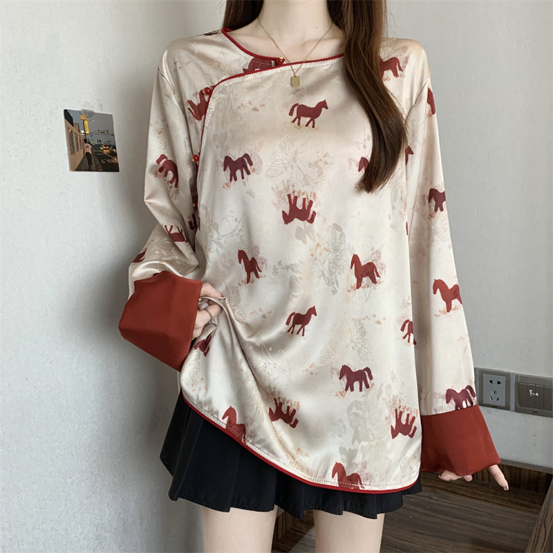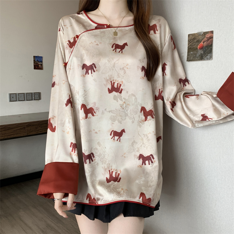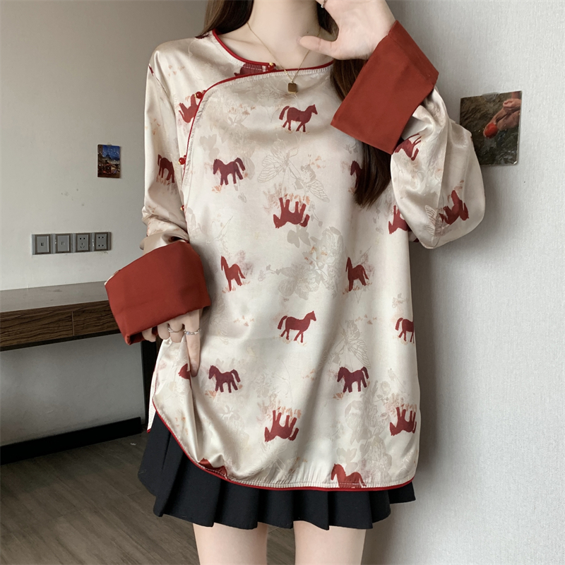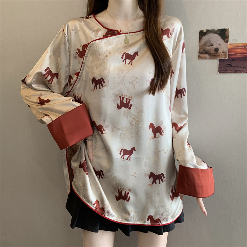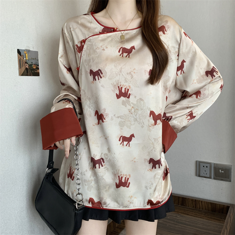 MY16204# 胖MM2026新中式盘扣上衣女复古国风小马印花拼接袖斜襟上衣女裝貨源服裝批發