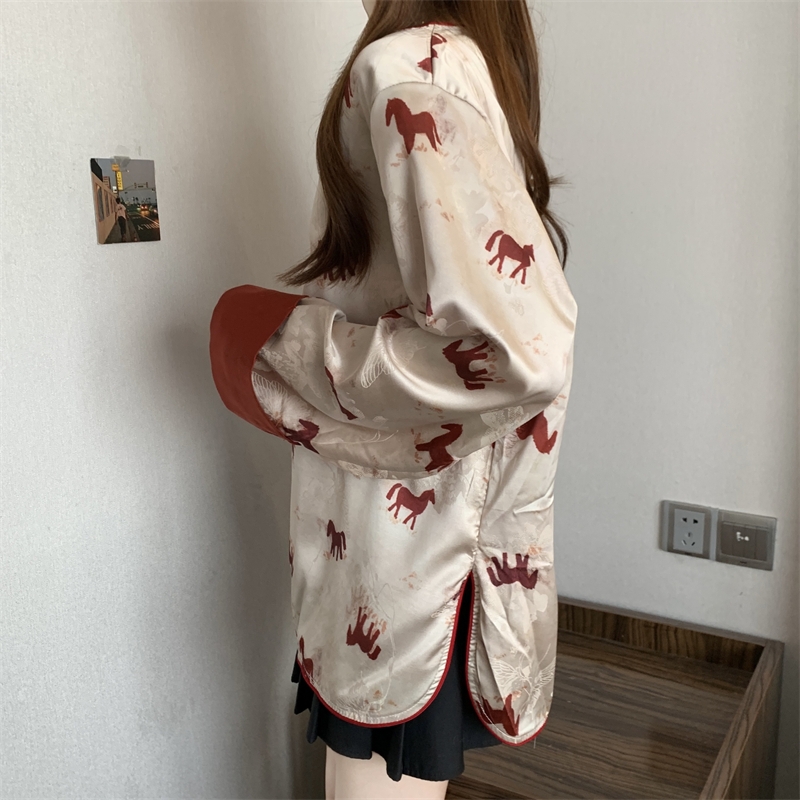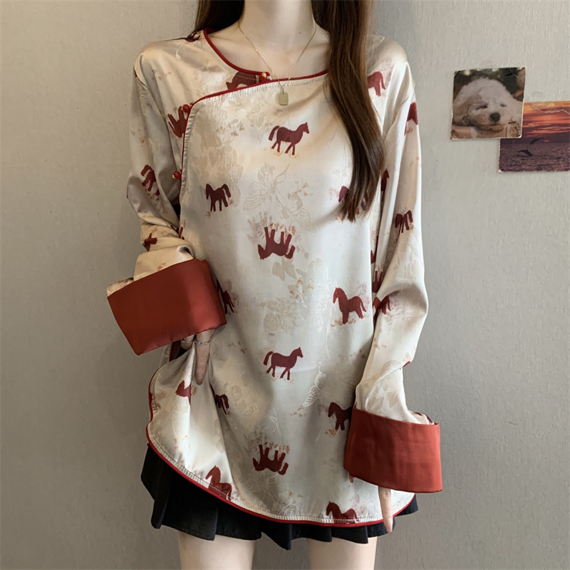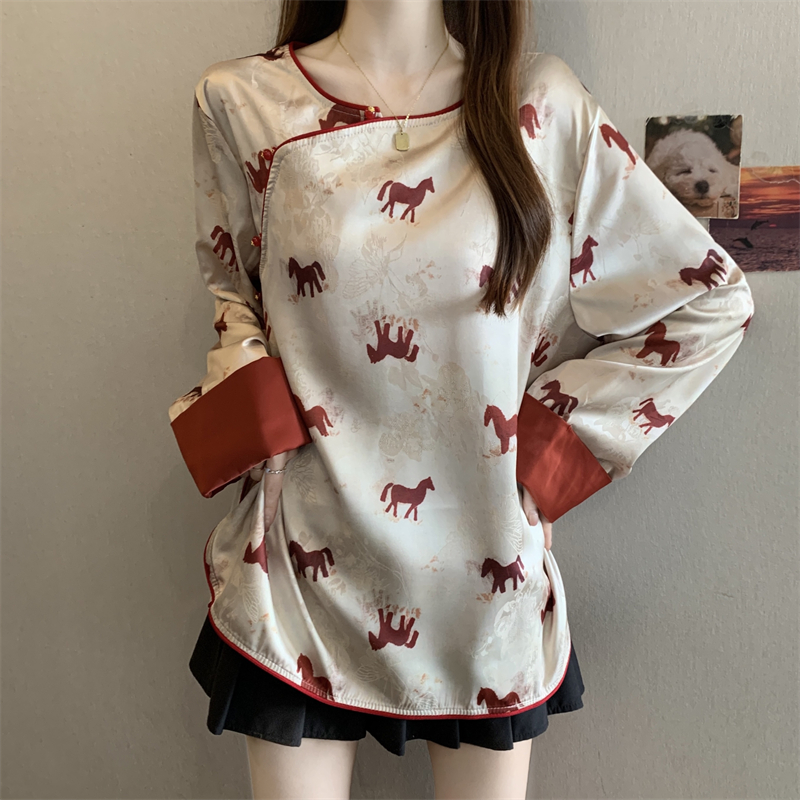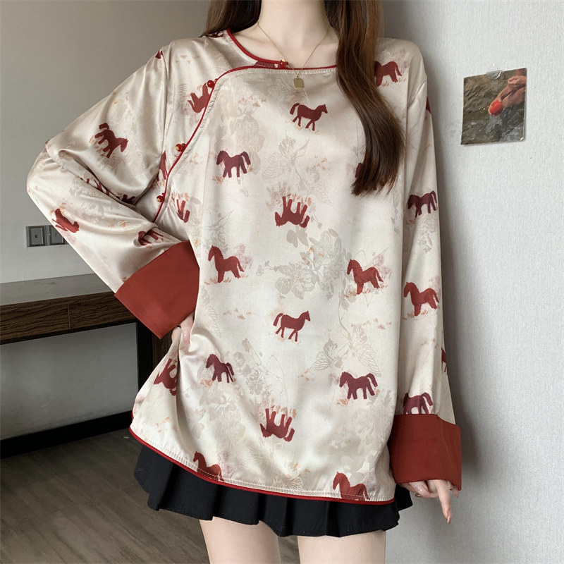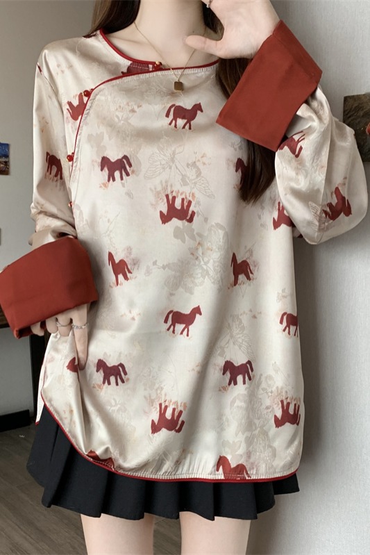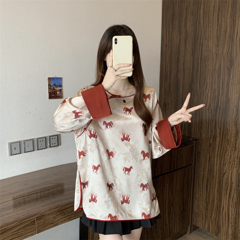 MY16204# 胖MM2026新中式盘扣上衣女复古国风小马印花拼接袖斜襟上衣女裝貨源服裝批發