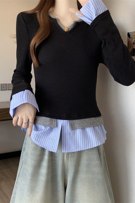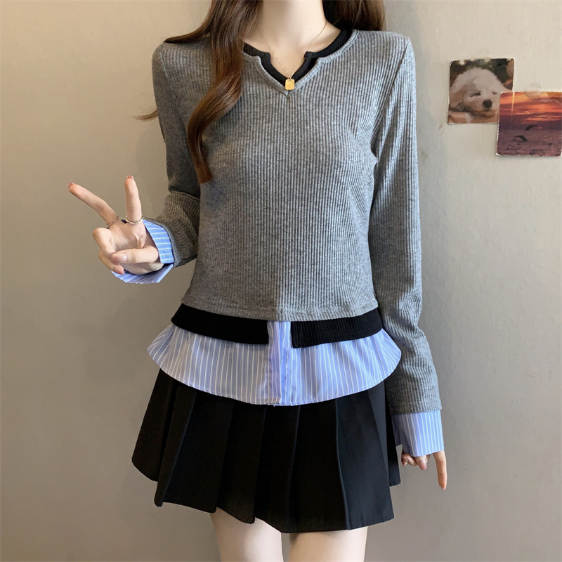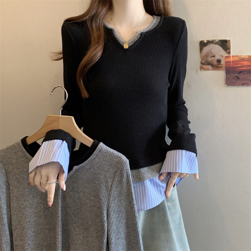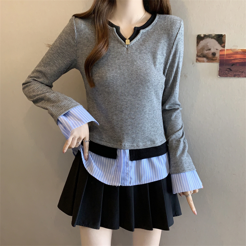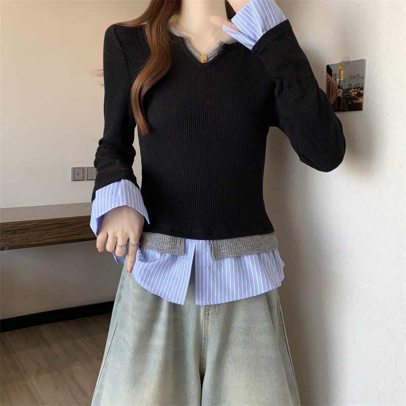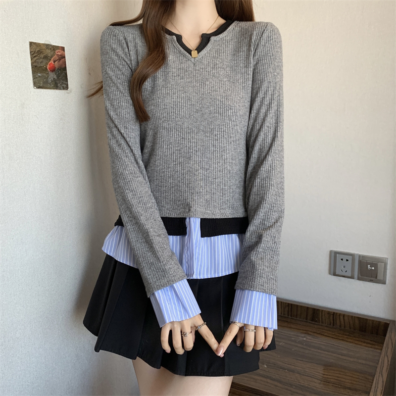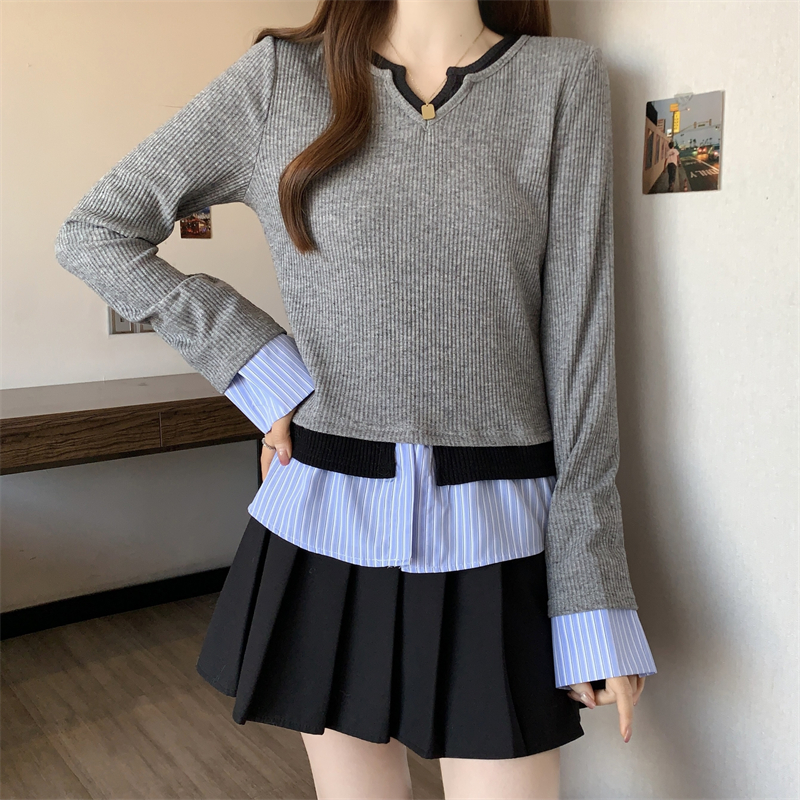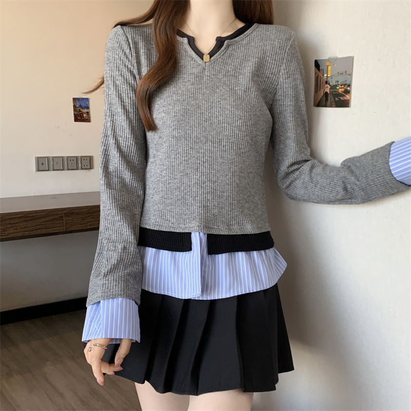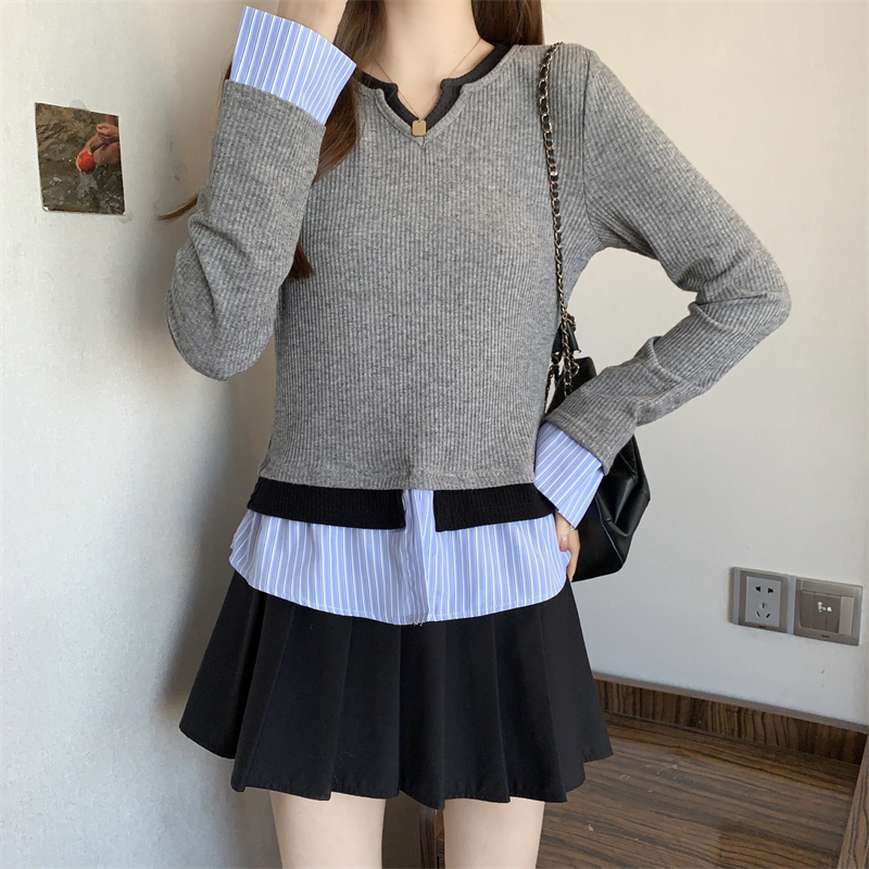 MY16206# 胖MM新款韩系时尚V领拼色假两件针织衫女长袖上衣女裝貨源服裝批發