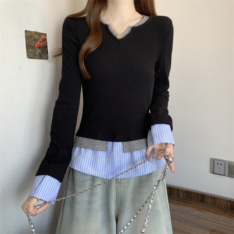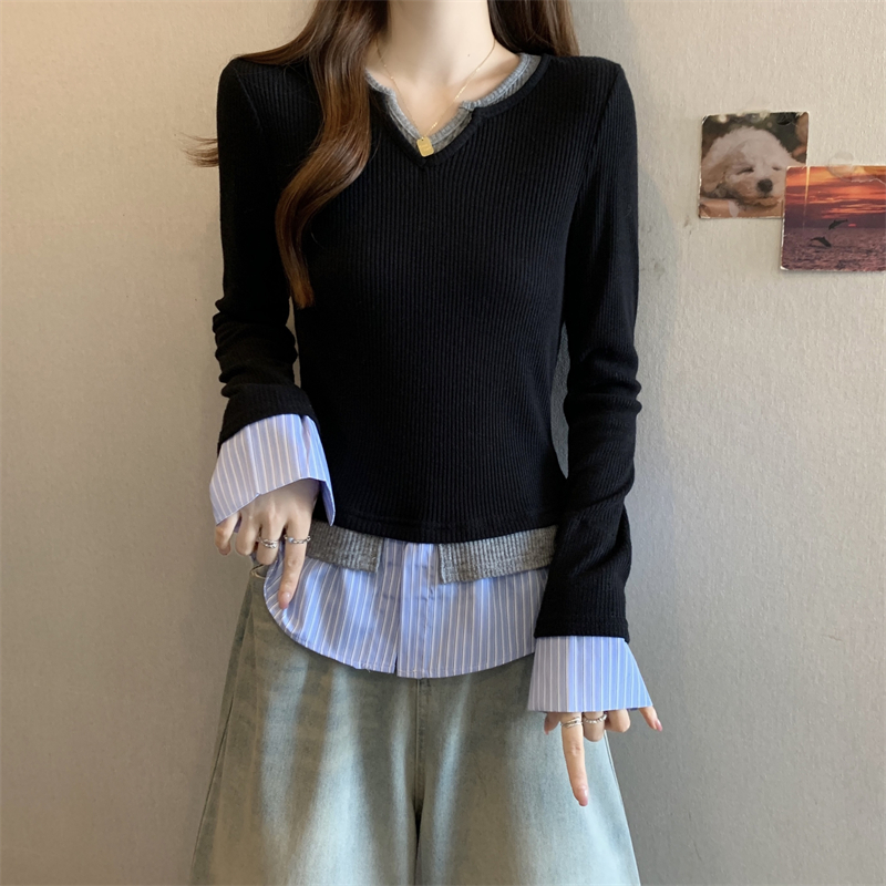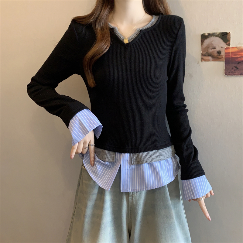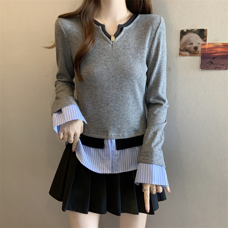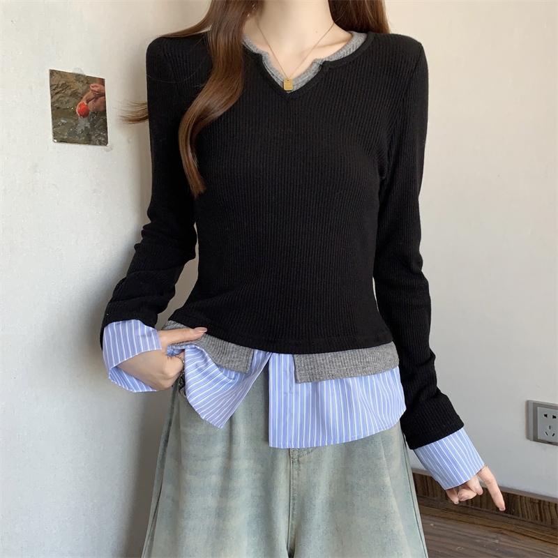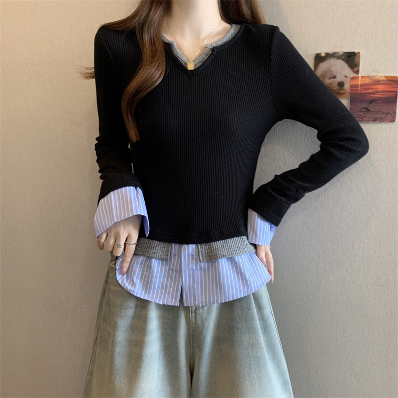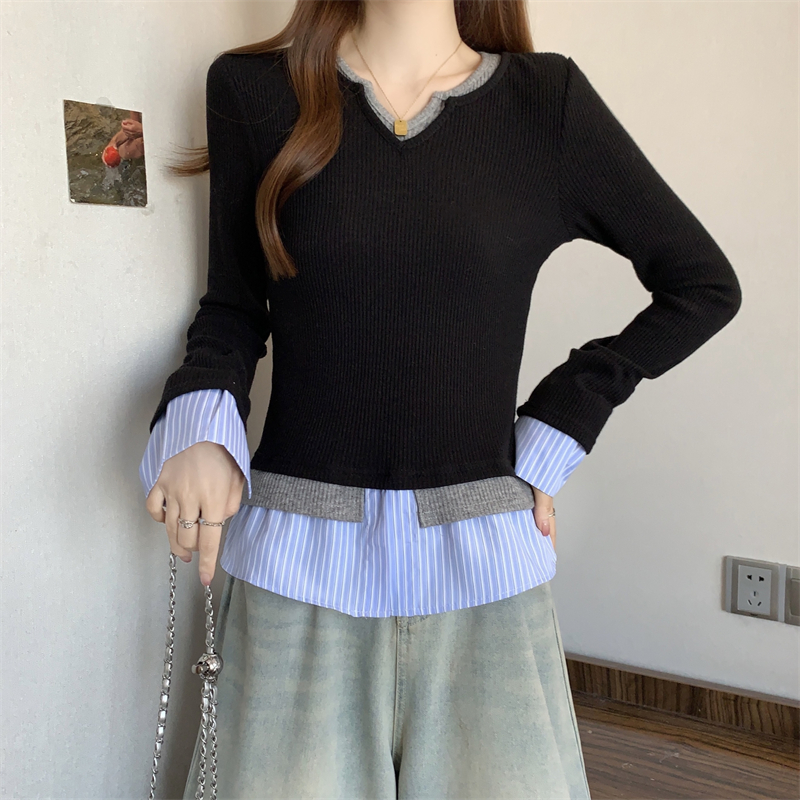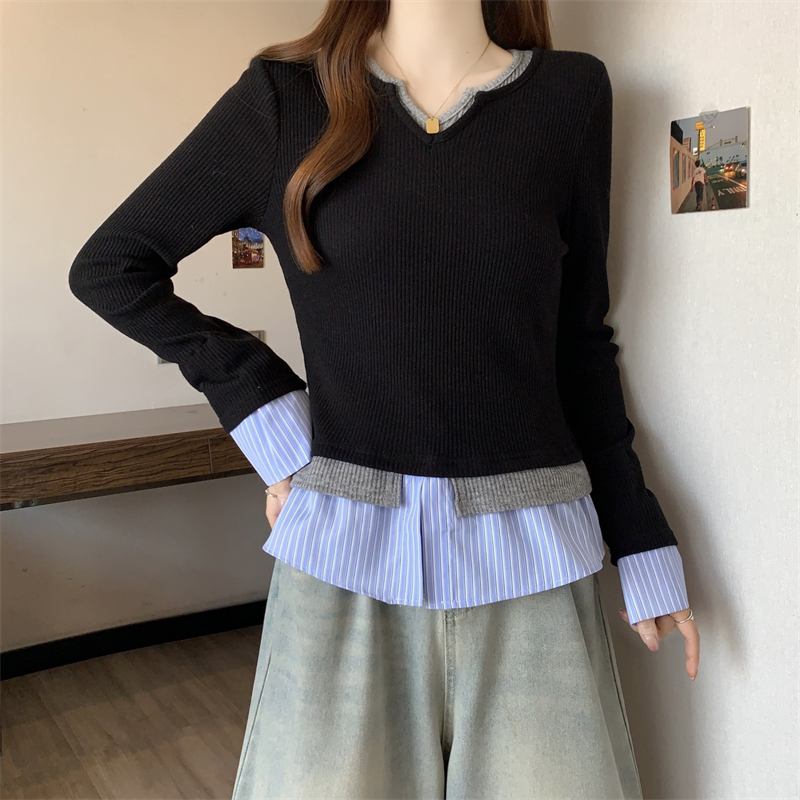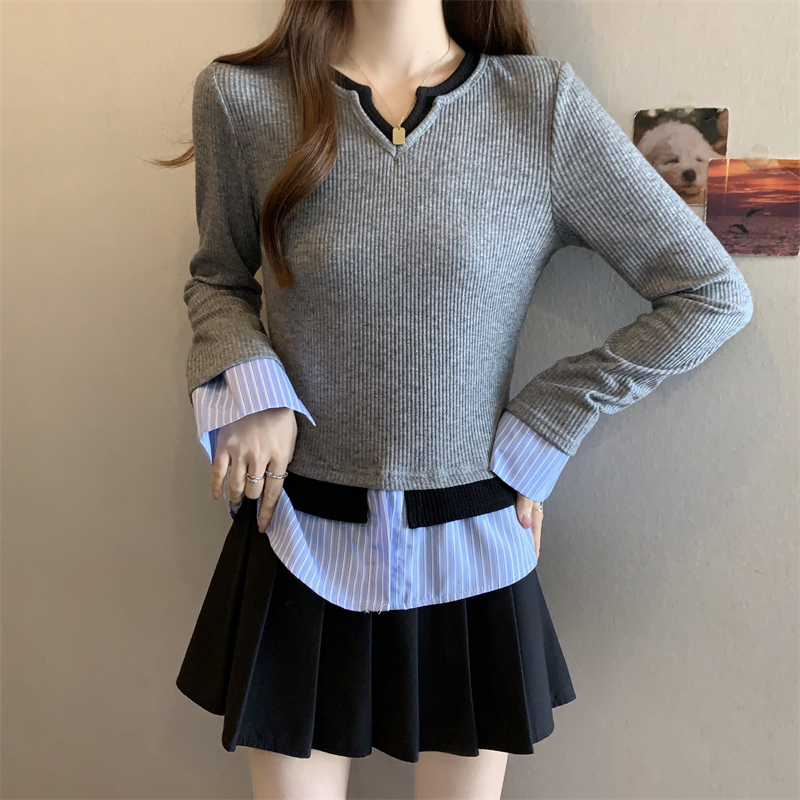 MY16206# 胖MM新款韩系时尚V领拼色假两件针织衫女长袖上衣女裝貨源服裝批發