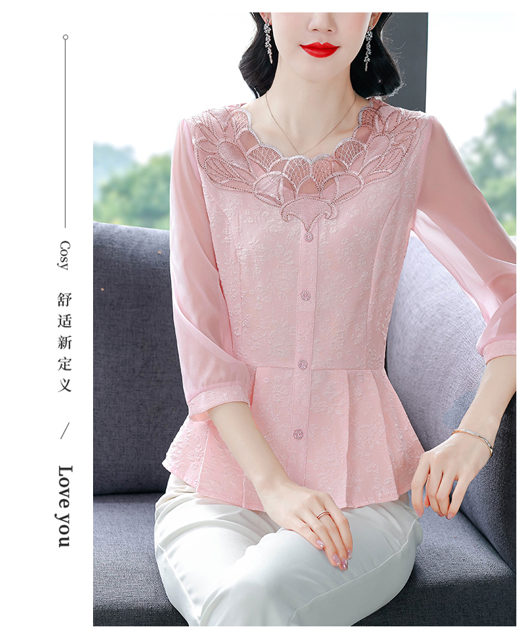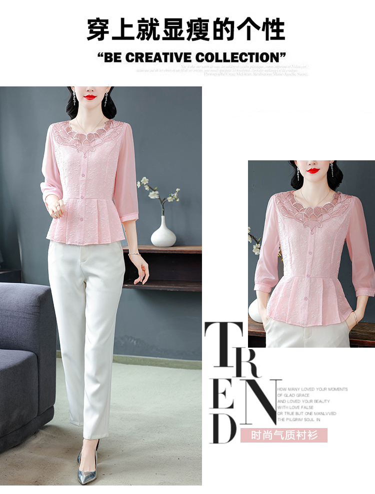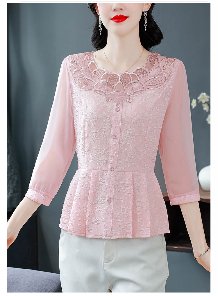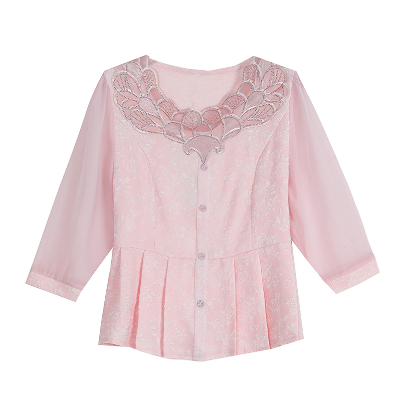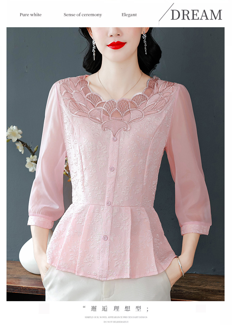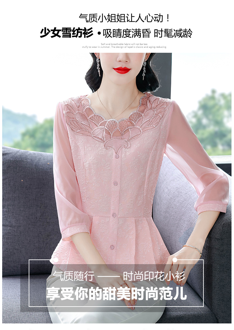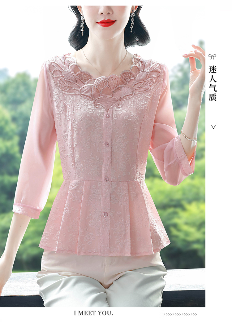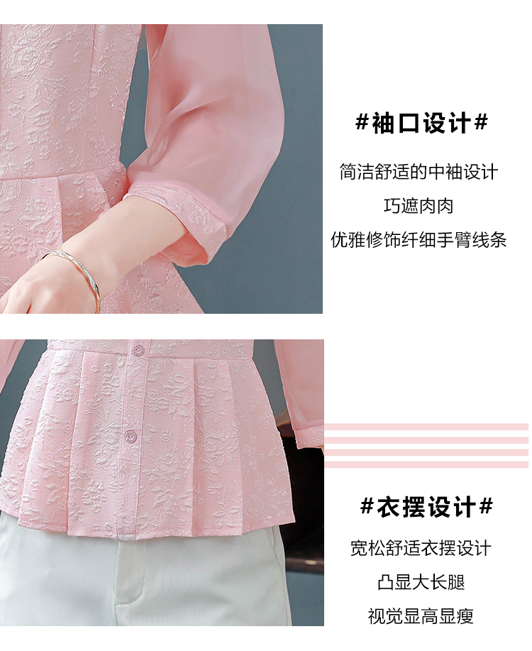 MY16247# 新款七分袖提花雪纺衫女花瓣领漂亮小衫洋气减龄遮肚子上衣女裝貨源服裝批發