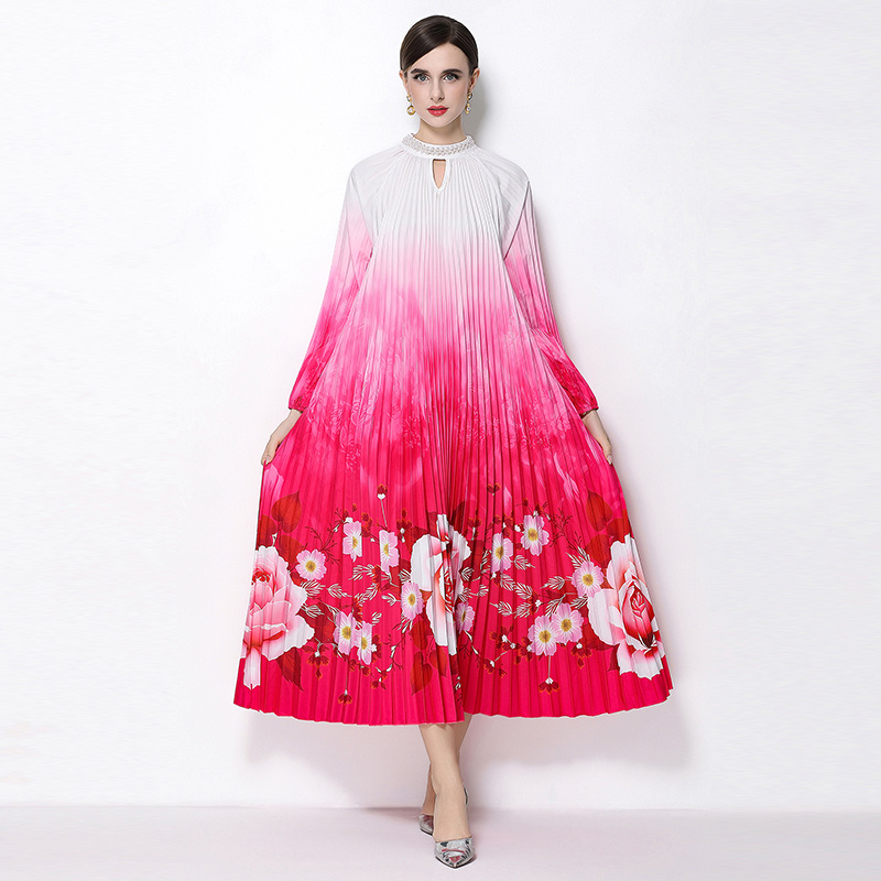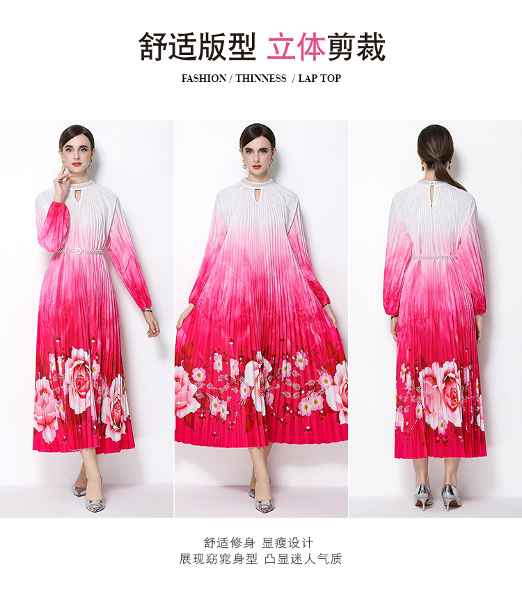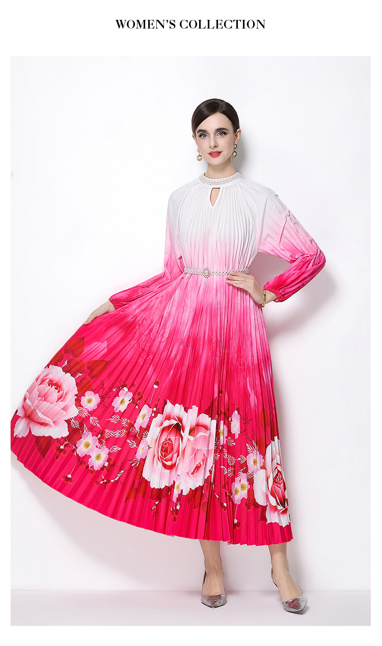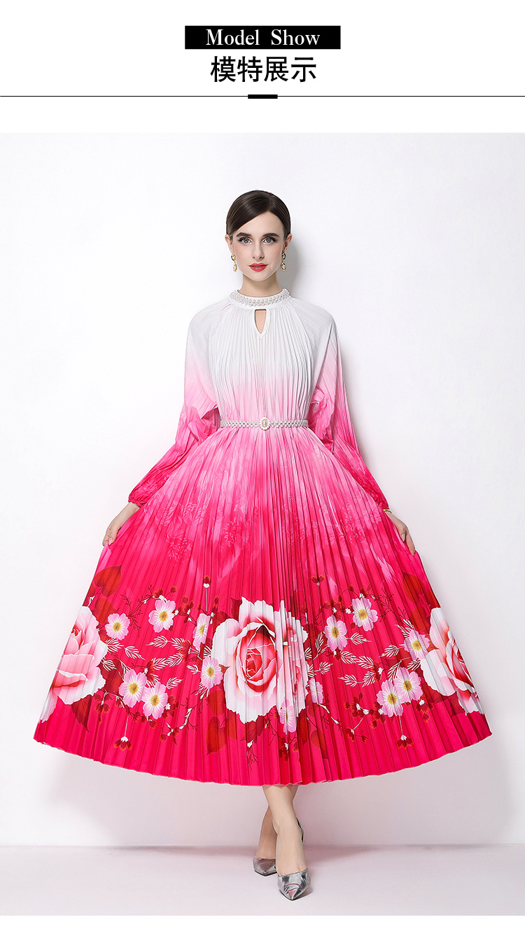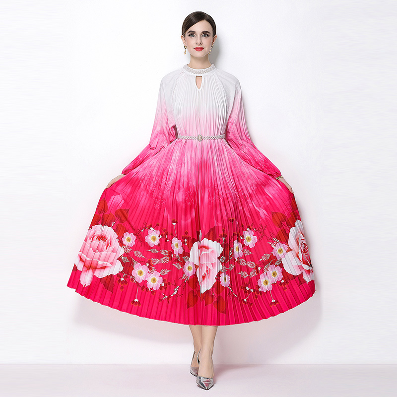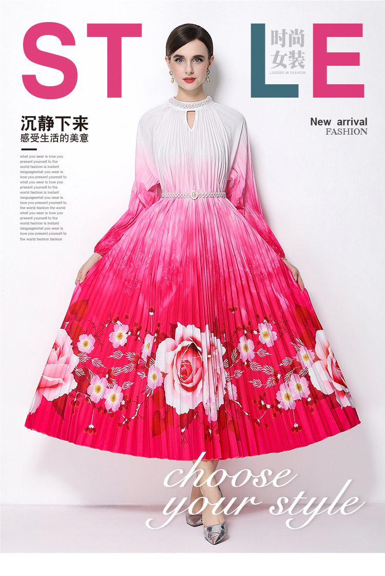 MY16256# 高端钉珠定位印花压褶珍珠扣百褶长裙女裝貨源服裝批發